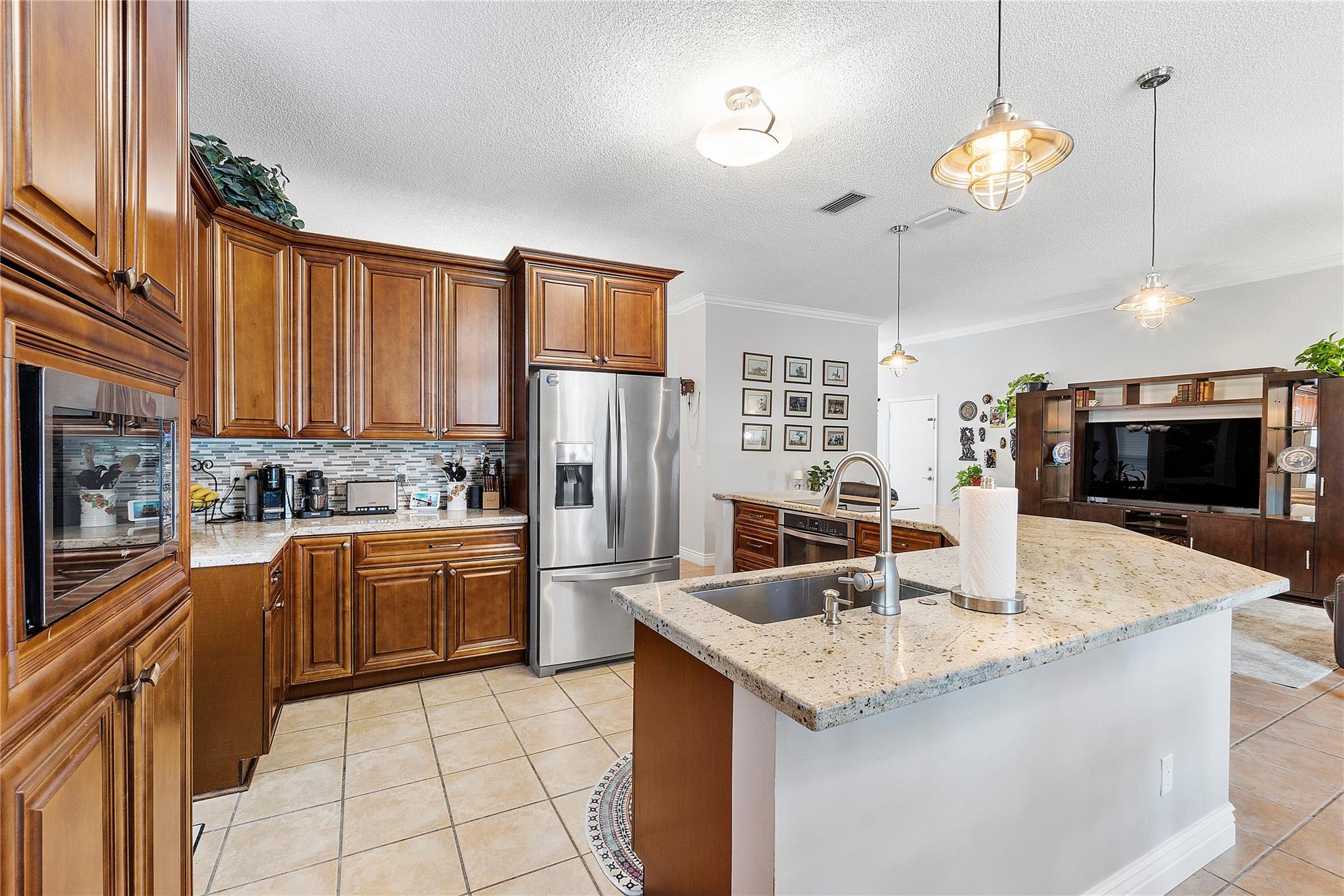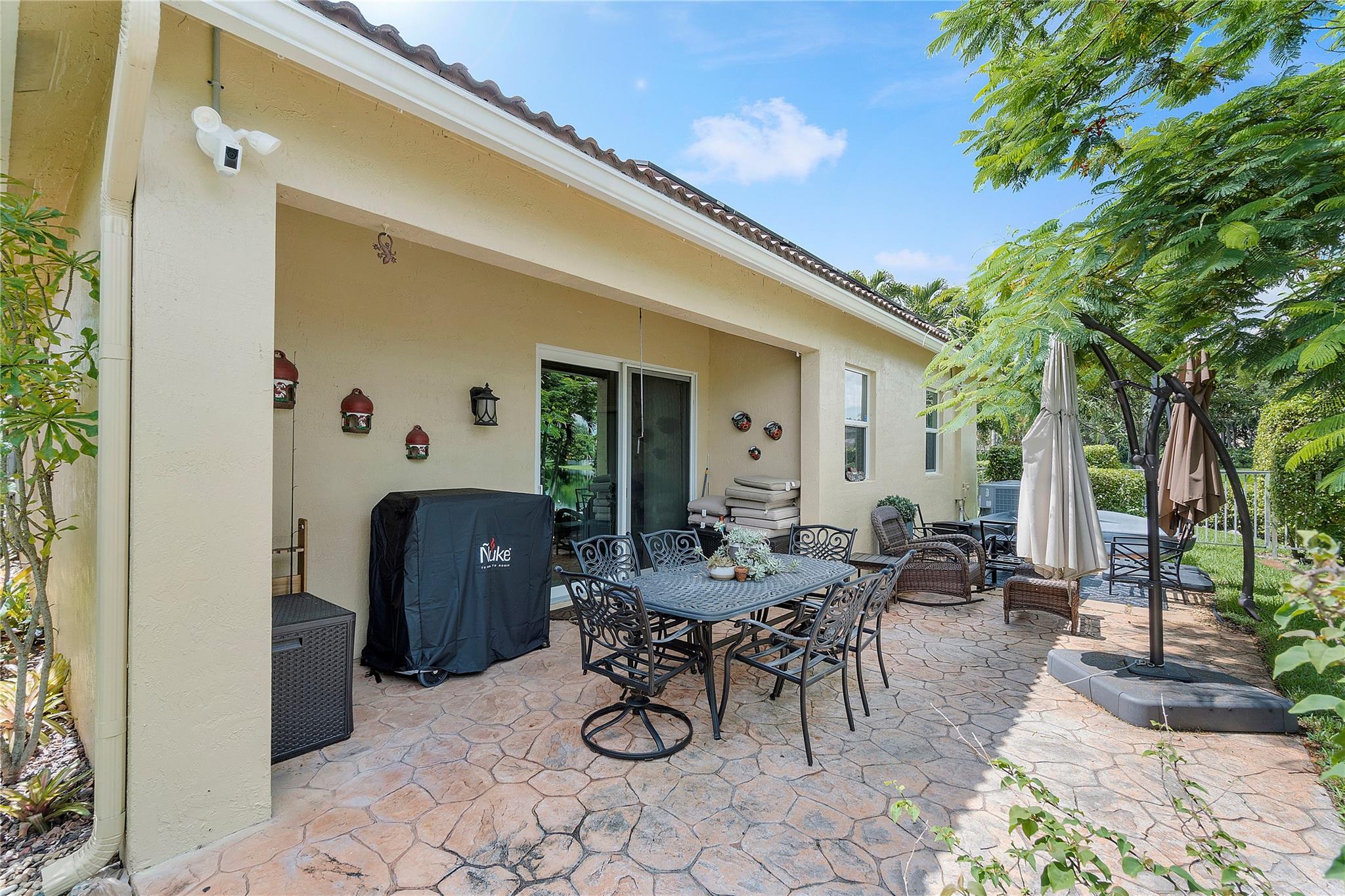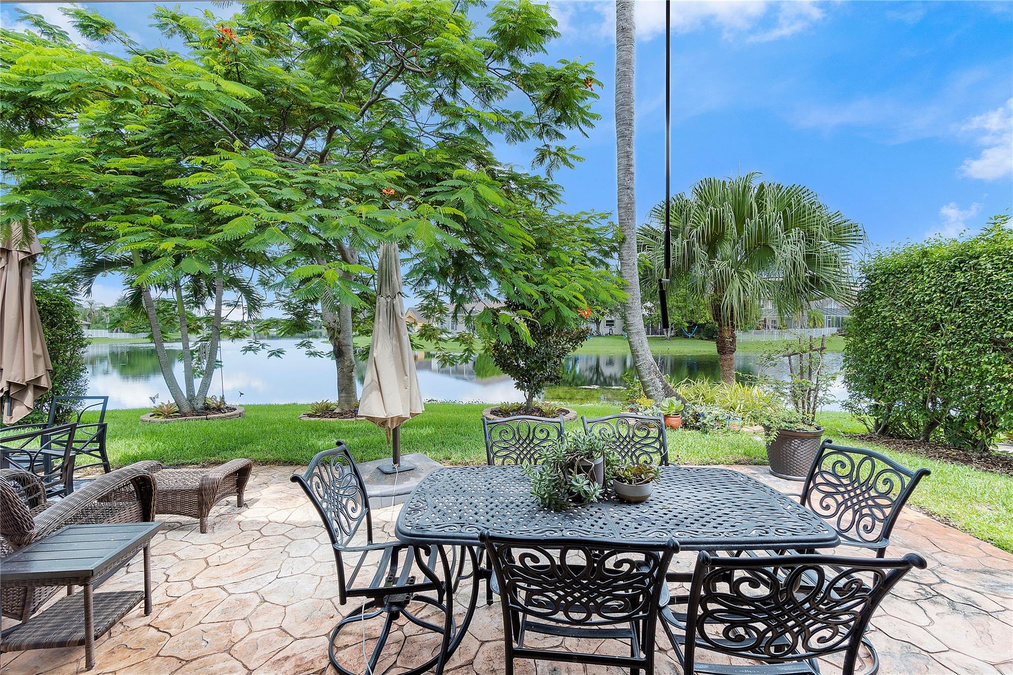Highly sought after one story 3 bedroom home on the lake with spectacular views. You will notice the impact windows and doors throughout. The open concept kitchen with the spacious island for cooking and entertaining. Kitchen updated with granite and wood cabinets and all stainless appliances. Primary bedroom with wood floors and walk in closet-with recently updated ensuite frameless shower and dual sinks. Formal dining room and two additional bedrooms with another full bathroom. The garage was recently redone with cabinets and flooring to store everyones equipment, now can we talk about the back with the extended patio. The house also has recently installed solar panels. Don't miss out on making this your home in an excellent school district and close to major roadways and shopping