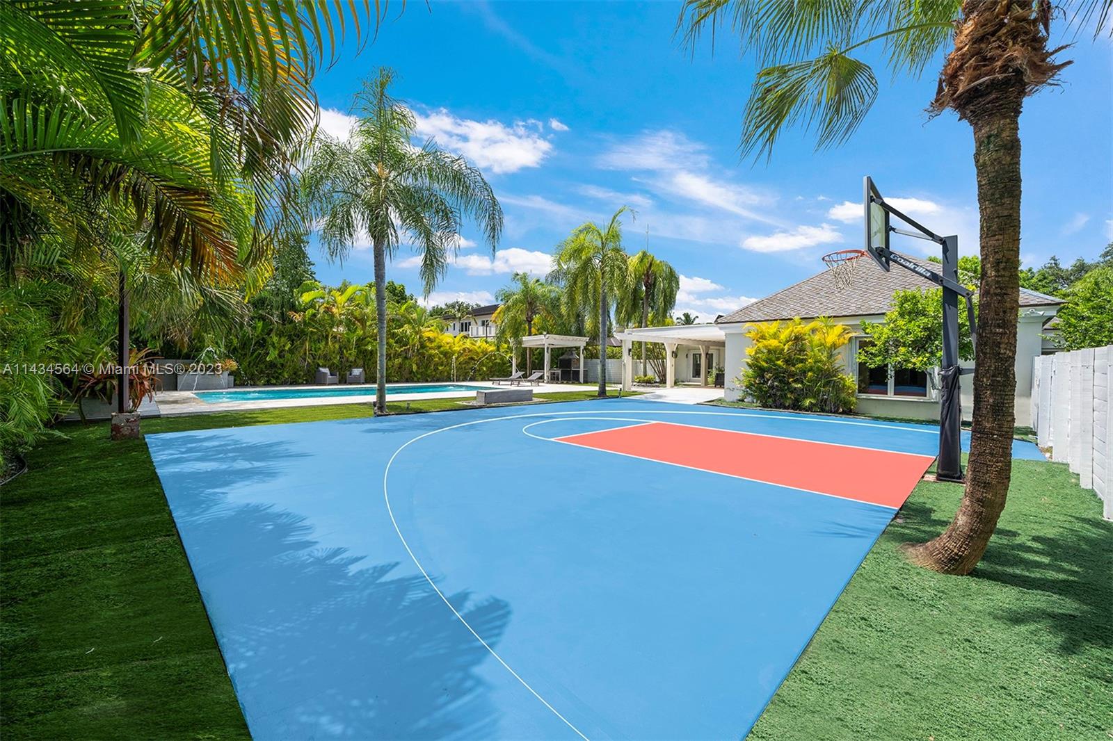 Uncover an exquisite one-story North Pinecrest gem with a half-moon basketball court. Enjoye 5 bedrooms and 4 bathrooms and sprawling entertaining spaces: formal living, dining, bar, gourmet kitchen, and a vast family room overlooking the pool. The luxurious master suite boasts a sitting area, spa-like bath, and backyard access. Outside, a serene oasis offers a covered terrace, pool, gazebo and summer kitchen. Additional features: impact windows/doors, maid’s quarters, 3-car garage, proximity to top-rated schools.