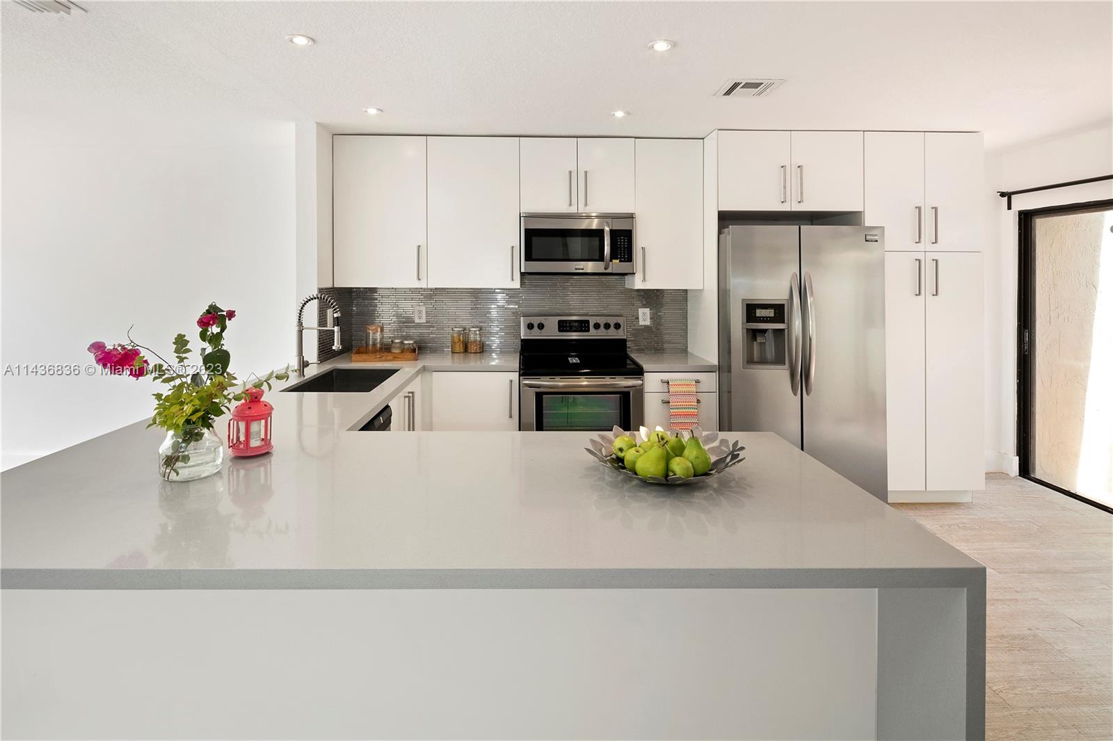 Modern three bedroom town home, this home was renovated with great materials such as hardwood flooring, ceramic tile and quartz counter tops. It also features an open kitchen and designer bathrooms. This 3 bedroom and 2.5 bath home with the garage converted to a four bedroom/office. Great gated community with a golf course, tennis courts, pool and playground.