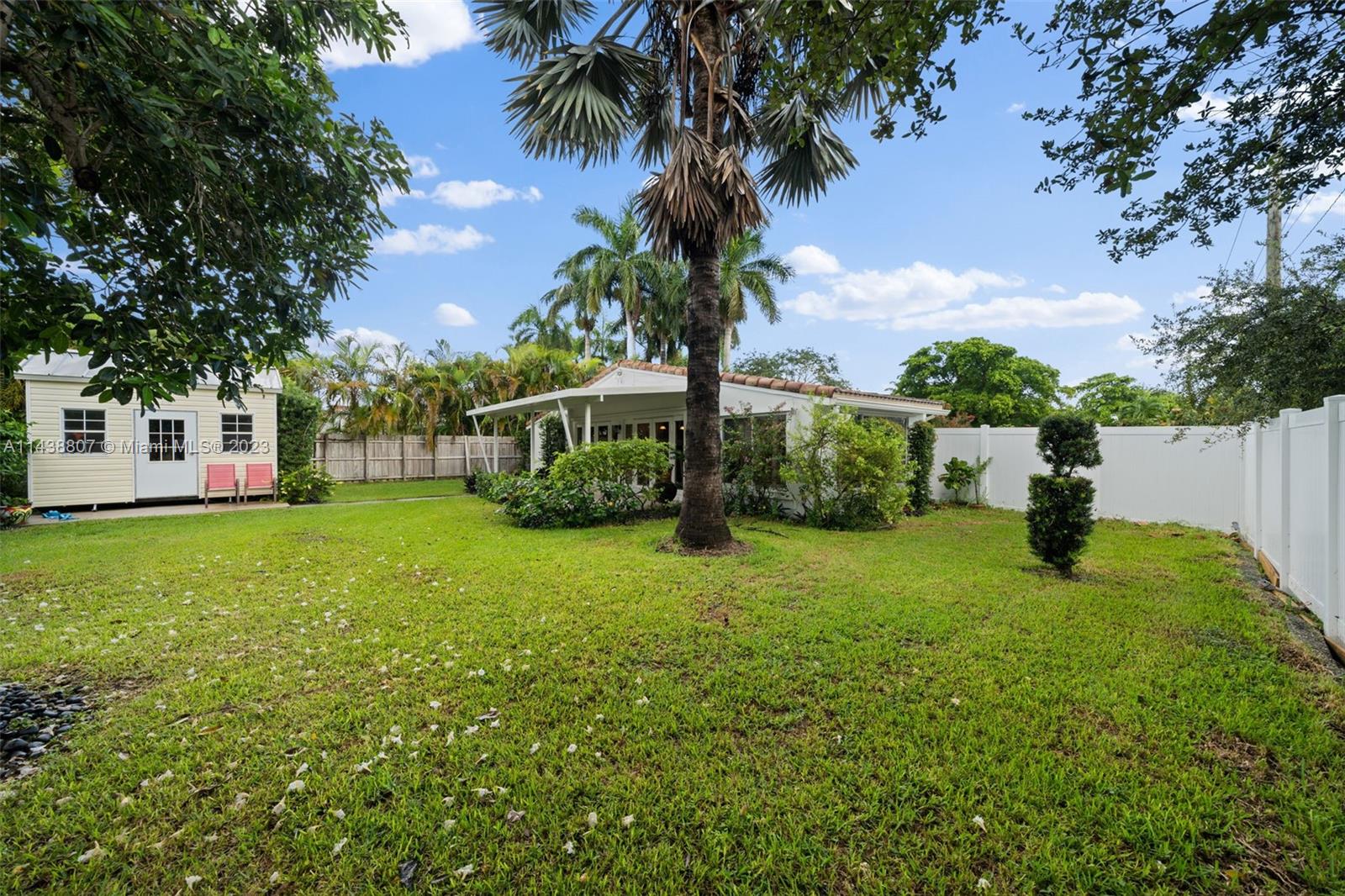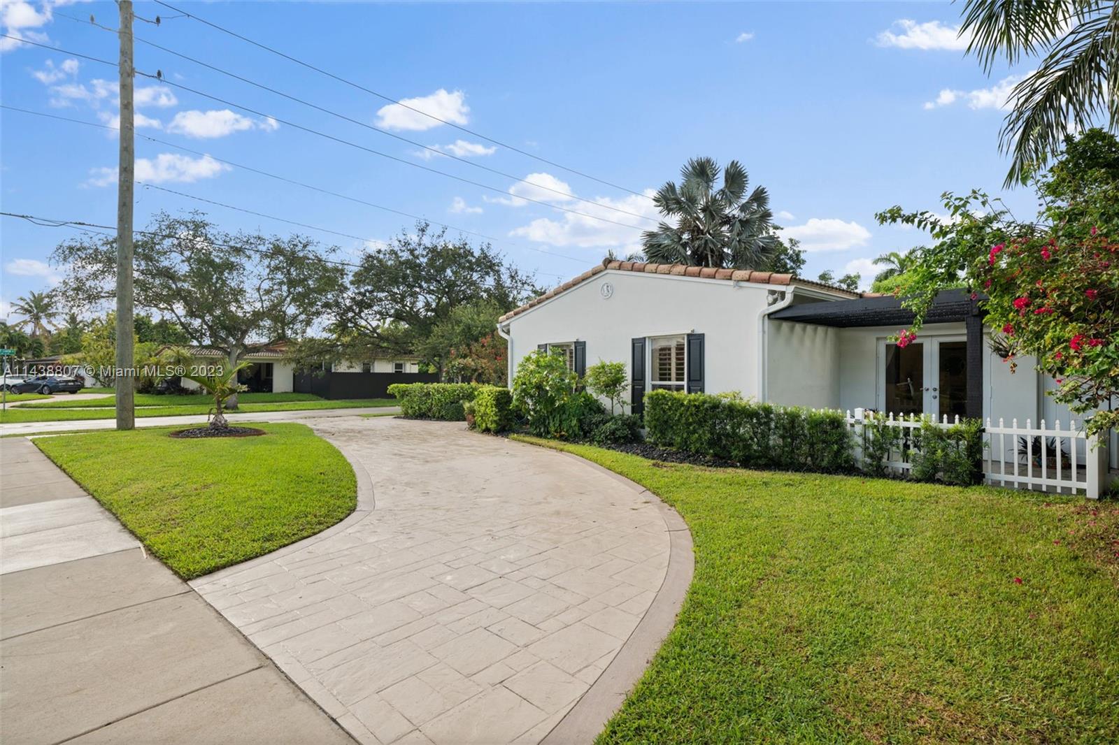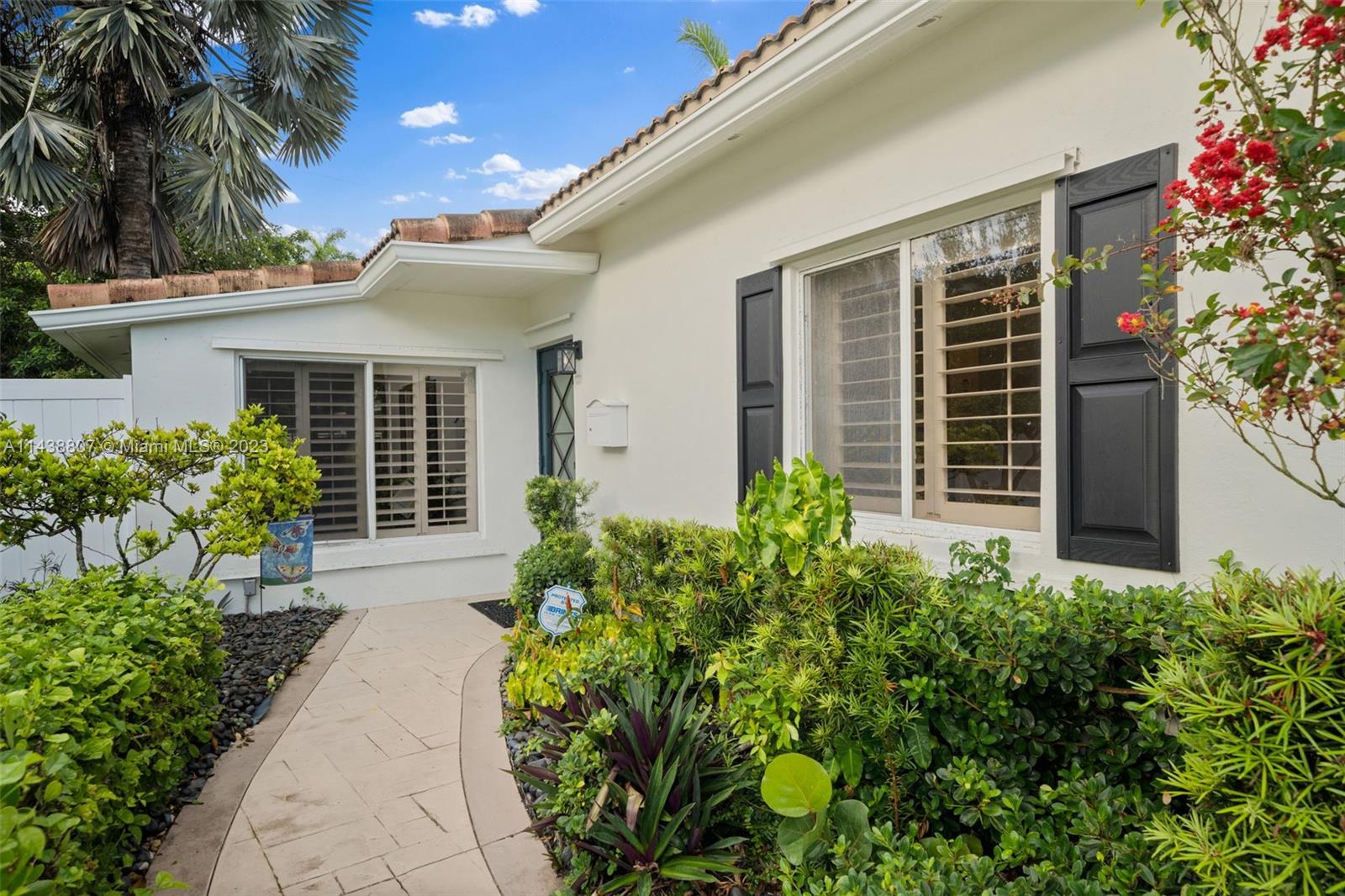 1,389 sq foot, 3-bedroom, 2-bath corner home in NE Hallandale Beach. well-maintained home with a circular driveway, a barrel tile roof, and beautiful landscaping. Once you enter this home, you will notice all the natural light through the plantation shutters and two French doors open to a covered porch overlooking the backyard with a she-shed. The primary bedroom has a full bathroom and a patio with French doors overlooking the front yard. The home is a split-bedroom floorplan with an open kitchen to the living and dining area. Other improvements are the exterior freshly painted in 2022, a new PVC fence, and beautiful landscaping. The she-shed has A/C, lighting, and two lofts, permitted on a concrete slab. Easy to show; appointment required. Attachments are included on the MLS.