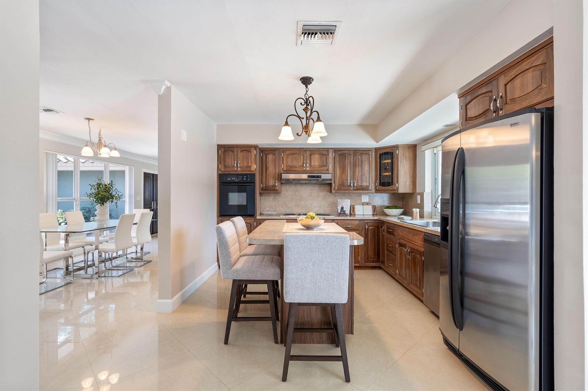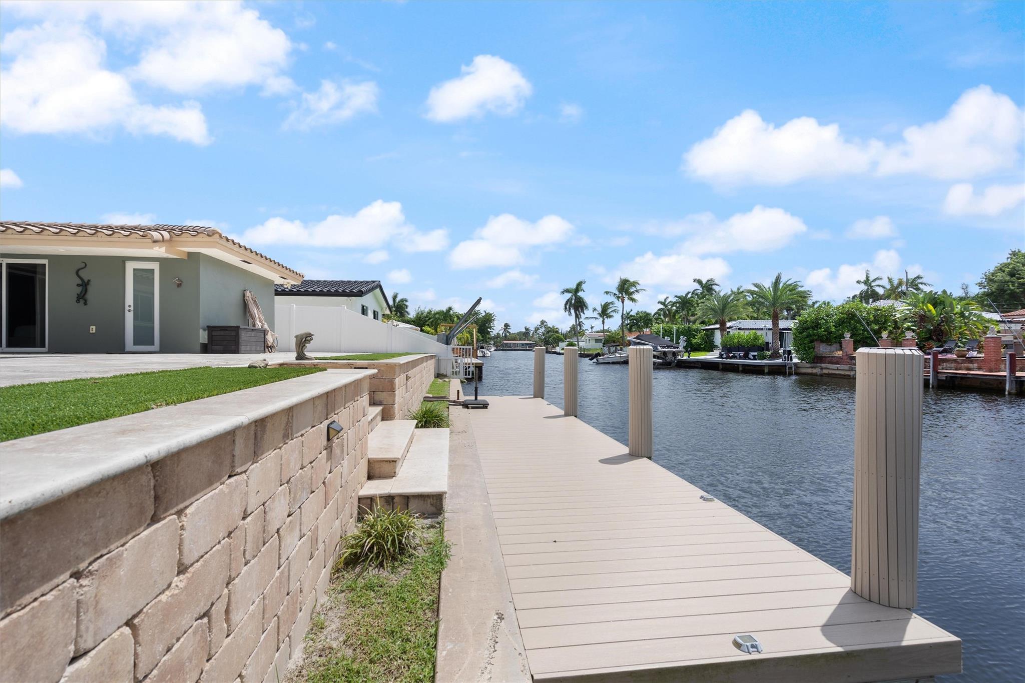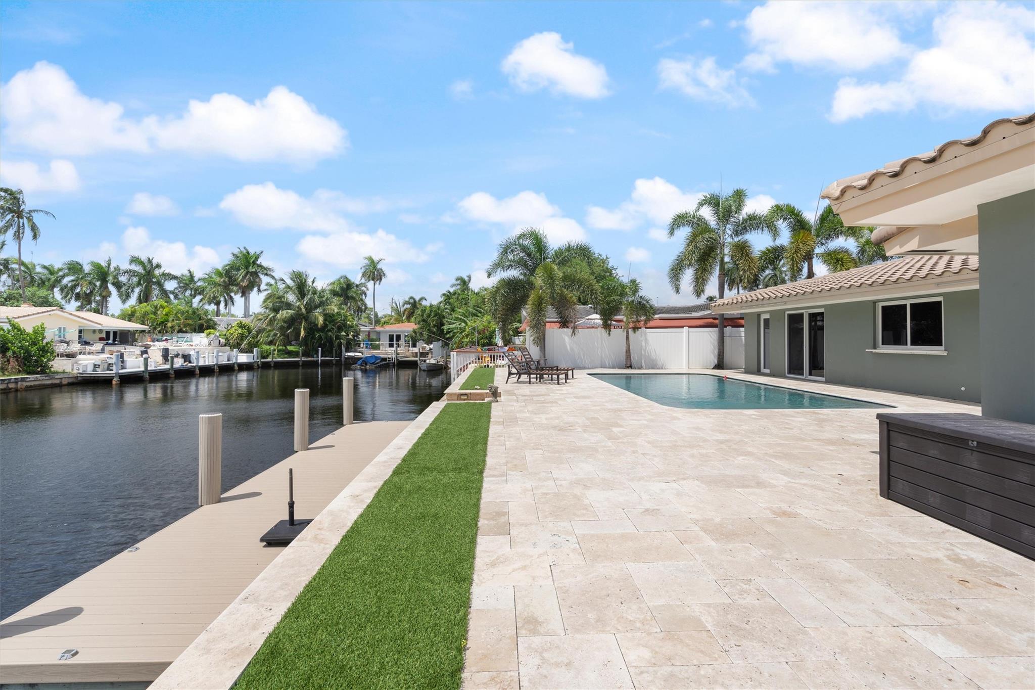 A stylishly updated pool home with ocean access waterfront. 3 bedrooms & an uncommon 3rd bathroom. Complete hurricane protection with a newer roof & all windows, doors & 2 car garage door being hurricane impact. The backyard is completely redone & upgraded. Seawall is reinforced; new dock, the pool has new River Rock, glass tile, pool pump & light fixture. New travertine pavers complete the beautiful entertaining area. Inside this lg home are ceramic tile floors, an upgraded kitchen, natural gas & adjacent pool bath, the main bedroom with new en suite bathroom & walk-in closet. The living areas were freshly painted, very lg pantry-laundry room with new washer & dryer. You’ll find this home resides on a lovely tree-lined, culdesac with sidewalks & gorgeous sunsets.