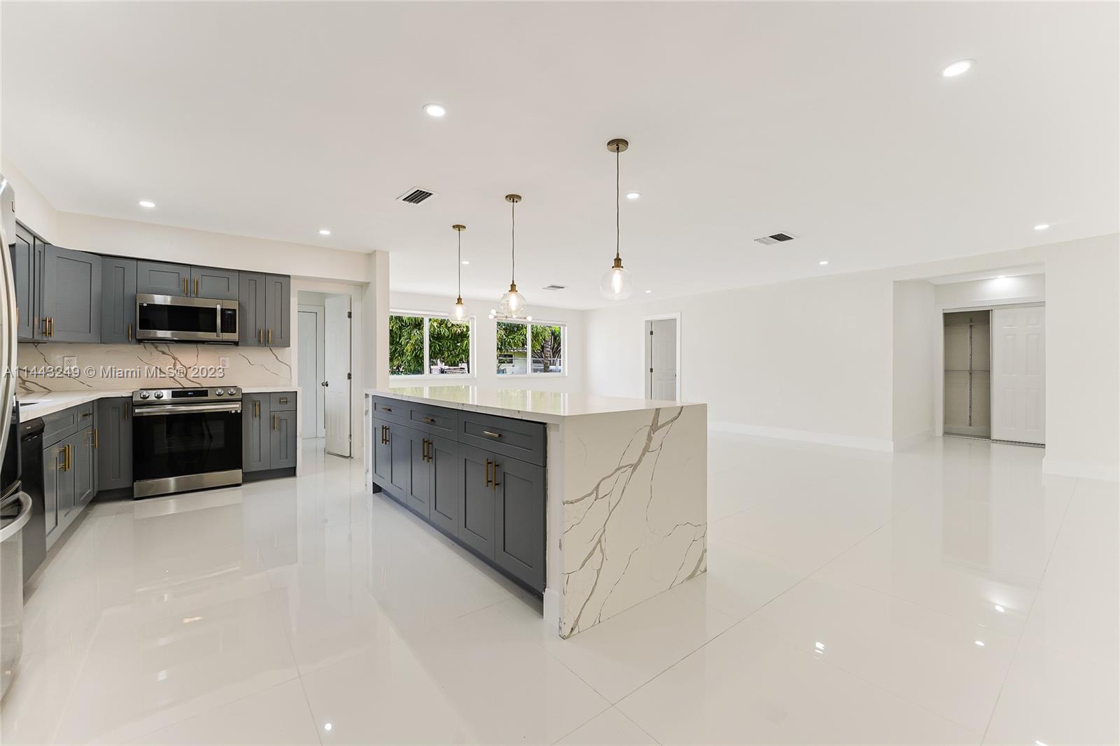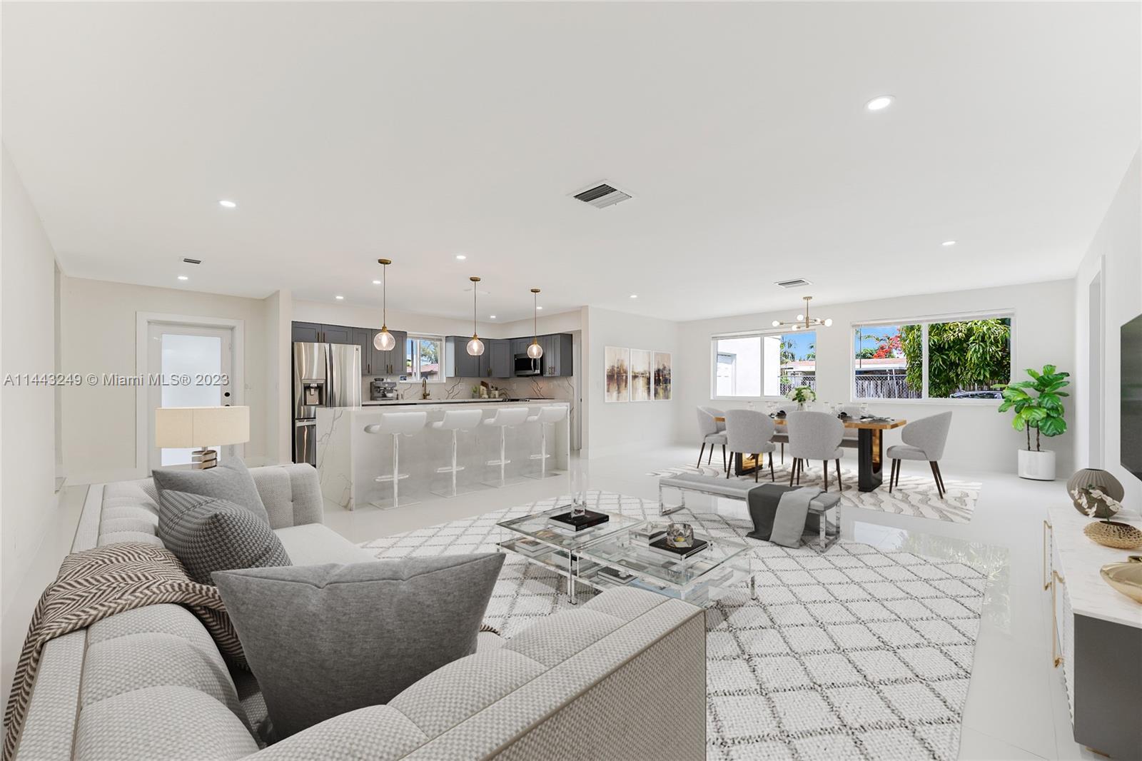 TURN-KEY OVERSIZED 4-BED/ 2-BATH HOUSE IN THE MOST CONVENIENT AND PRIME LOCATION! With almost 1900 sqft of living area, this house has been stylishly remodeled featuring a long list of upgrades including BRAND NEW 2023 ROOF, impact-proof windows and doors throughout, new porcelain and tile flooring, stylish kitchen with grey wood cabinetry, quartz countertops, and stainless steel high-end appliances, full washer and dryer in separate laundry room, one-of-a-kind bathrooms, closet cabinetry, 1-spot covered parking garage, and much more. Sitting on an extensive 9,300+ corner lot, this house has more than enough room to fit a pool and is perfect for entertaining. PERFECT LOCATION WITHIN 10 MINUTE DRIVE FROM THE BEACH, NEARBY TOP SCHOOLS, PARKS, SHOPS, AND MORE.