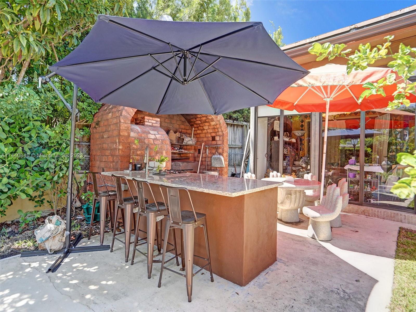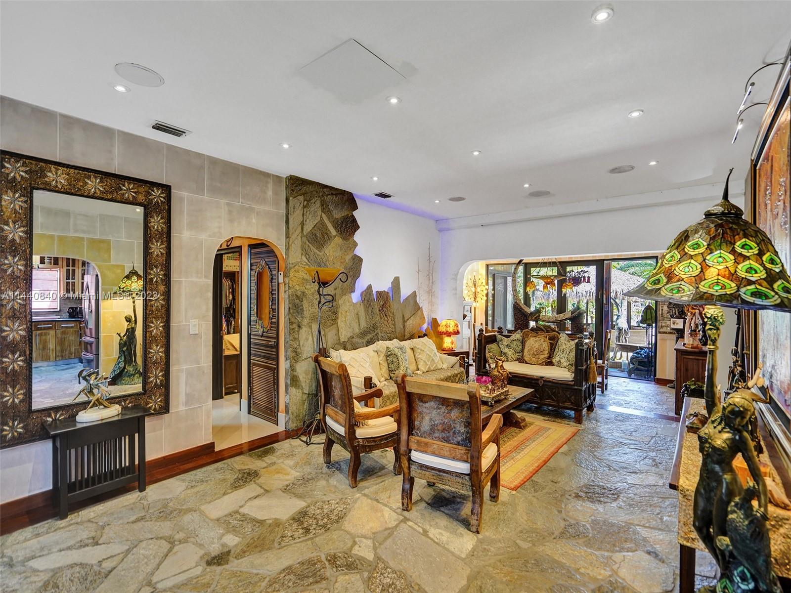 Unbelievably sought after Biscayne Point 60 ft waterfront smart home with 9ft ceilings, boatlift and only 1 bridge to the bay & ocean! Mid-Century Villa meets Moroccan Mosaic flair! Over $500K in renovations include impact windows, Bamboo kitchen, all 4 ensuite baths, full home theater projection & sound system, porcelain & field stone floors, custom solid wood doors, & electrical hurricane shutters, sprinklers & up lighting. Entertainers delight in your tropical oasis with covered tiki hut for 10 people, dining table, outdoor summer kitchen with BBQ, pizza oven. Investors will love the studio efficiency rented at $1,800 per month or use it as a guest, in-law or teenager suite! Brand new roof being installed with the potential to add 1250 sft of rooftop pleasure! All furniture negotiable.