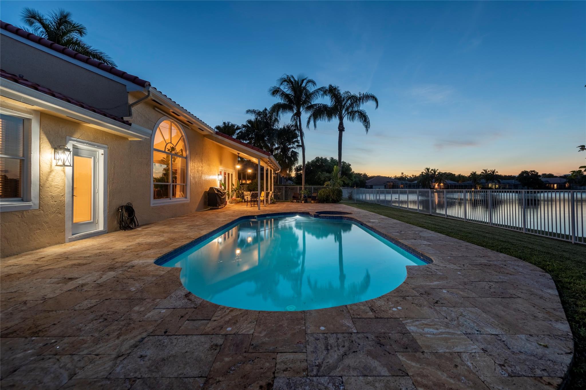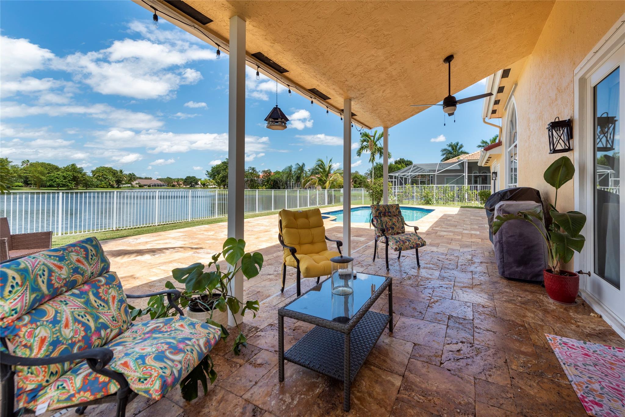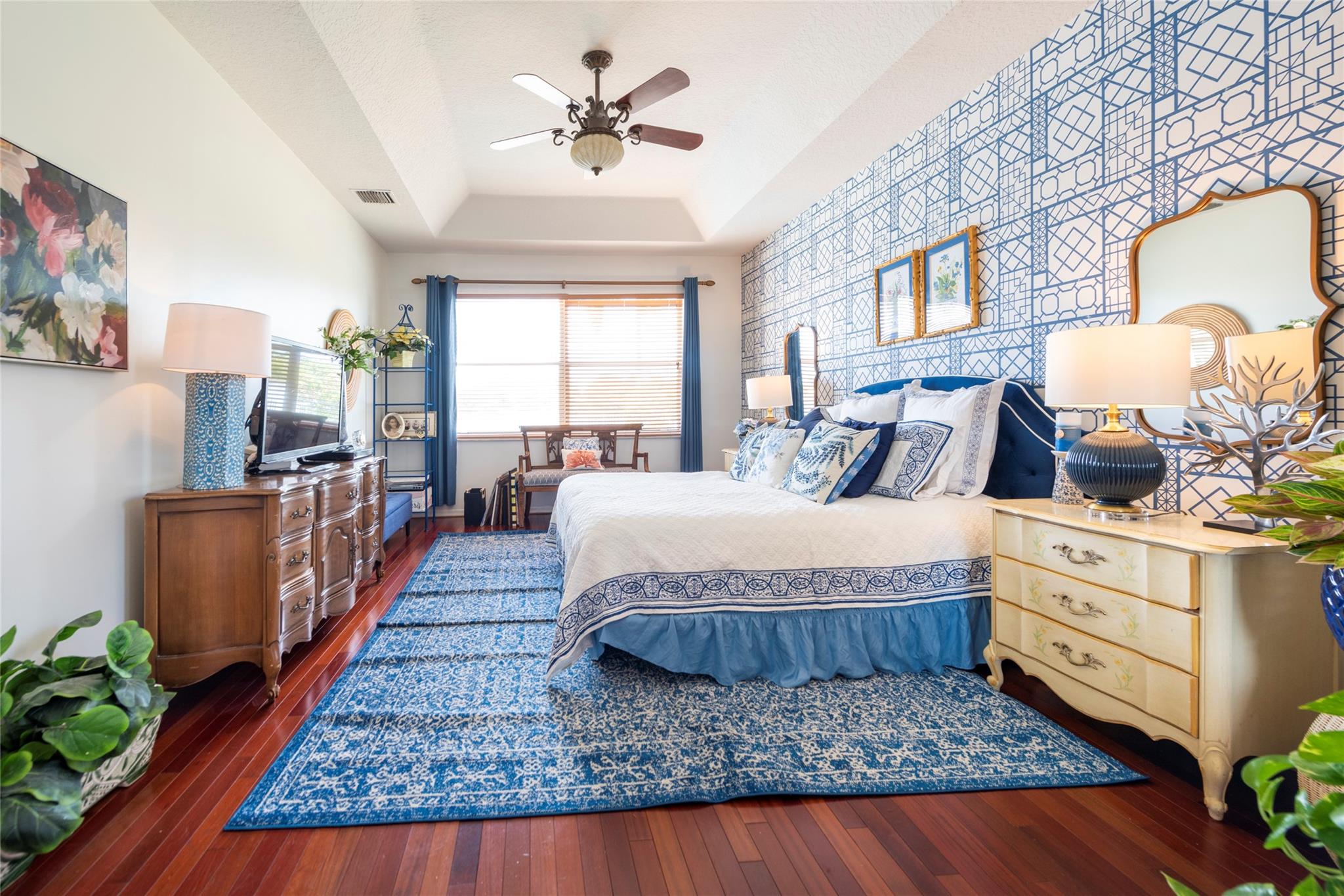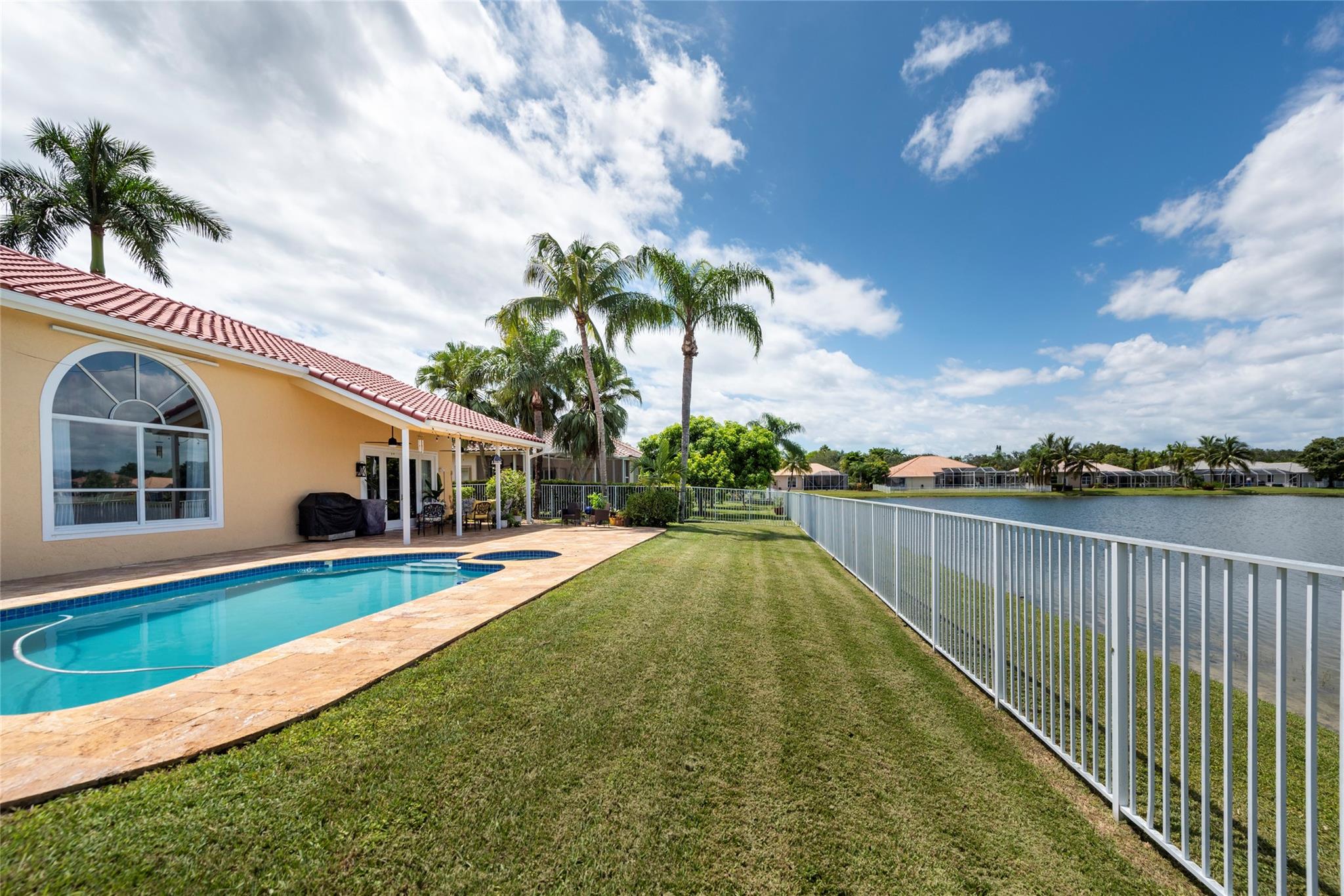 Beautiful 2-story lakefront home WITH PRIMARY BEDROOM SUITE DOWN...NEW ROOF IN 2023. This 5-bedroom, 4-bath, 3-car, Catalina model is rarely available. Large family & living rooms. Stunning, upgraded hardwood kitchen, stainless appliances w/double ovens, granite countertops & cooking island highlight this chef's delight. An executive office (or additional bed) downstairs & a full cabana bath adds versatility to this wonderful model. The split-level upstairs features 3 additional bedrooms, 2 more full baths & a study-loft, making for a perfect kid's retreat. All this coupled with an expansive fenced backyard & lakeside pool/spa. Premium gated community with all "A" schools.