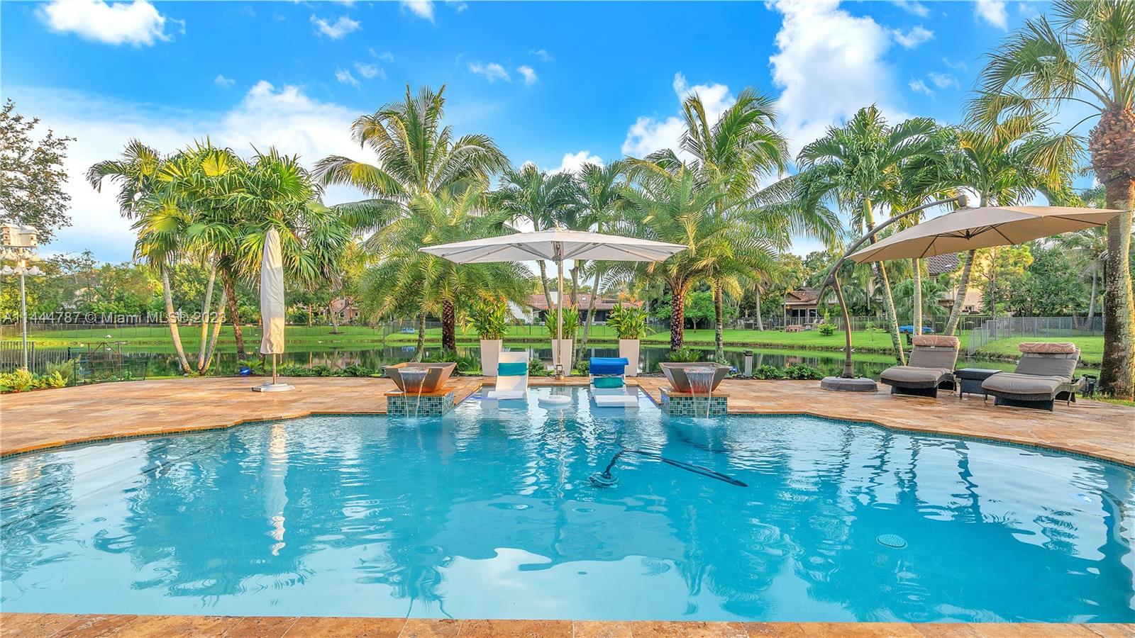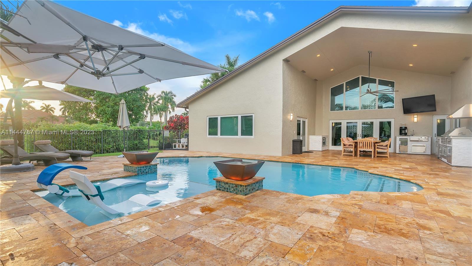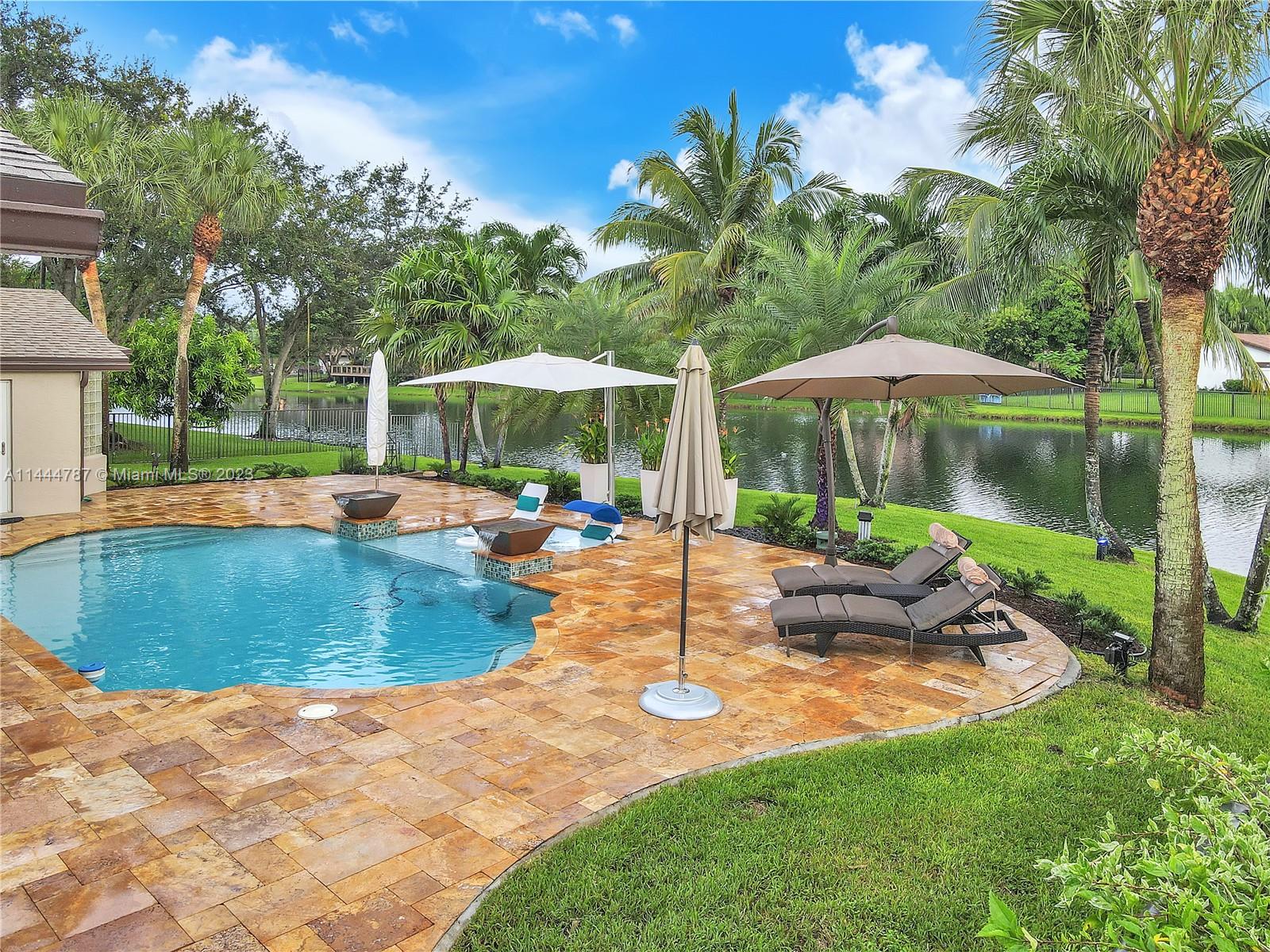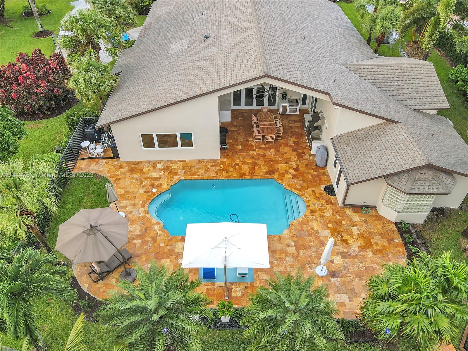 Whispering Pines Stunning Contemporary 5-bedroom/3.5 bath home overlooking a lake on a Builders Acre. This is an Entertainer's Dream! Immaculate home features lush landscaping & outdoor paradise. RESORT style POOL w/heater. AMAZING NEW OUTDOOR Kitchen w/icemaker, refrigerator, warming drawer and more!. UPDATED GOURMET KITCHEN w/quartz counters & marble backsplash featuring THERMADOR Appliances, Miele built-in coffee machine. IMPACT WINDOWS. Marble floors in the main living areas & Hardwood floors in the Bedrooms. OVERSIZE Primary BR overlooking the pool. Ensuite w/ dual vanities & spa-like bath, His & Her walk-in closets. One BR converted to a home gym with 16' RockClimbing Wall! Split plan for one Bedroom with access to full bath. Perfect for Guests! Too many upgrades to mention!