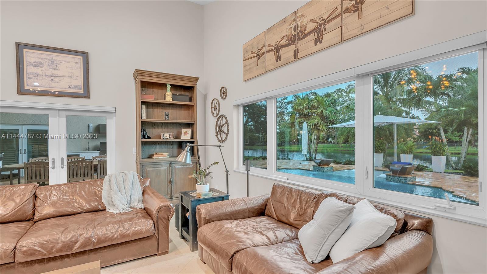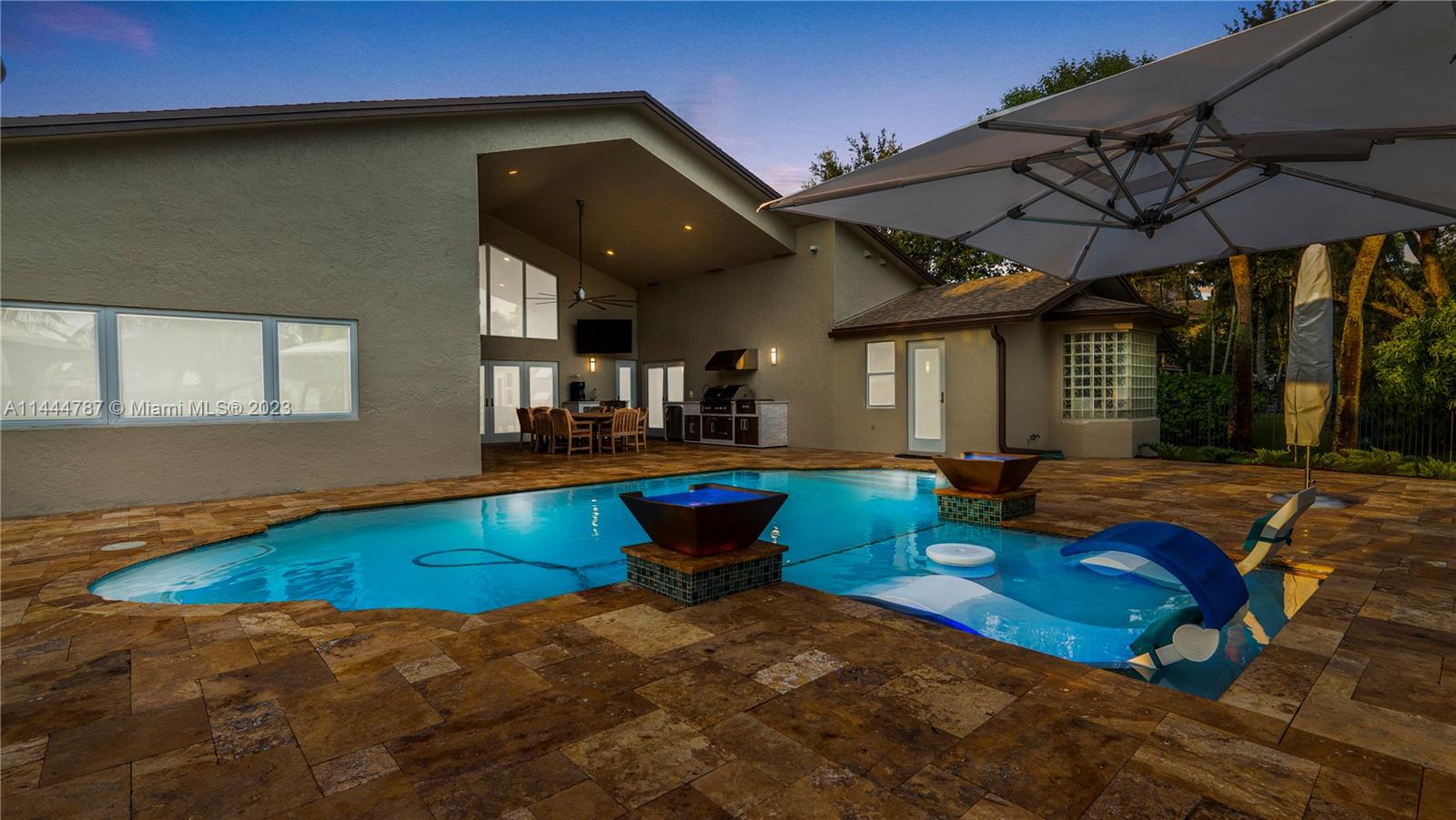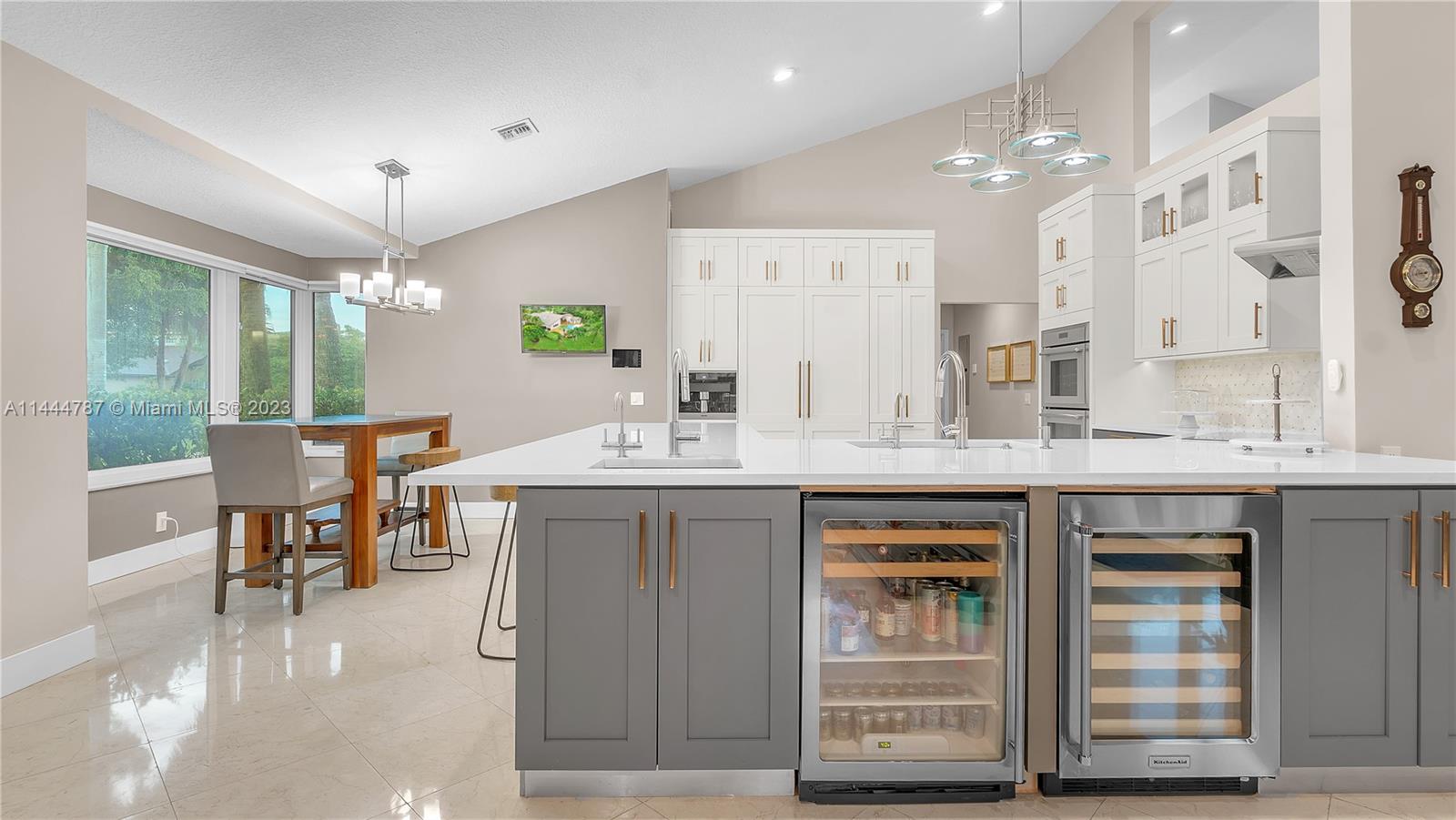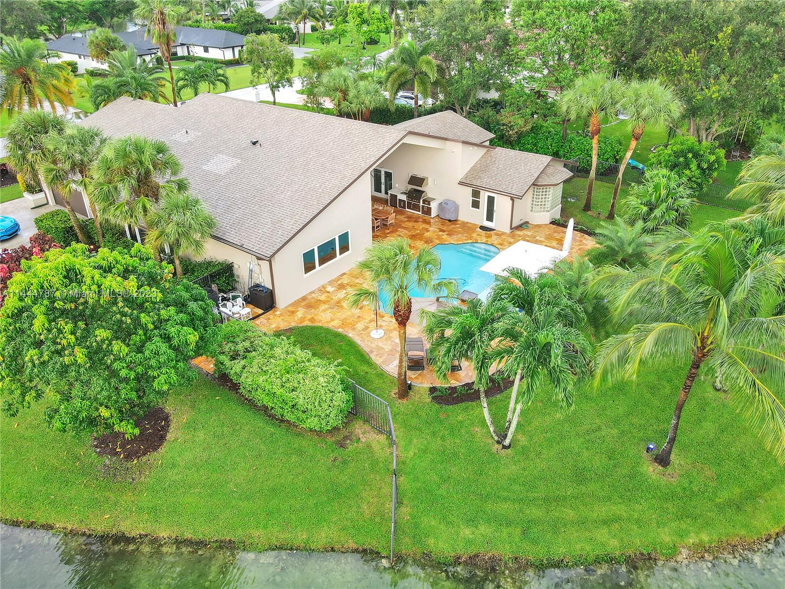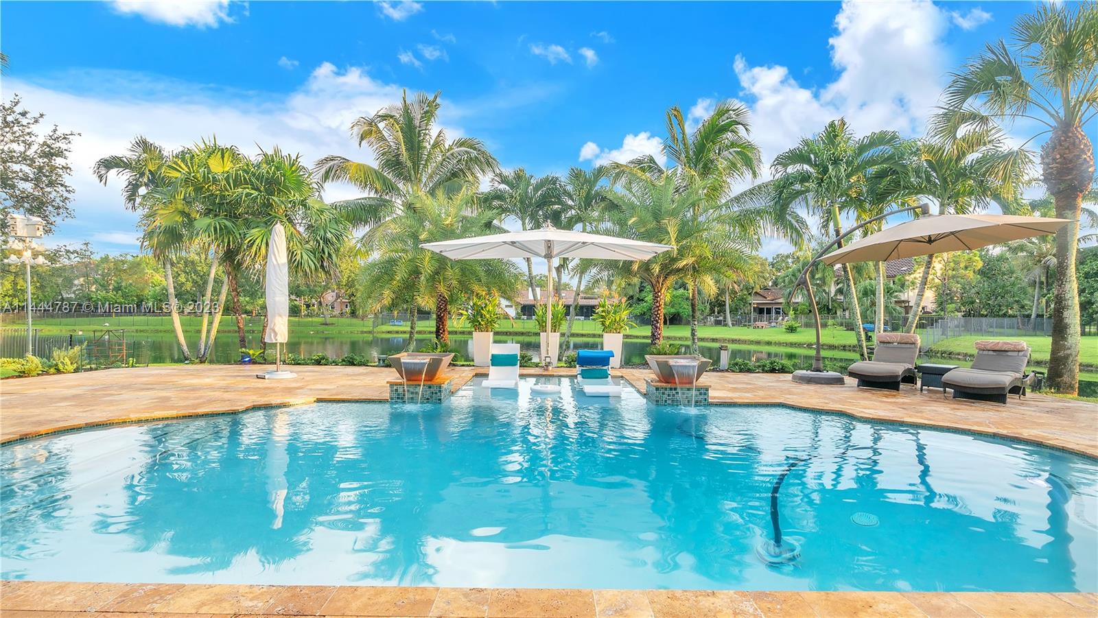 Whispering Pines Stunning Contemporary 5-bedroom/3.5 bath home overlooking a lake on a Builders Acre. This is an Entertainer's Dream! Immaculate home features lush landscaping & outdoor paradise. RESORT style POOL w/heater. AMAZING NEW OUTDOOR Kitchen w/icemaker, refrigerator, warming drawer and more!. UPDATED GOURMET KITCHEN w/quartz counters & marble backsplash featuring THERMADOR Appliances, Miele built-in coffee machine. IMPACT WINDOWS. Marble floors in the main living areas & Hardwood floors in the Bedrooms. OVERSIZE Primary BR overlooking the pool. Ensuite w/ dual vanities & spa-like bath, His & Her walk-in closets. One BR converted to a home gym with 16' RockClimbing Wall! Split plan for one Bedroom with access to full bath. Perfect for Guests! Too many upgrades to mention!