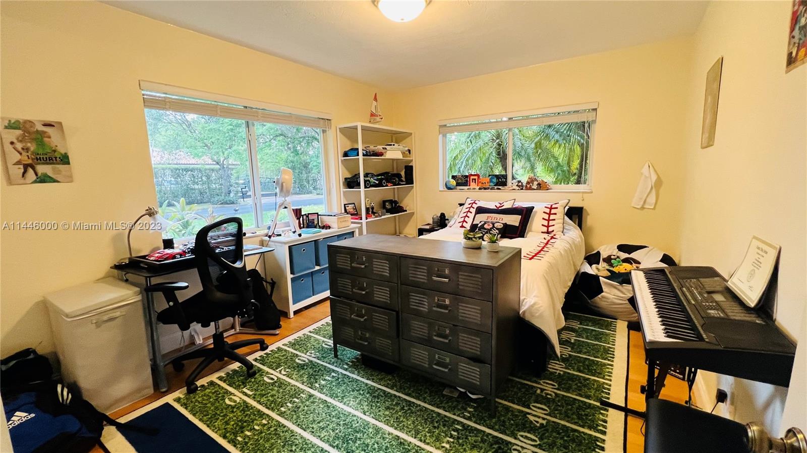 Perfect family home in North Pinecrest on a quiet, family friendly street. Excellent school district and nearby parks. 5 bedrooms with wood floors and marble in living areas. Beautiful kitchen and baths and well maintained. French doors wrap around covered patio overlooking pool and landscaped yard in a private setting. Impact windows, accordions and generator hook-up.