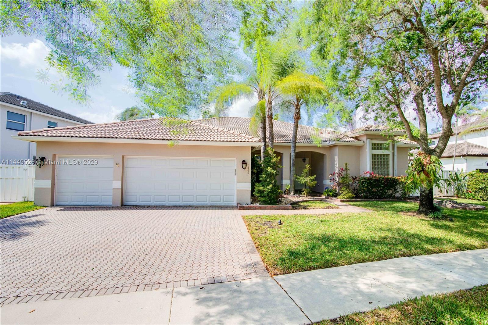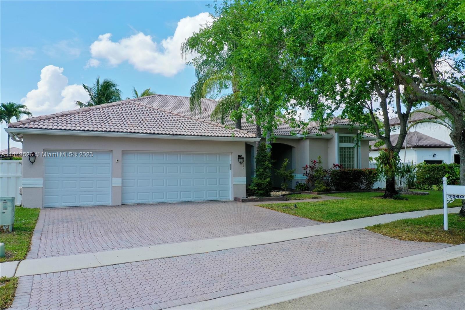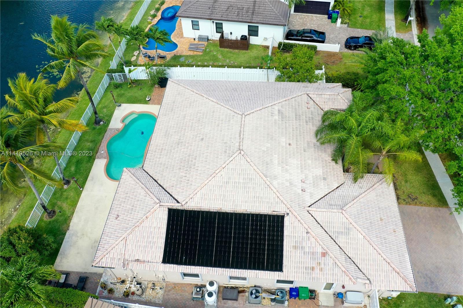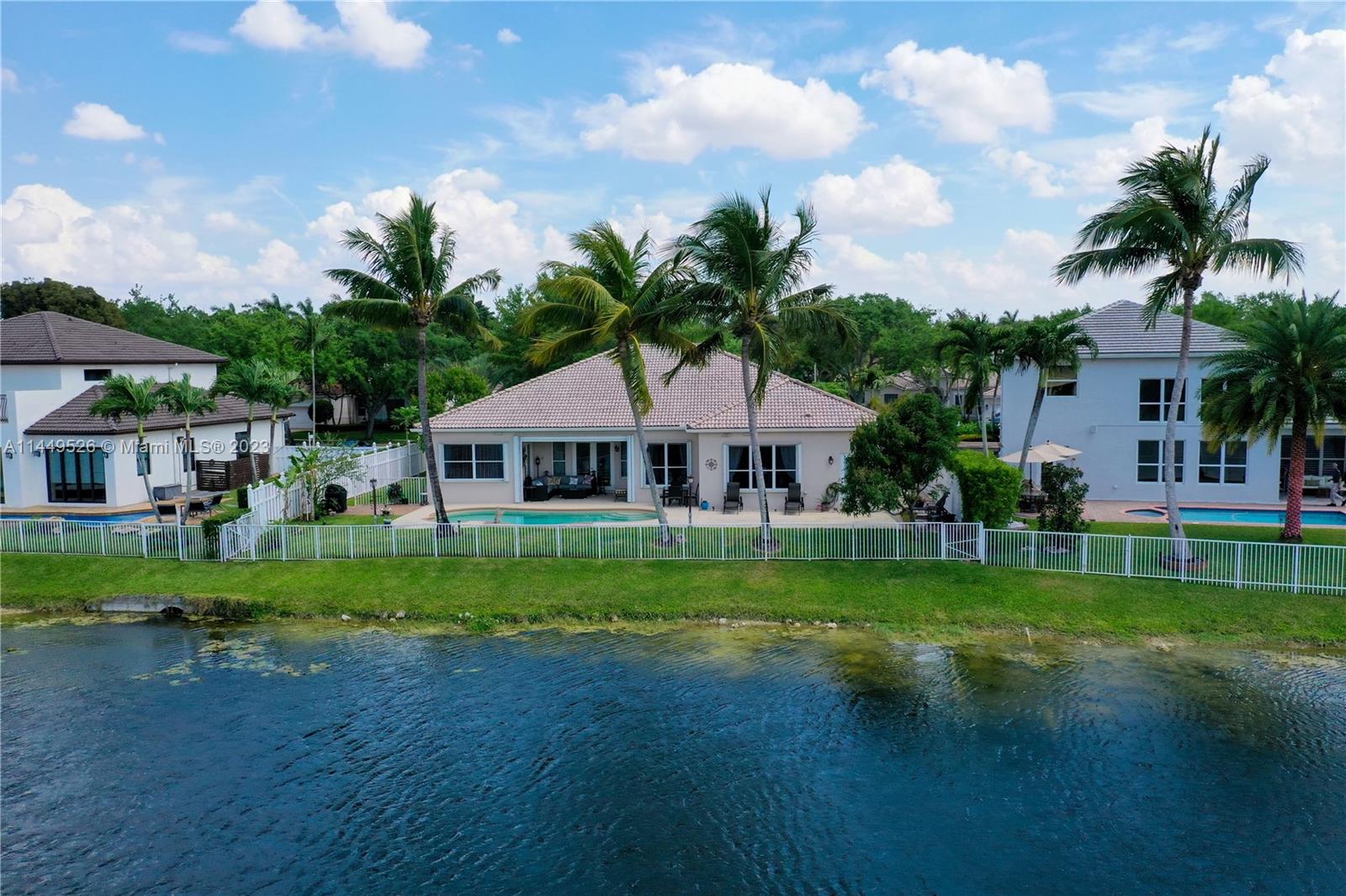 Amazing 4 Bed/3 Bath home located in the gated community of Windsor Palms. Enjoy beautiful lake views, heated swimming pool in a fenced backyard with 2 mango trees. One of the baths is connected to the pool patio. Primary Bath has dual vanities and sinks, bidet, separate tub and shower. This home includes a full house generator, solar panels to heat the pool and home theater system installed in family room. One room converted into home office with floor to ceiling wood bookcase. Stainless steel kitchen appliances (double oven) and granite counter tops, ceramic tile through out the home. 3 car garage, the doors replaced in 2023, Accordion shutters, Electric Porch Awning, Water Heater in 2020, Plumbing replaced in the home 2022.
