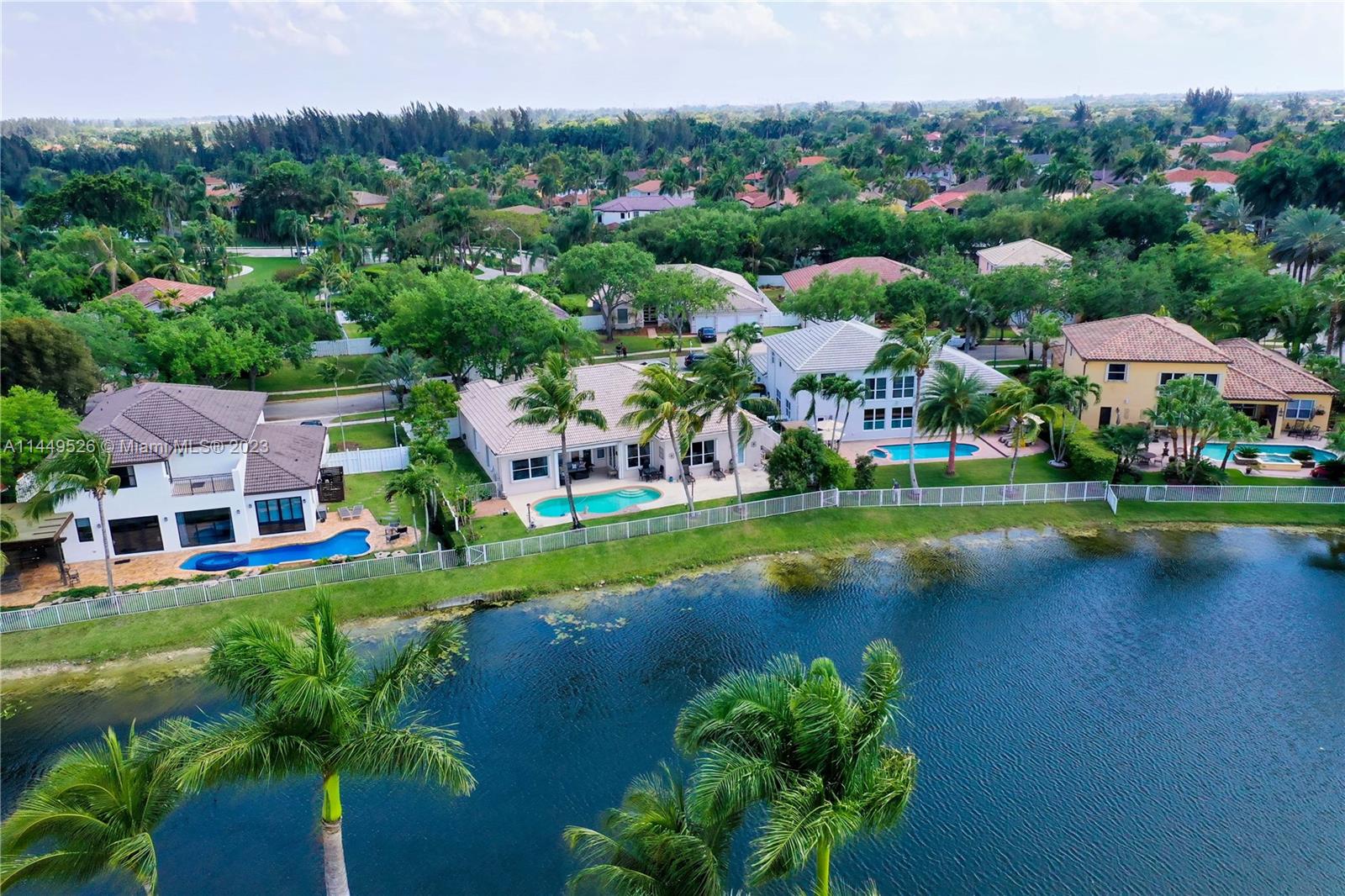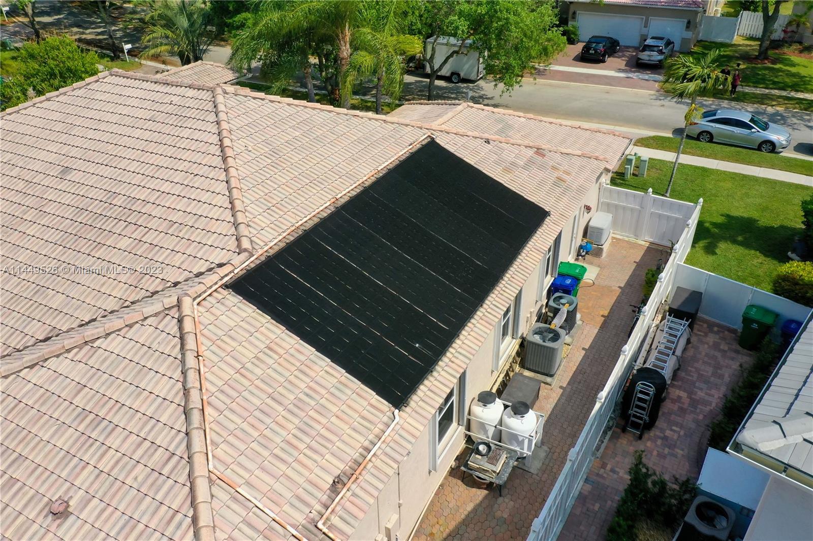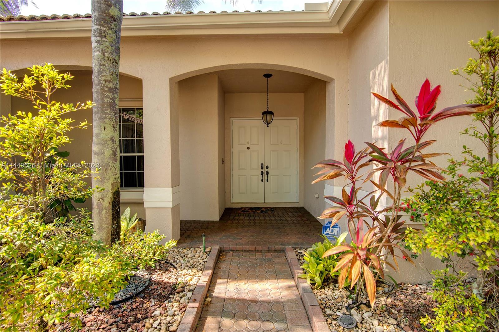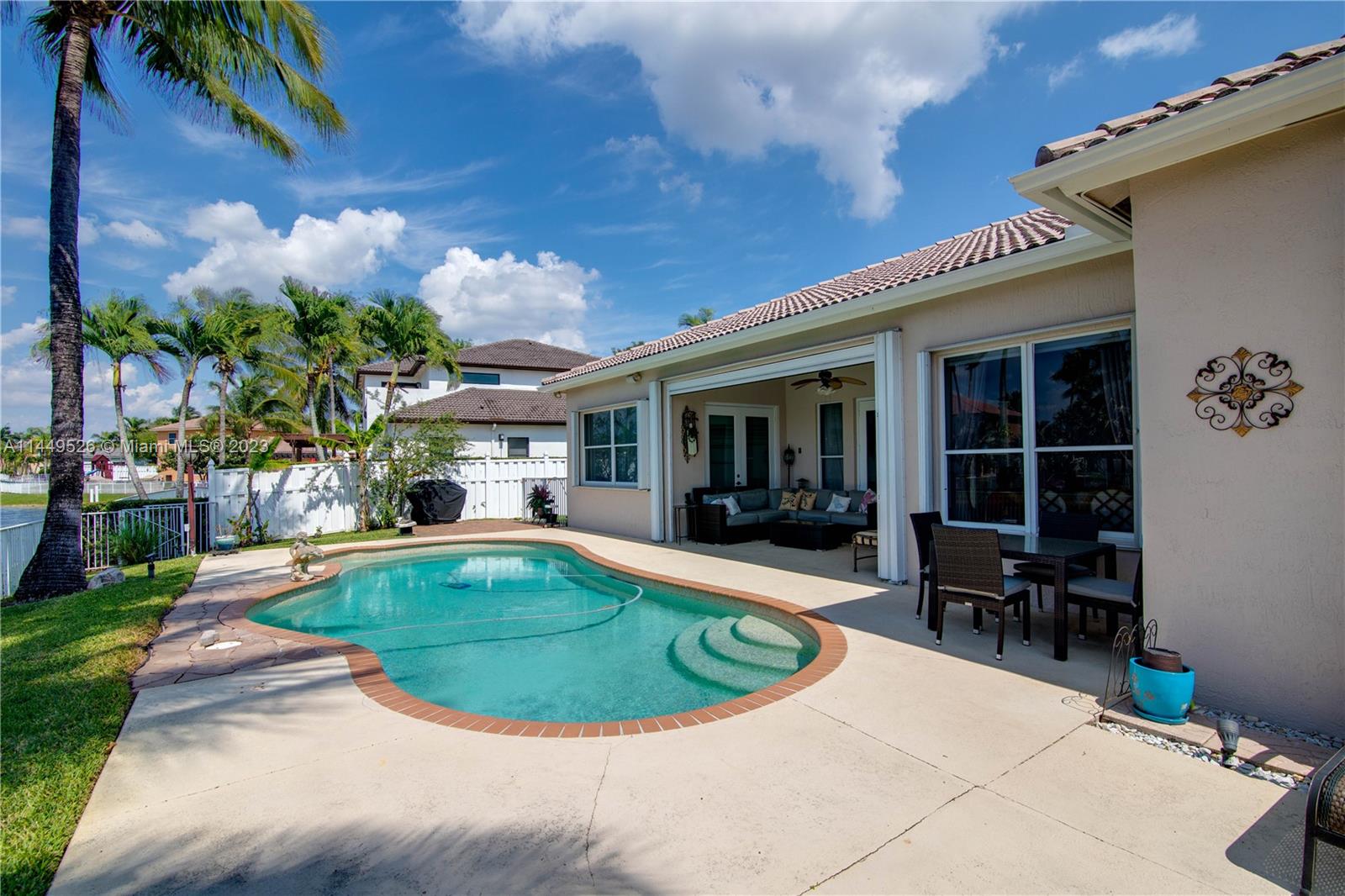 Amazing 4 Bed/3 Bath home located in the gated community of Windsor Palms. Enjoy beautiful lake views, heated swimming pool in a fenced backyard with 2 mango trees. One of the baths is connected to the pool patio. Primary Bath has dual vanities and sinks, bidet, separate tub and shower. This home includes a full house generator, solar panels to heat the pool and home theater system installed in family room. One room converted into home office with floor to ceiling wood bookcase. Stainless steel kitchen appliances (double oven) and granite counter tops, ceramic tile through out the home. 3 car garage, the doors replaced in 2023, Accordion shutters, Electric Porch Awning, Water Heater in 2020, Plumbing replaced in the home 2022.