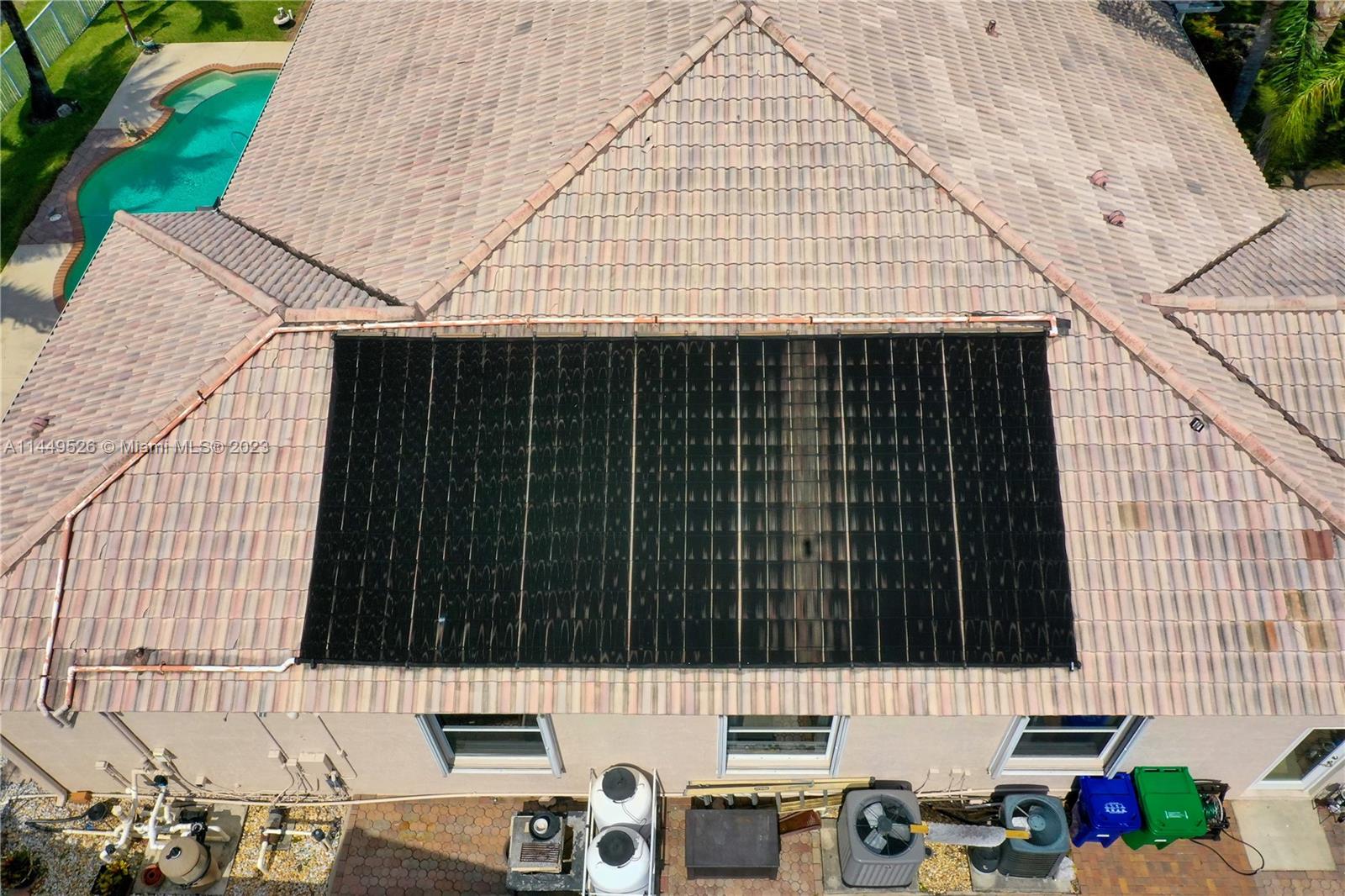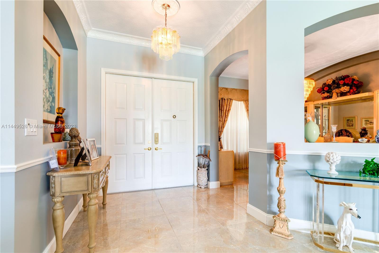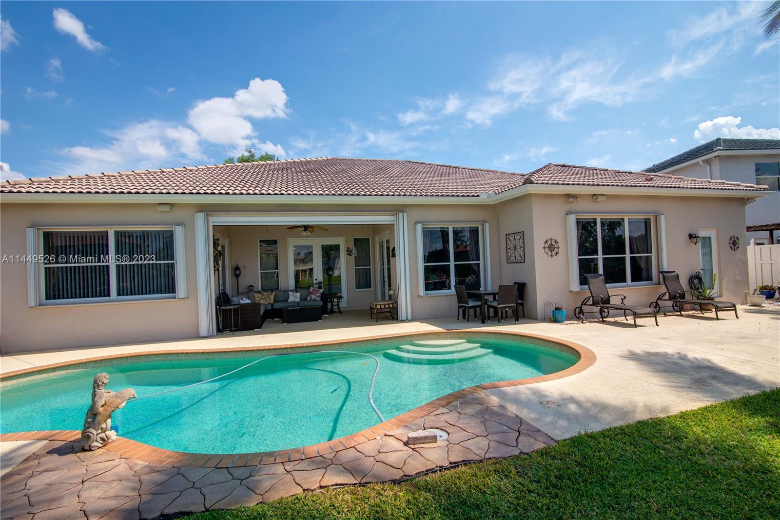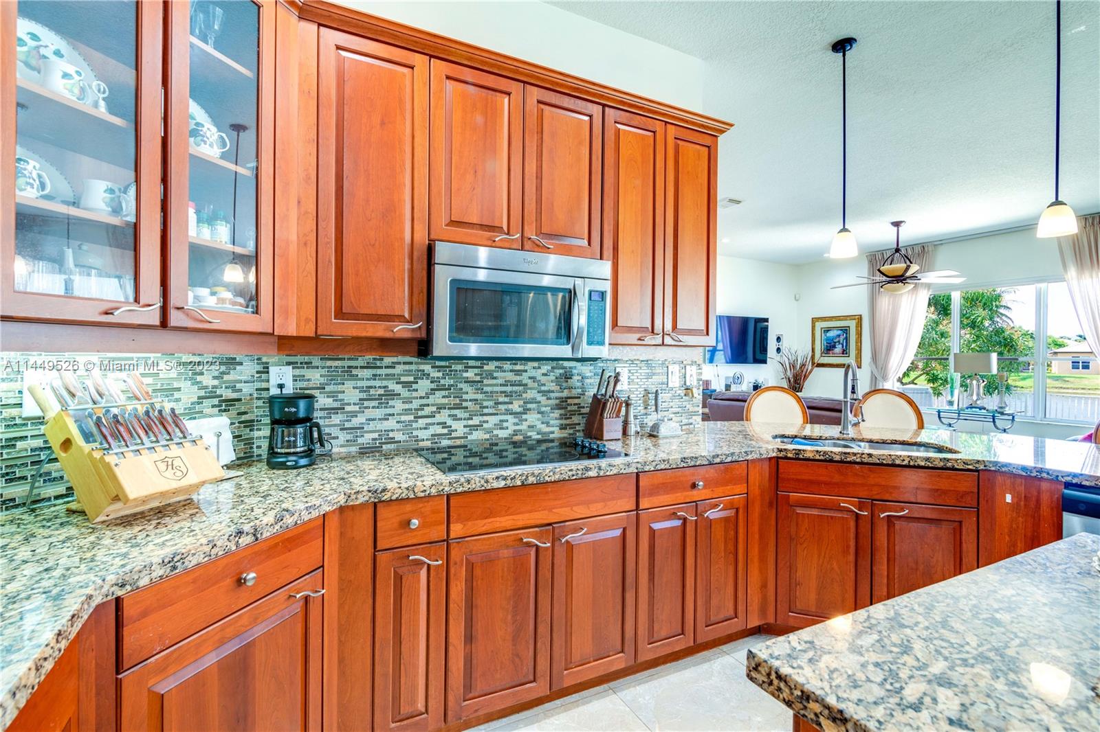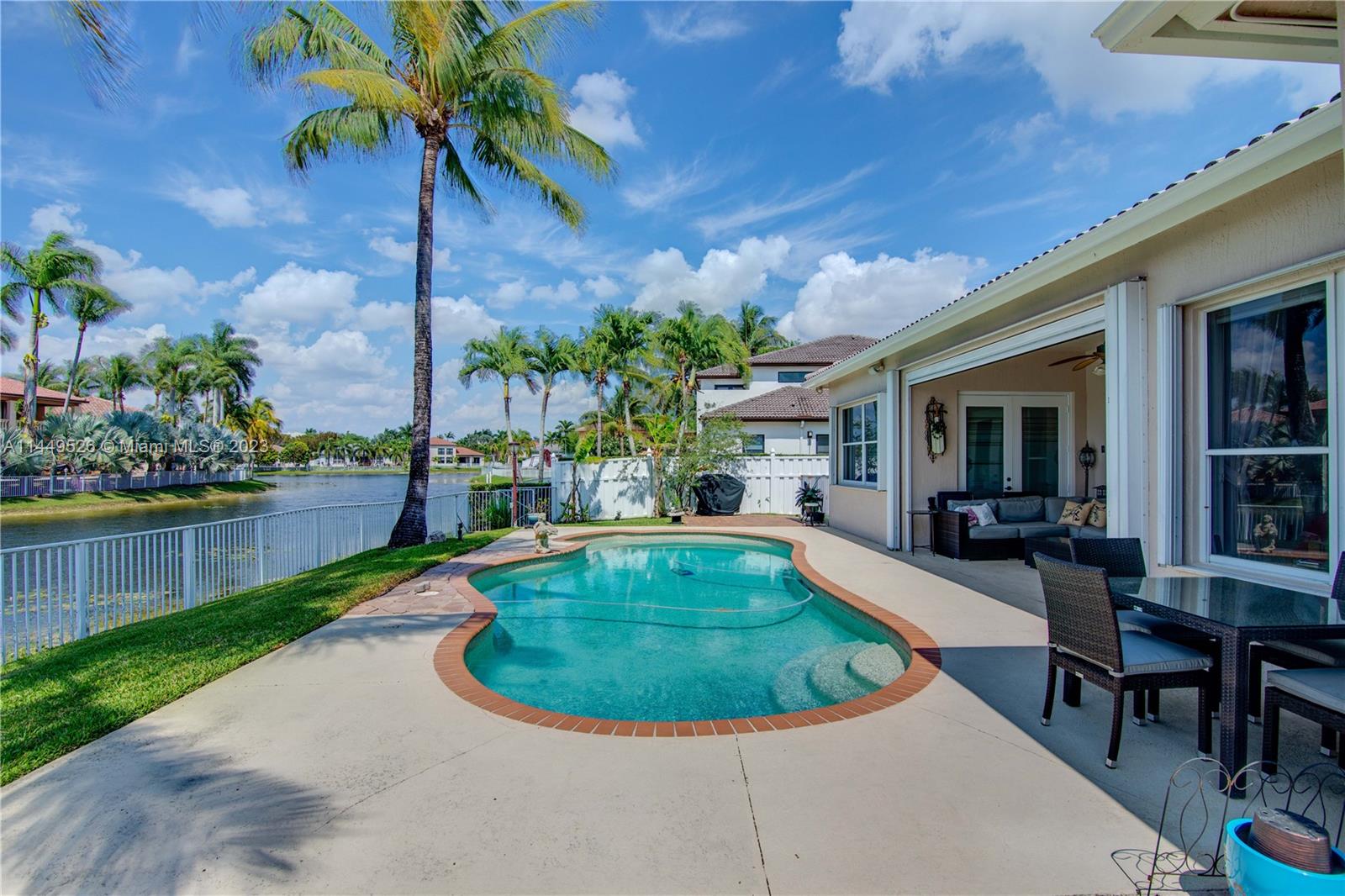 Amazing 4 Bed/3 Bath home located in the gated community of Windsor Palms. Enjoy beautiful lake views, heated swimming pool in a fenced backyard with 2 mango trees. One of the baths is connected to the pool patio. Primary Bath has dual vanities and sinks, bidet, separate tub and shower. This home includes a full house generator, solar panels to heat the pool and home theater system installed in family room. One room converted into home office with floor to ceiling wood bookcase. Stainless steel kitchen appliances (double oven) and granite counter tops, ceramic tile through out the home. 3 car garage, the doors replaced in 2023, Accordion shutters, Electric Porch Awning, Water Heater in 2020, Plumbing replaced in the home 2022.