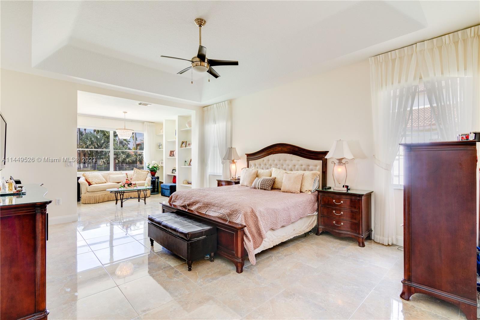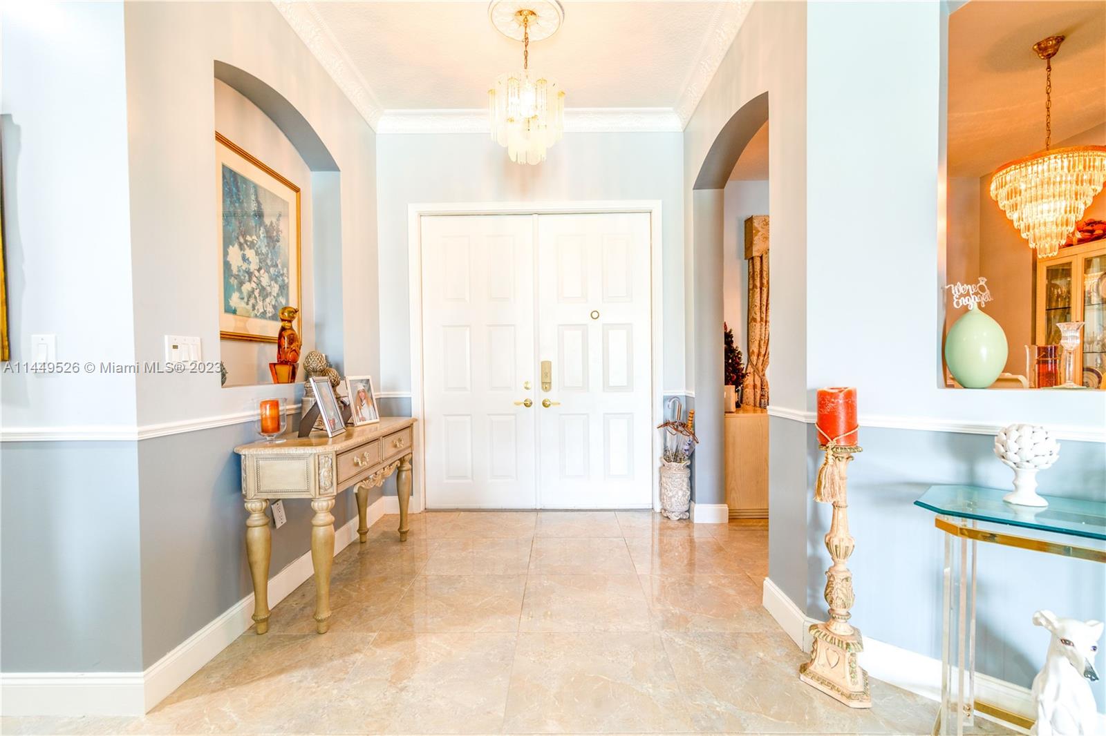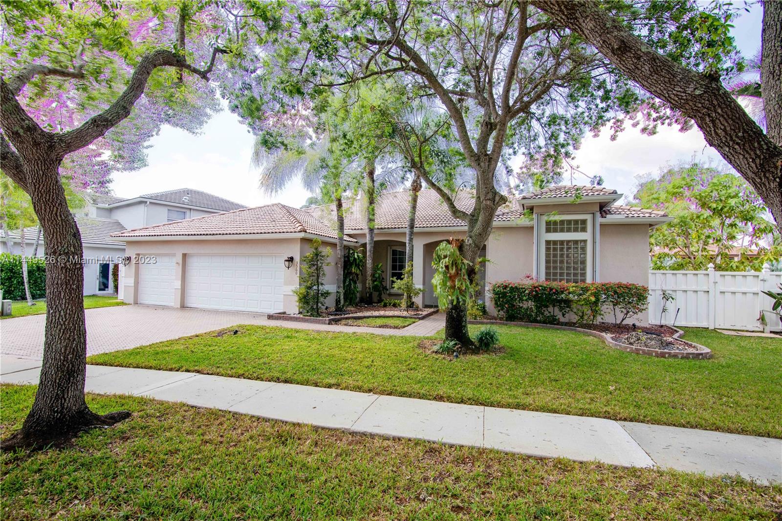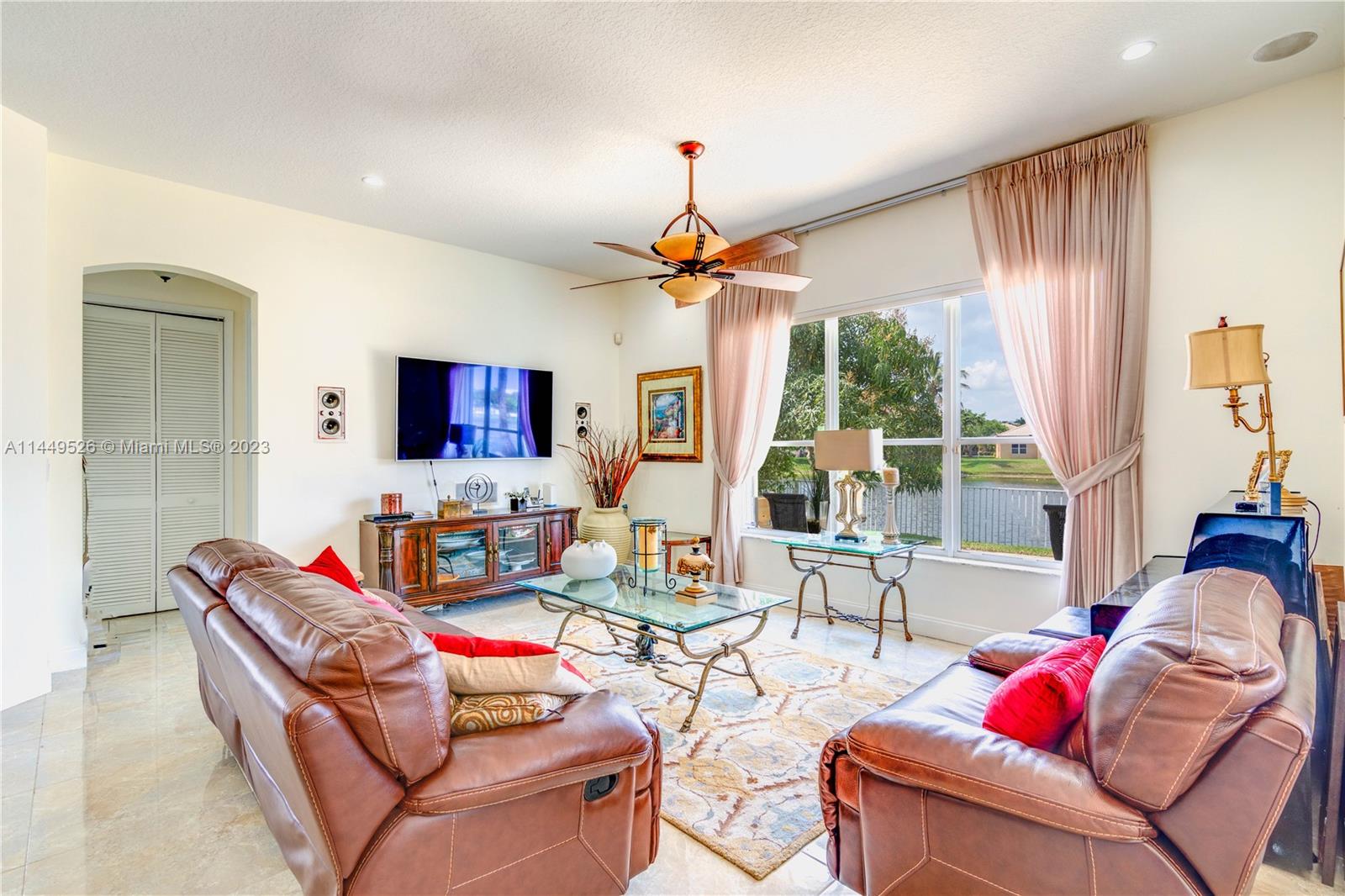 Amazing 4 Bed/3 Bath home located in the gated community of Windsor Palms. Enjoy beautiful lake views, heated swimming pool in a fenced backyard with 2 mango trees. One of the baths is connected to the pool patio. Primary Bath has dual vanities and sinks, bidet, separate tub and shower. This home includes a full house generator, solar panels to heat the pool and home theater system installed in family room. One room converted into home office with floor to ceiling wood bookcase. Stainless steel kitchen appliances (double oven) and granite counter tops, ceramic tile through out the home. 3 car garage, the doors replaced in 2023, Accordion shutters, Electric Porch Awning, Water Heater in 2020, Plumbing replaced in the home 2022.