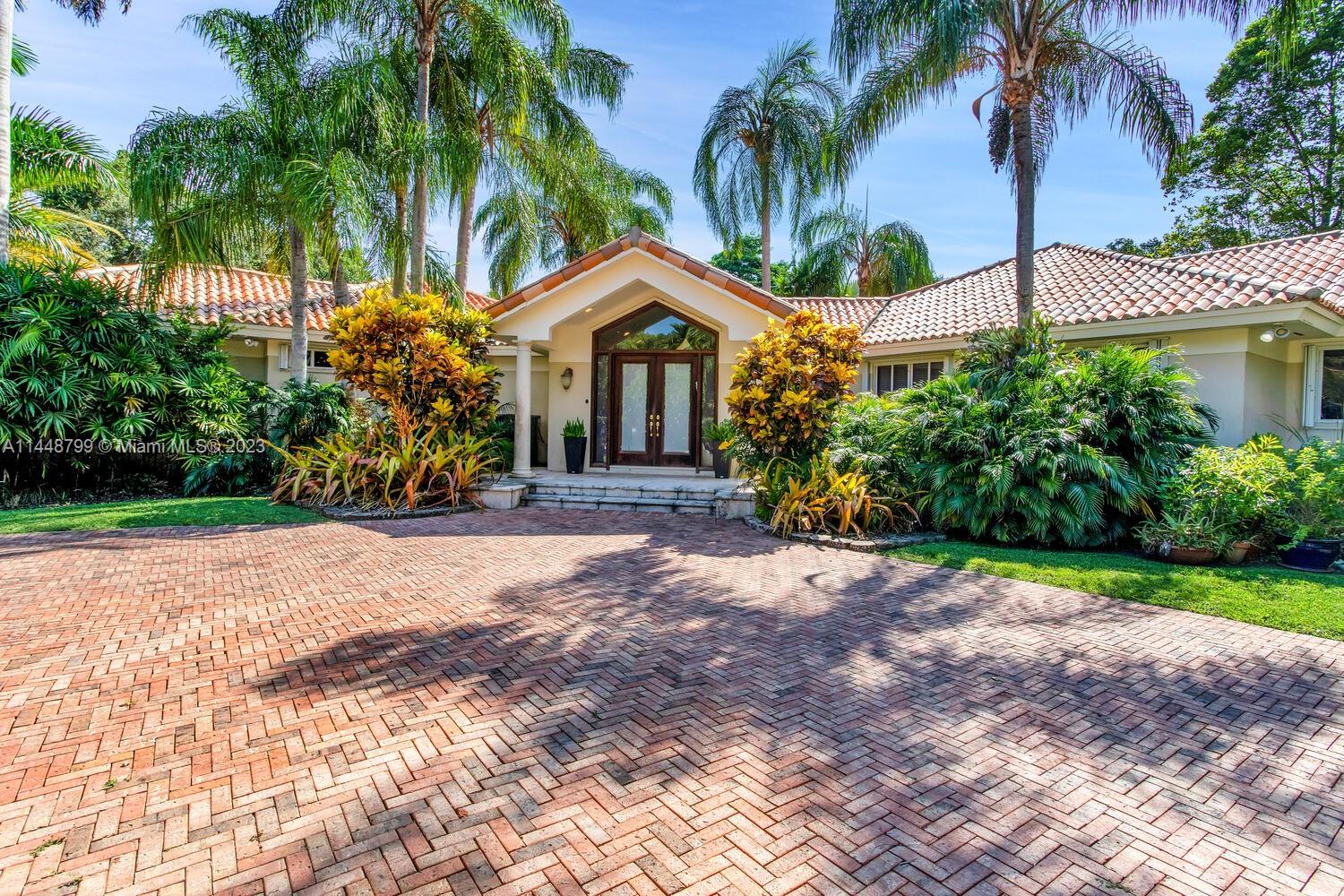 Imposing and elegant custom gated estate on one of the most desirable north Pinecrest streets, situated on private cul-de-sac. Lush acre laden with oak and tropical plantings. Unique architectural design of an excellent open flow floor plan, luxury finishes throughout, features vaulted ceiling, marble & wood flooring. Oversized picture windows, sunlit drenched interiors. Formal living and dining rooms lead to beautiful and expansive family room. gorgeous and updated gourmet dream kitchen centered around an expansive island equipped w/ top of line appliances and breakfast area. Magnificent grounds, sparkling large pool/spa. Roofed patio w/ built-in BBQ. Split private primary suite w/garden vistas. Excellent top Pinecrest public and private schools are all closed by! Fabulous offering !