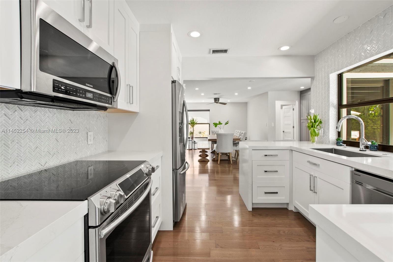 Beautiful & Completely Renovated 3 Bed 2.5 Bath Corner Lot Home In Prestigious Palm Aire. Vaulted Exposed Beam Ceilings Featuring A Large Open Split Floorplan W/ Living, Dining & Family Room. Impact Windows, Doors. All Exterior Walls Recently Smoothed, Refinished & Painted. Upgraded Custom Kitchen Has Quartz Large Waterfall Countertops W/ Storage, Stainless Steel Appliances, Pull Out Pantry & White Shaker Cabinets. Built-In Bar & Additional Cabinets In The Formal Dining. New Ceiling Fans & Lighting Throughout. Primary Suite W/ California Closets, Large Bathroom W/ Dual Sink Vanity & Shower. Fully Fenced In Backyard With Lush Landscaping, Low Voltage Lighting, Travertine Deck And Heated Salt System Pool W/ Color Changing Lights. Private Concrete Pad For RV Or Boat Parking. No HOA!