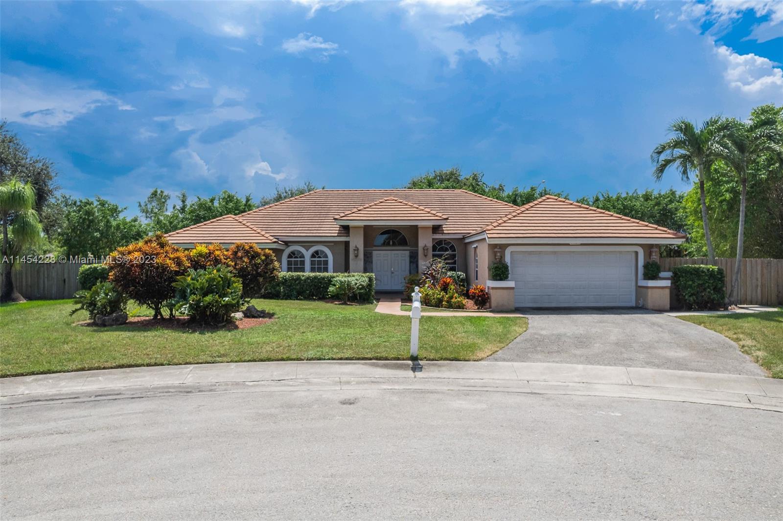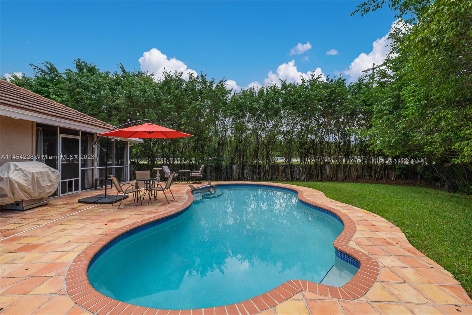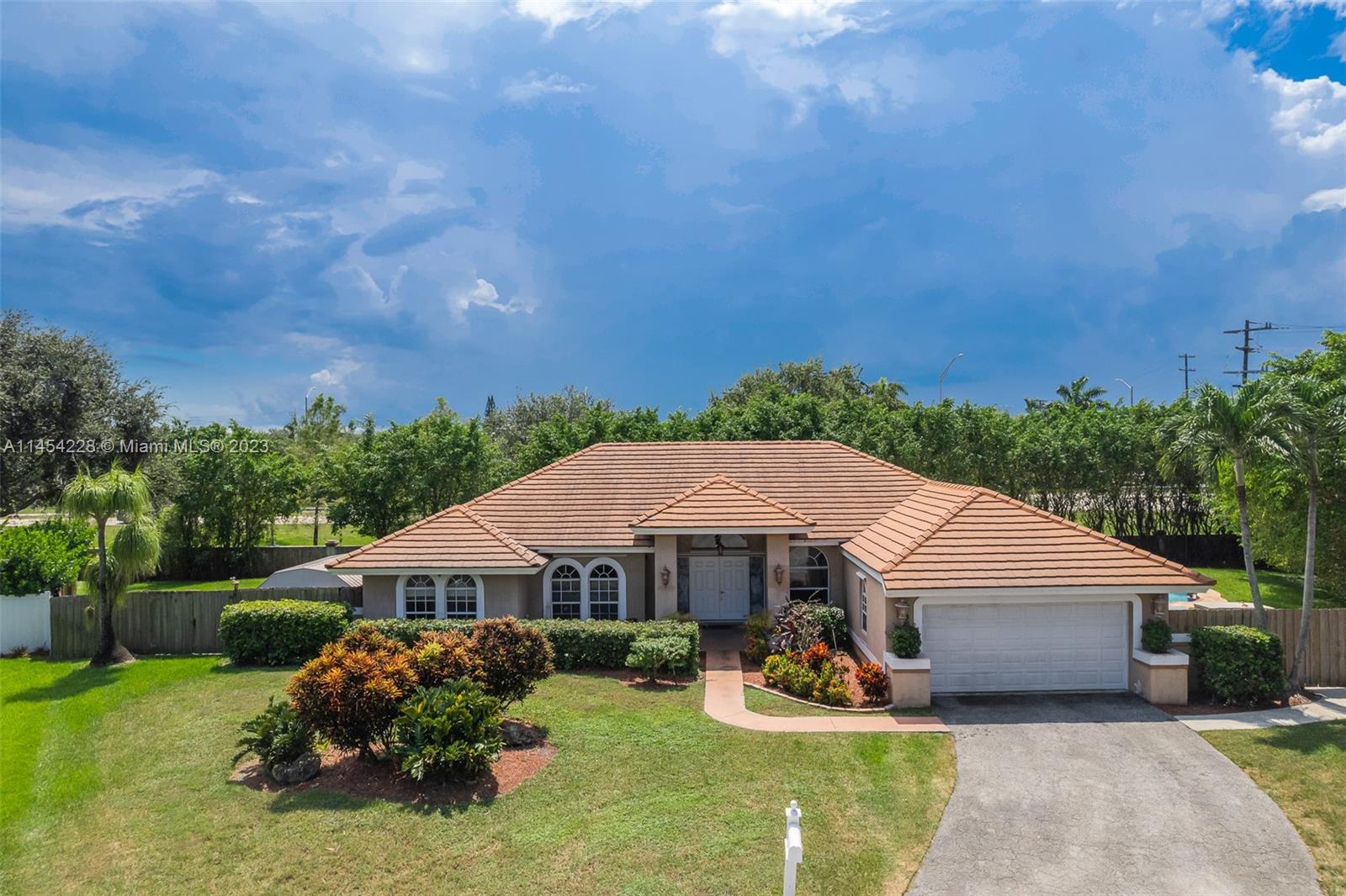Lovely Pool Home in Davie Country Estates that sits on a builders half acre in the center of the cul-da-sac. Walk in you have a 4 Bedrooms, 2 Bathes, updates Kitchen with wood cabinets, Granite counter tops, family room, breakfast area, office, separate laundry room with sink, 2 car garage. Great covered patio for entertaining which is 50' long. Outside you have your pool and plenty of room for anything else. Roof was replaced 2016. Only 20 homes in the community.