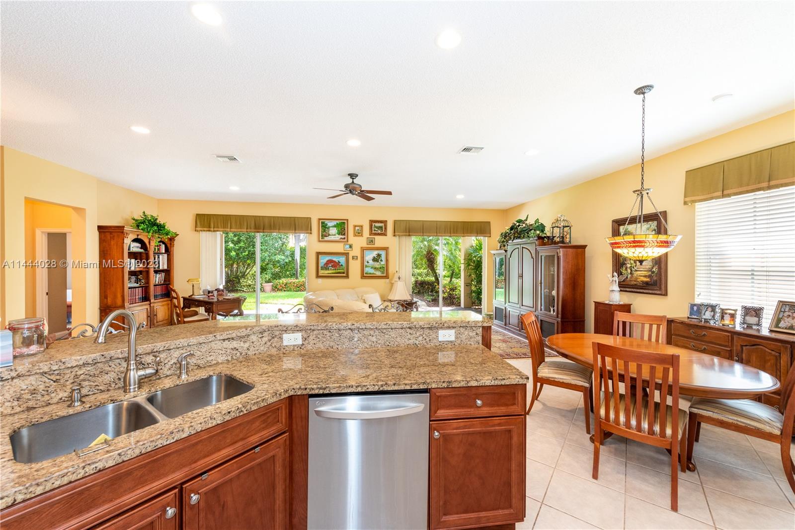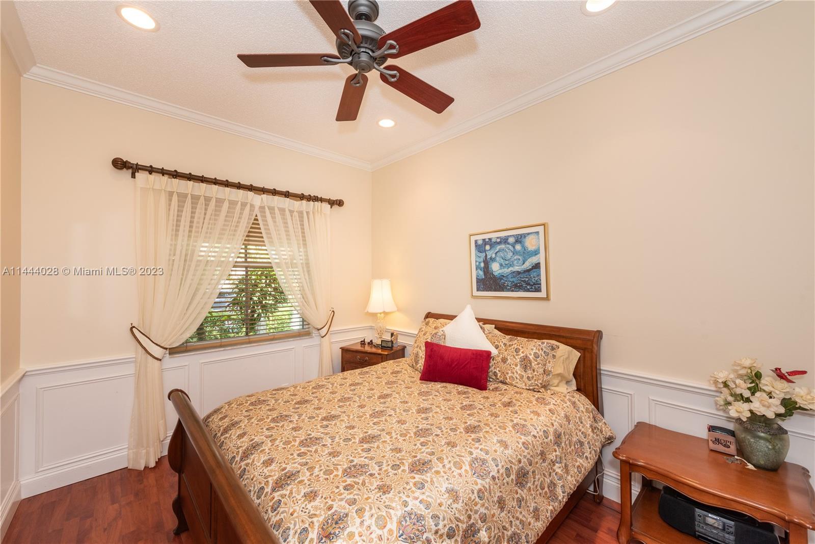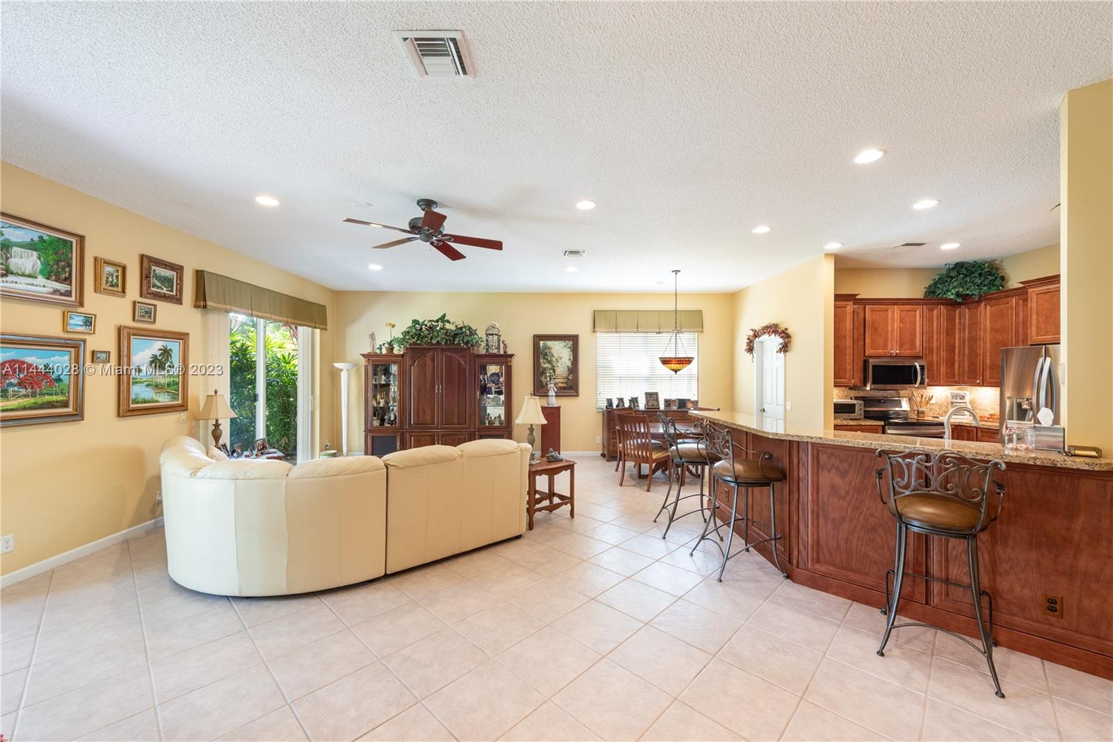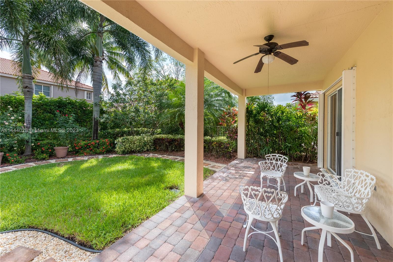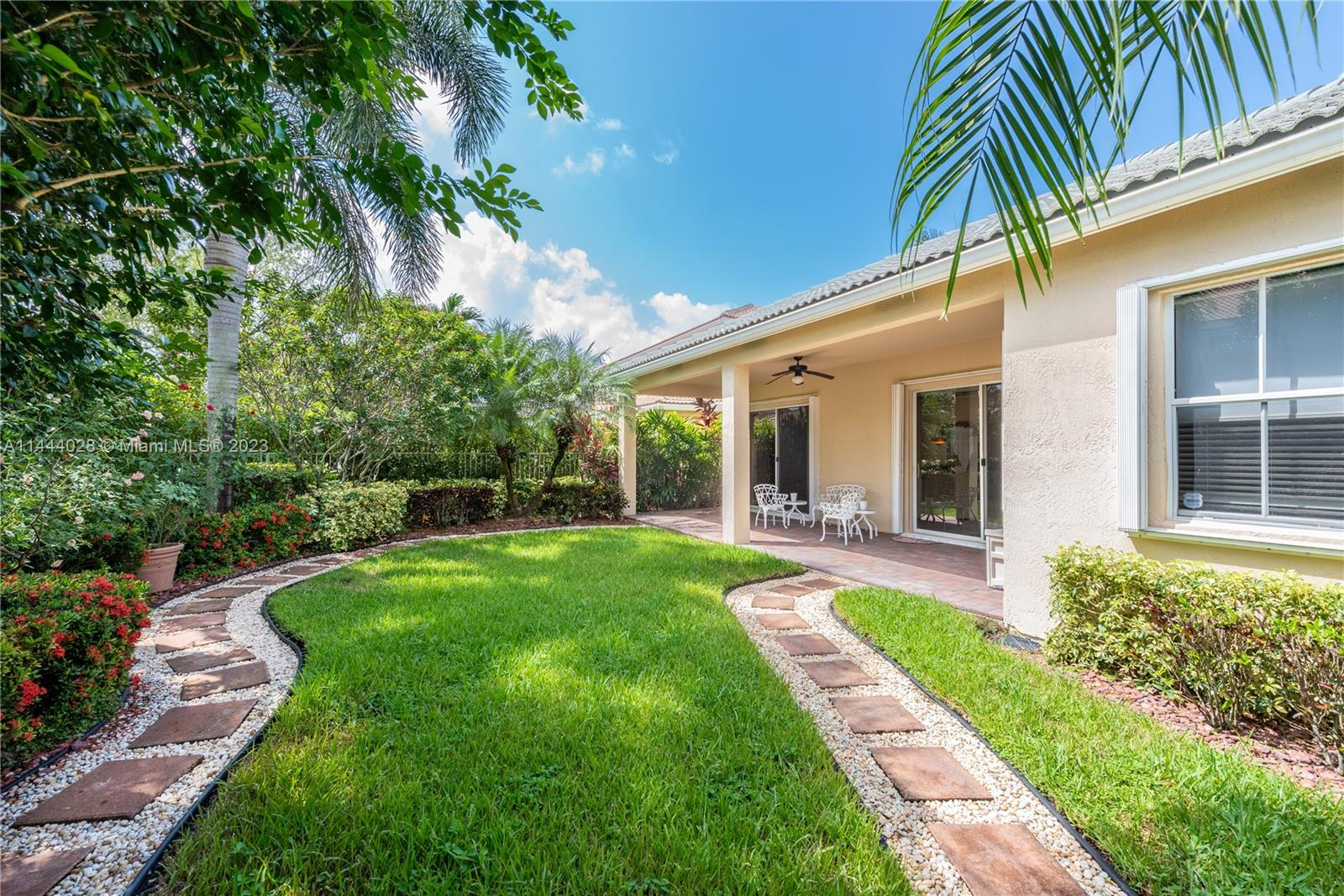 Savanna is one of Weston's highly desirable gated communities. This impeccable home is move-in ready, with a superb layout for entertaining. The living, kitchen, and family rooms are all integrated with bright, ample areas facing the beautifully landscaped backyard, which you can access through two different sliding doors. The backyard features a large overhang paved area with fan. The house has a split floor plan with 2 AC's, lots of light and a 4th bedroom that has been converted into an office. The kitchen has solid wood cabinets, granite counter tops, and stainless steel appliances. The laundry room is under AC with a utility sink. Accordion shutters. A+ Schools, some of the best in Broward County.No Association Approval required.