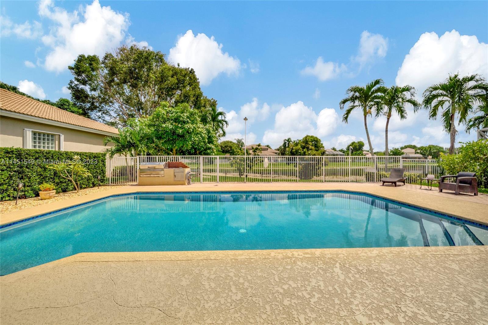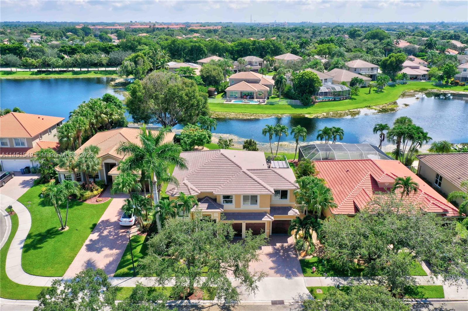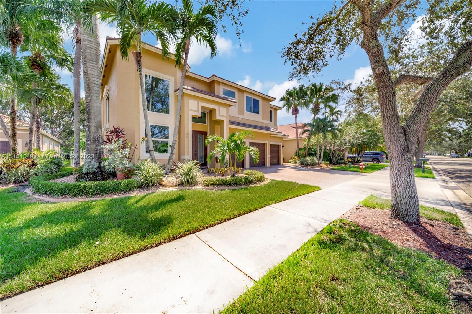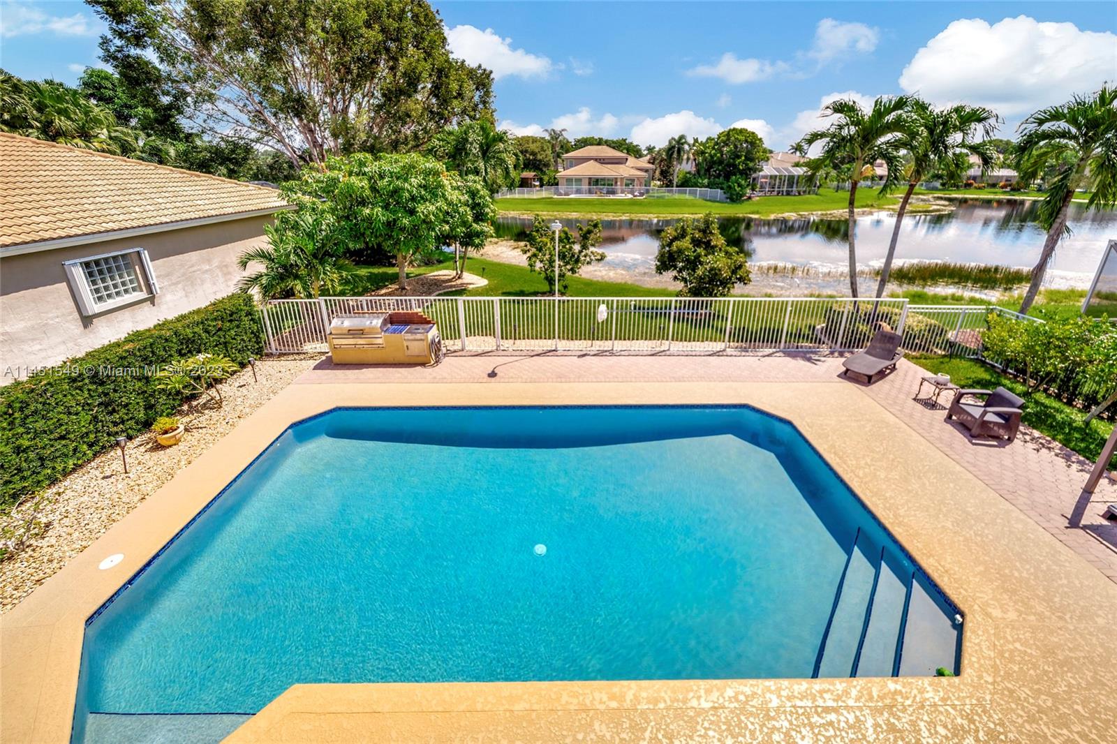 $25,000 BUY DOWN CREDIT paid buy Seller - Welcome to luxurious living in Weston's Emerald Estates! This stunning 5-bedroom, 3-bath home, tucked away in a tranquil cul-de-sac, offers modern updates, a chef's kitchen, and elegant baths. The primary bedroom boasts a private terrace with serene lake views. Marble floors, a 3-car garage with epoxy floors, and brick paver driveways add to the charm. Safety is ensured with security cameras and monitors installed inside and out as well as 24/7 gated security, and the HOA covers landscaping, cable, internet, gym access, and alarm monitoring. A new roof and impact windows provide peace of mind. Your oasis awaits outside with a pool, spa, and outdoor kitchen. Don't miss out! Schedule your showing today!