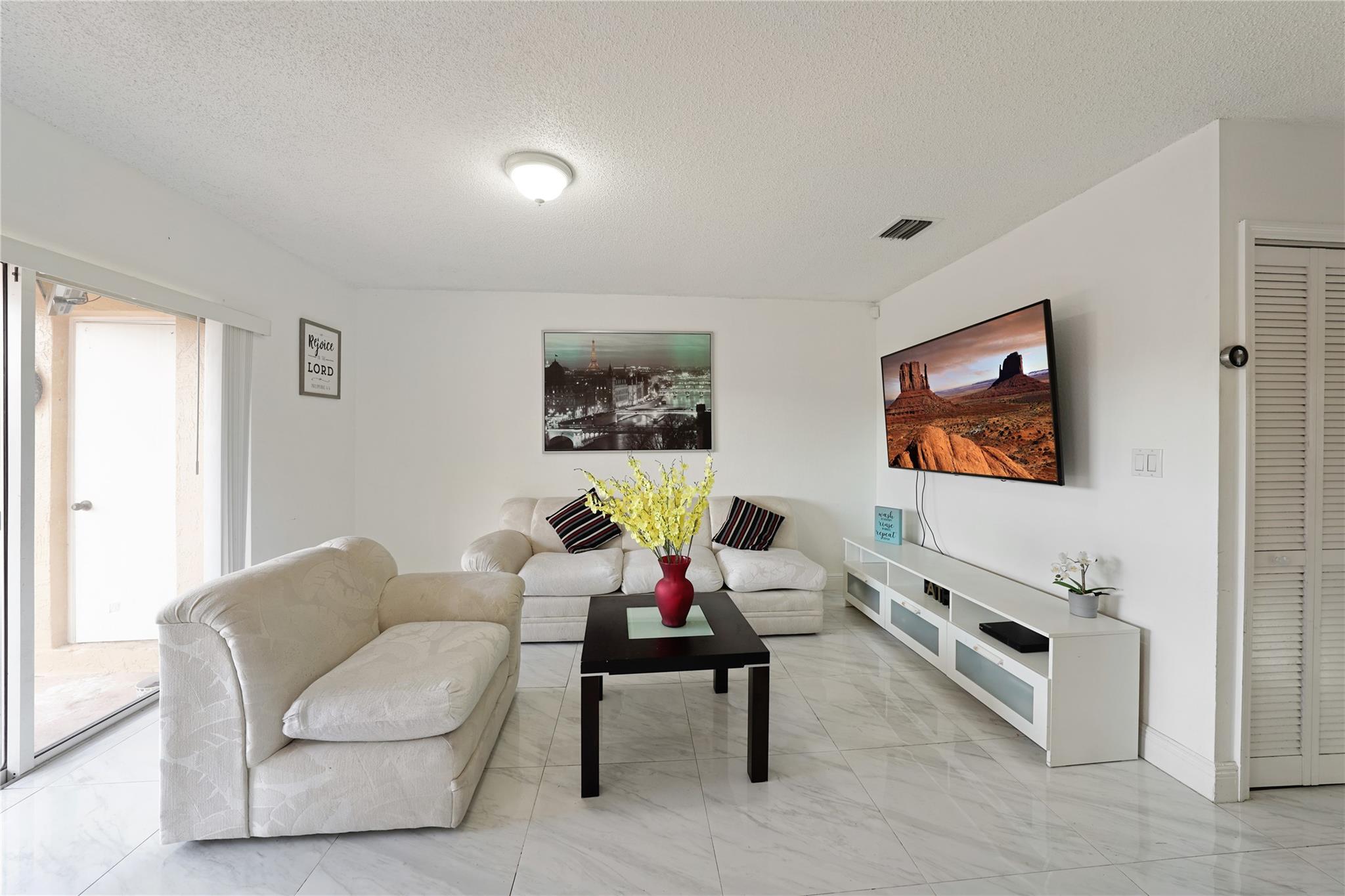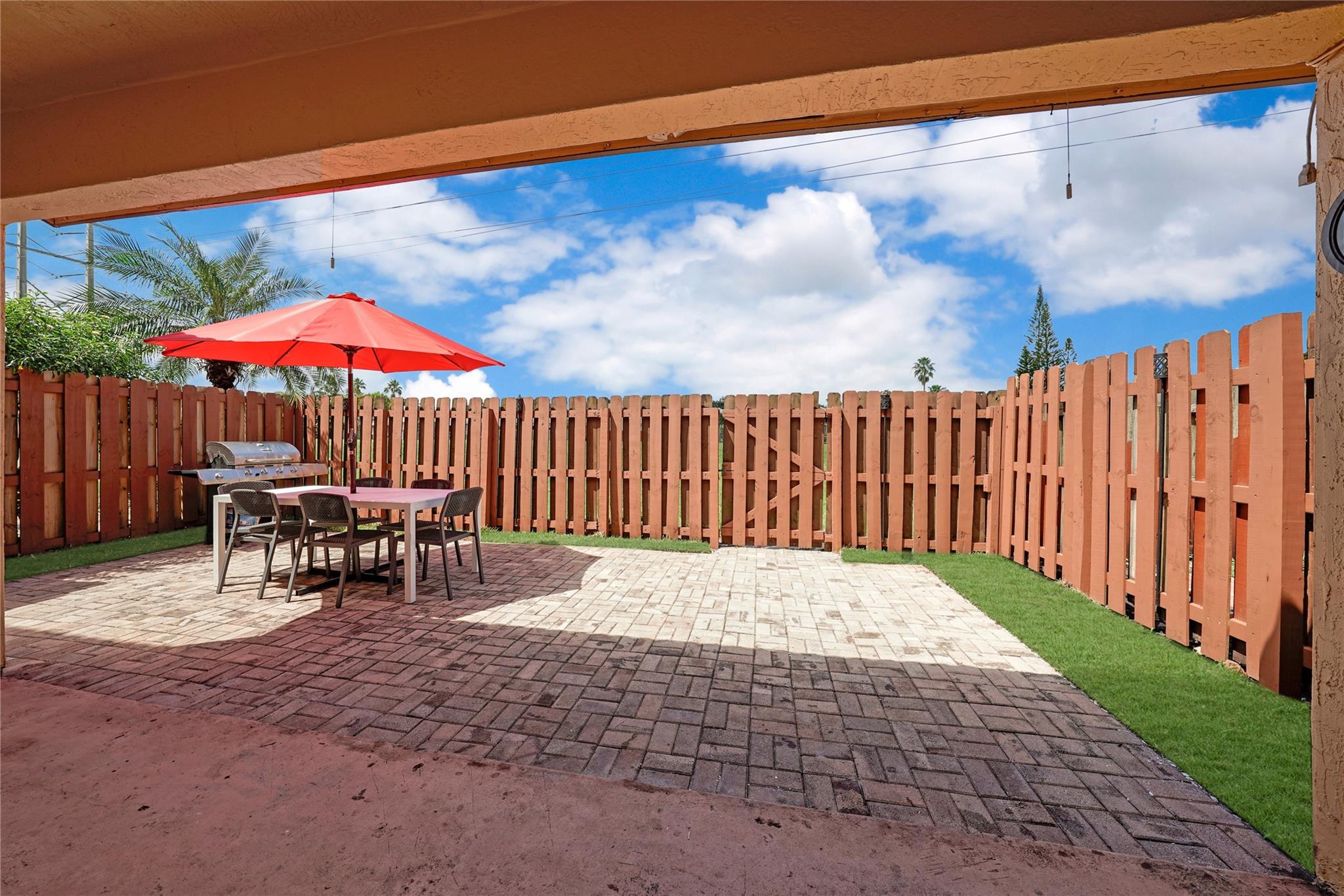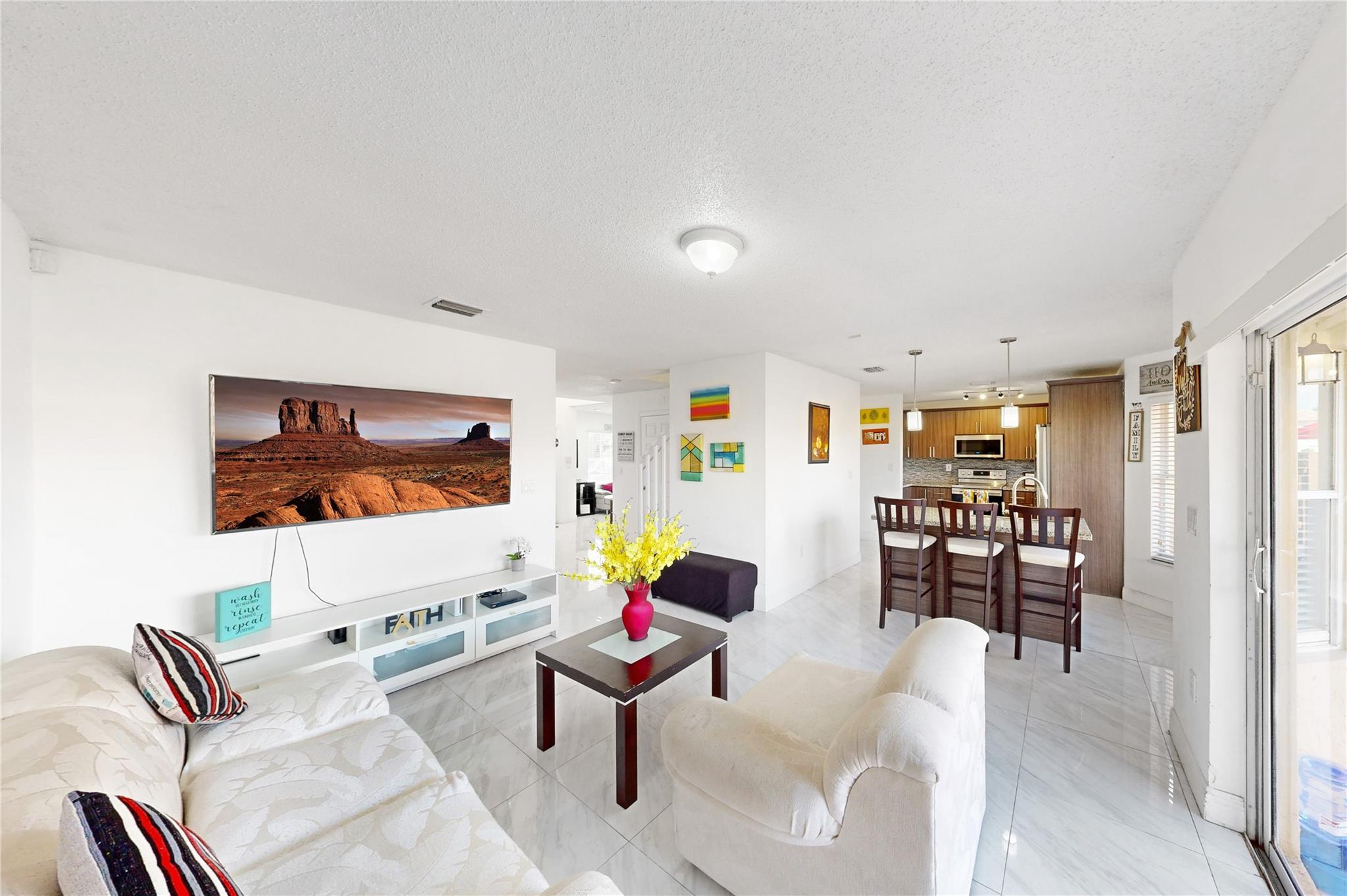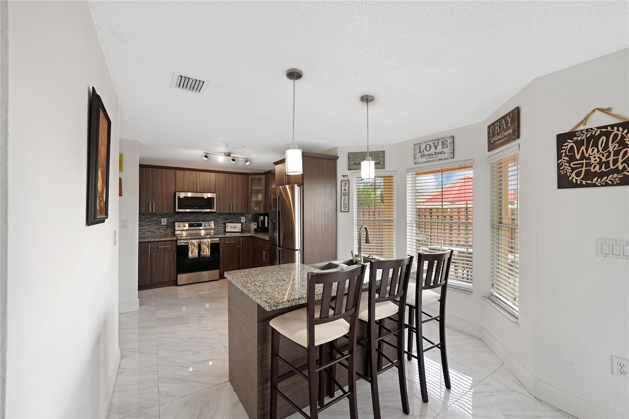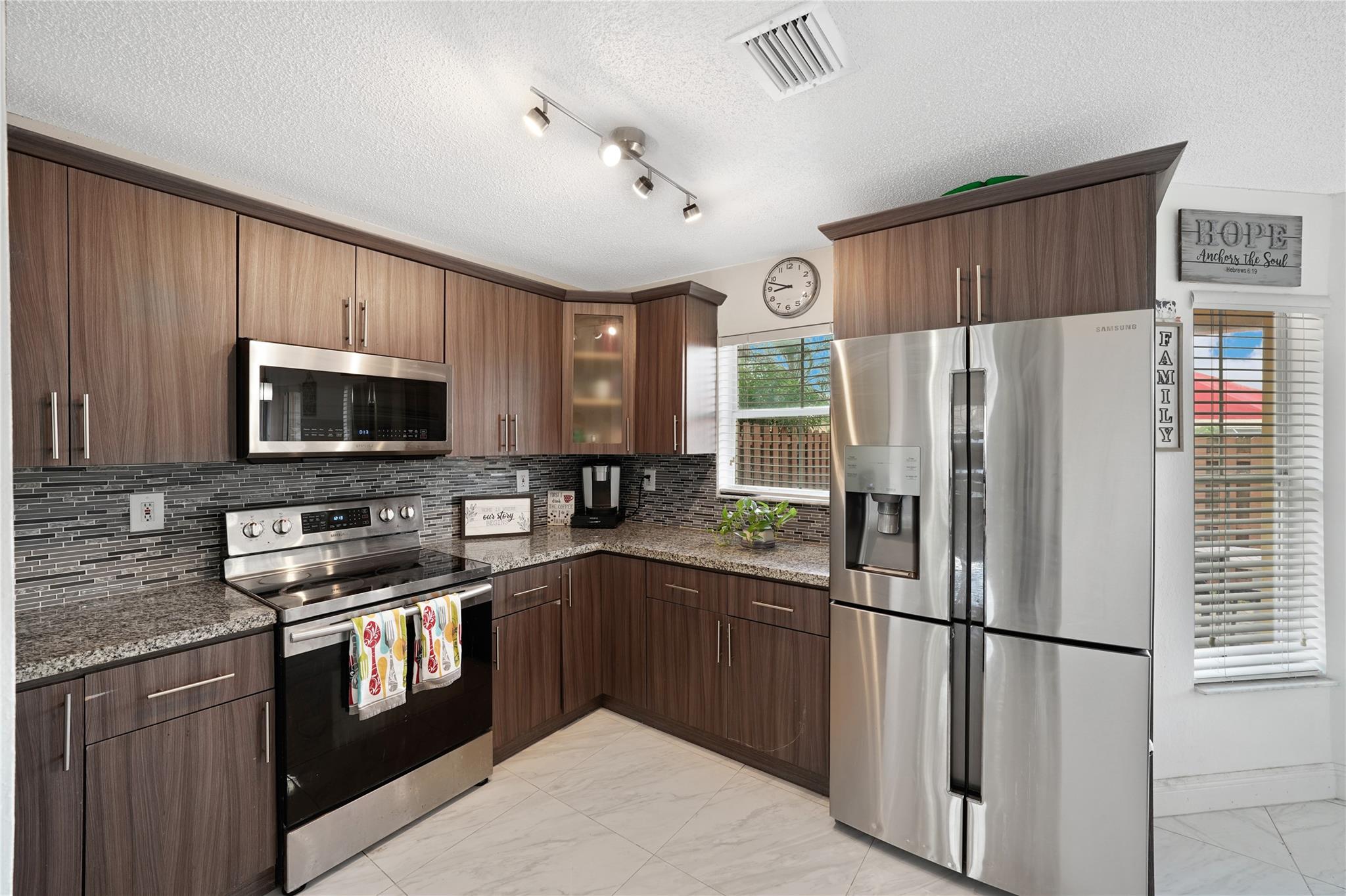 Nestled in the gated community of Poinciana Parc, this beautiful 4BD 2.5BA townhome epitomizes modern elegance & comfort. With nearly 2,000 sqft of living area, & remodeled in 2018, the home showcases new bathrooms + a stylish kitchen adorned with granite countertops, dark wood cabinets, & Samsung appliances. The first floor boasts stunning tile floors. The second level features chic laminate flooring. Additional highlights include an attached 1-car garage, a private fenced patio, a 2016 AC unit, & full-panel hurricane shutters for peace of mind. Residents enjoy the security of a guard-gated entrance, a community pool, & a children's playground. All within a central location offering easy access to local amenities, shops, restaurants, the Sawgrass Mall, & IKEA. Equal Housing Opportunity.