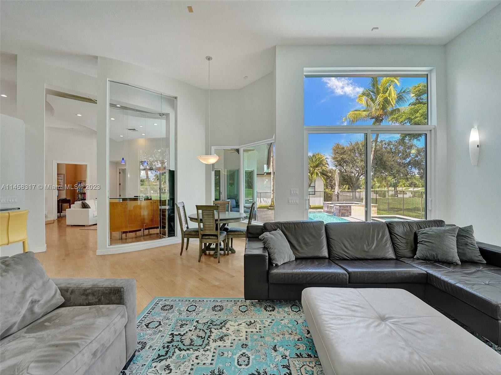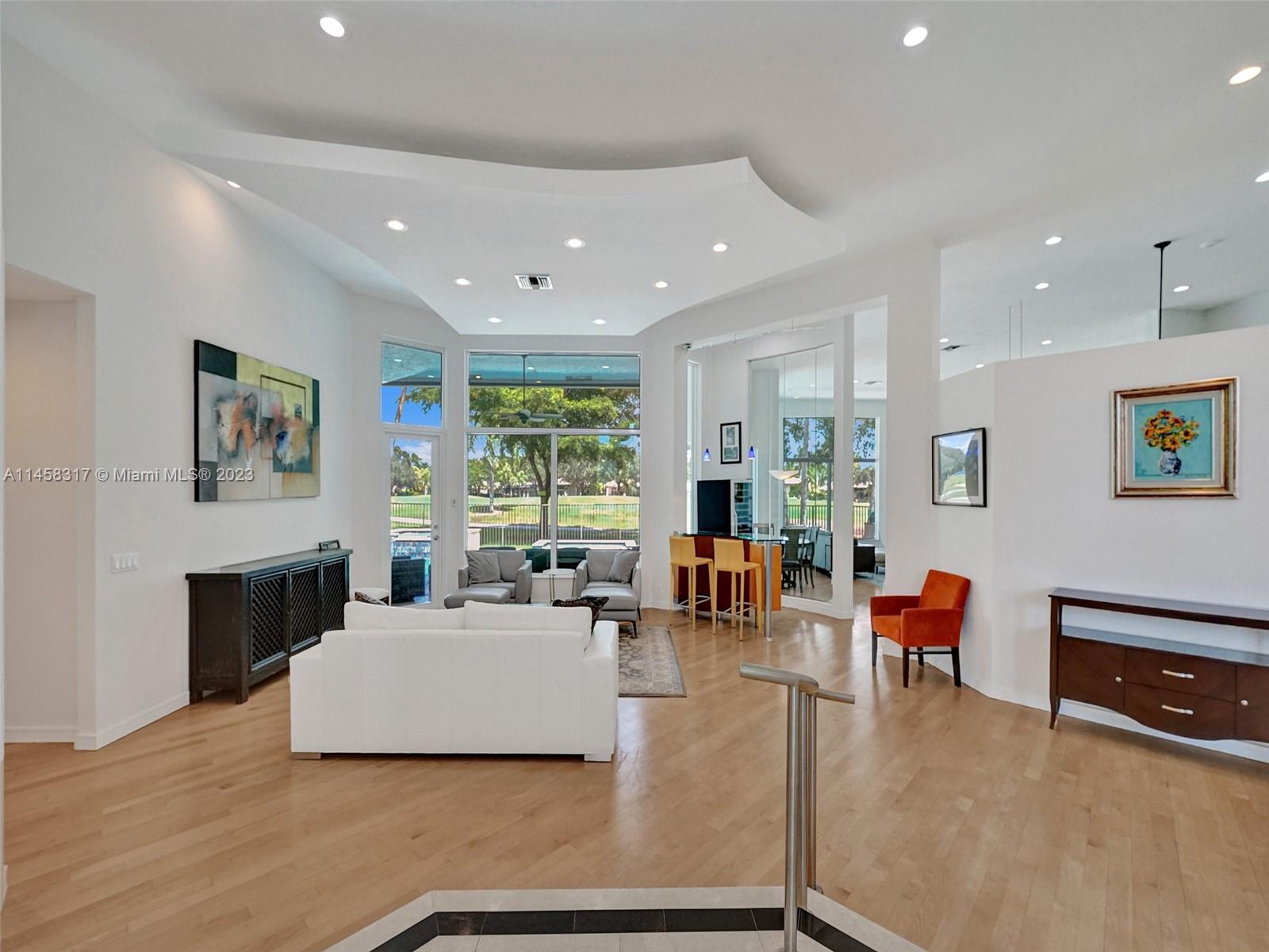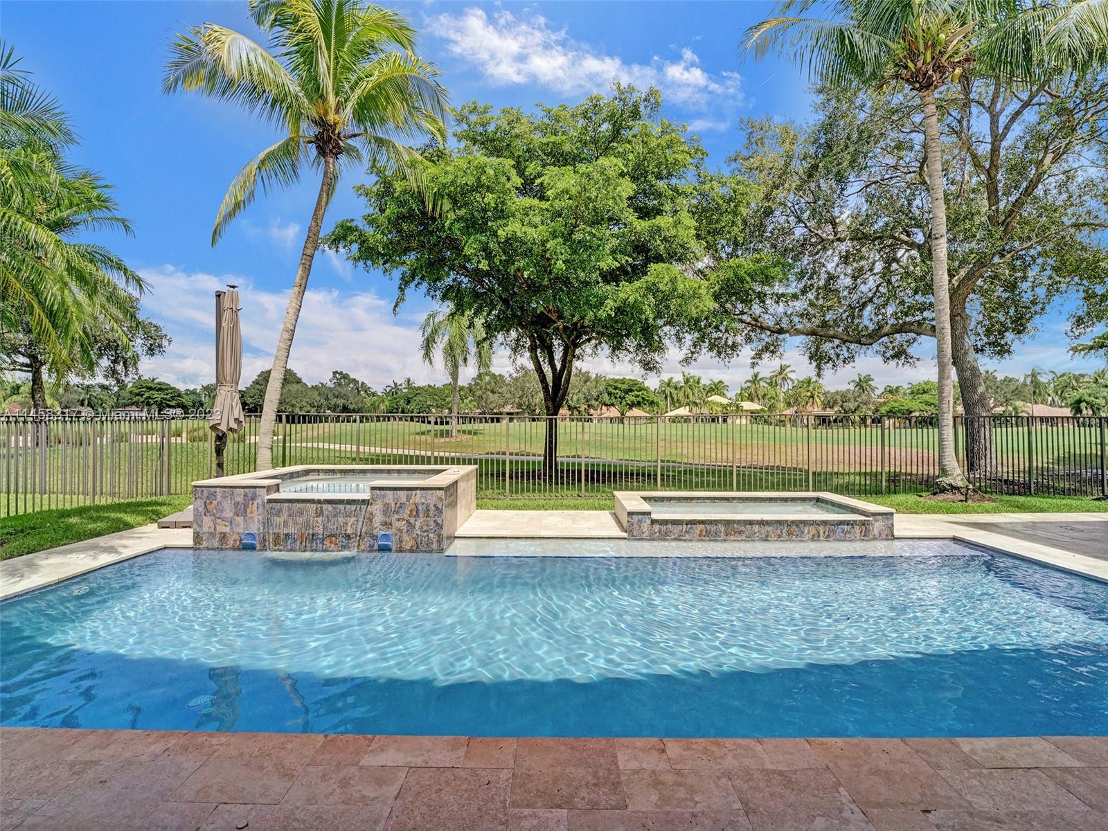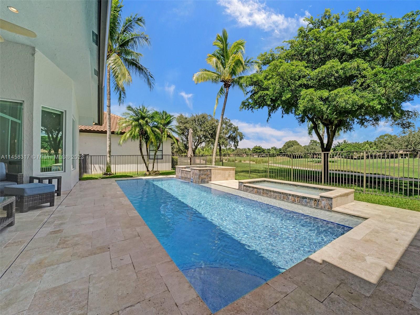 Modern Luxury Living in the exclusive gated community of Weston Hills CC, this residence overlooks the 3rd hole of the Players Course. BRAND NEW ROOF and FULL IMPACT windows and doors. Solid oak wood floors in the living areas, high-detailed ceilings, LED lighting, and abundant natural light. The primary suite offers a tranquil retreat, dual walk-in closets, a NEWLY RENOVATED OWNERS BATH with porcelain finishes, a vessel tub, a shower, and dual sinks. MODERN KITCHEN outfitted with high-end stainless steel appliances—Miele cooktop, double wall oven, and Subzero refrigerator. Secondary bedrooms boast new laminate flooring and walk-in closets. NEWLY RENOVATED TRAVERTINE POOL DECK surrounds the resurfaced, heated saltwater pool and spa—a private oasis with picturesque golf course vistas.