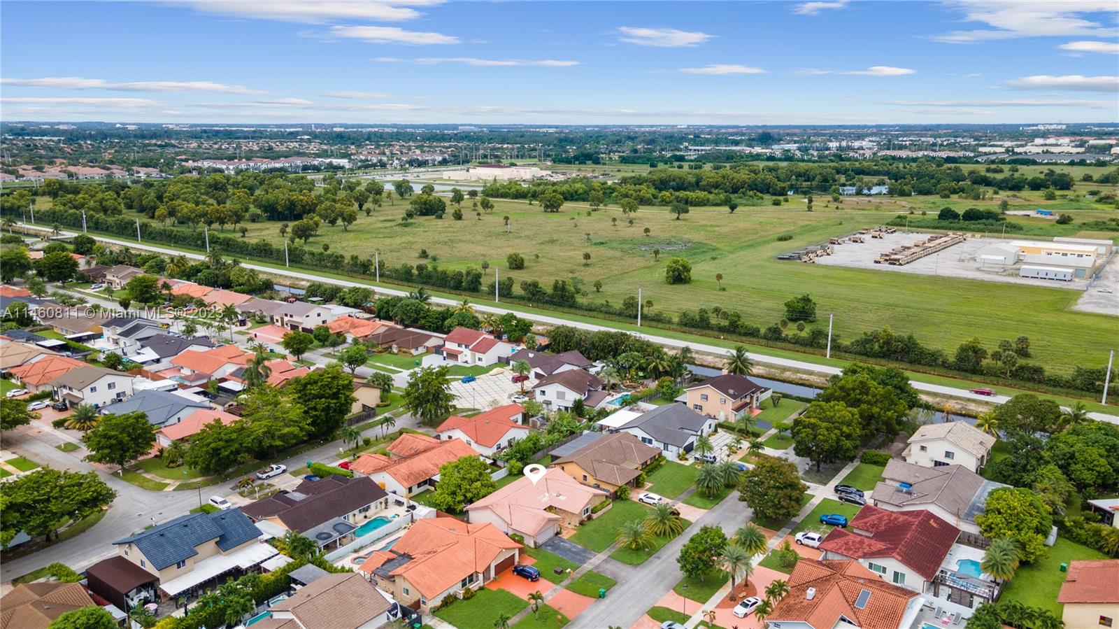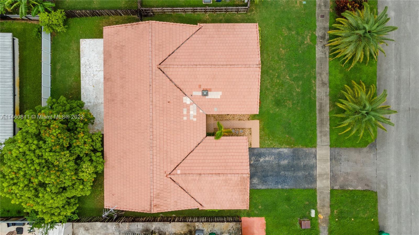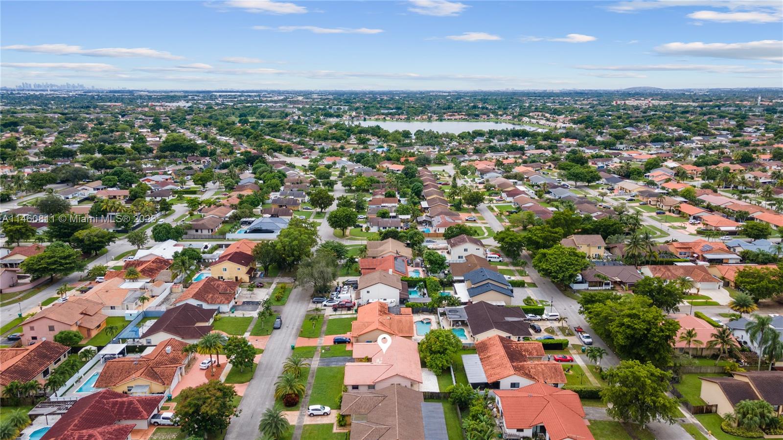 Spacious home on a dead-end street features 4 bedrooms (split floor-plan), 2 bathrooms, 2-car garage, updated front double-door entry, foyer, formal living and dining room, spacious kitchen with pantry and open to the family room, skylight, separate laundry room, carpet and tile throughout, complete hurricane protection with a combination of impact glass and accordion shutters. The spacious primary bedroom features a double-door entry, platform area, and an en suite with dual vanities, separate shower and tub, and a walk-in closet. Exterior features include a spacious patio partially covered, mango tree, and fully fenced back-yard. HVAC is 2004 and Roof Permit with city is dated 1994.