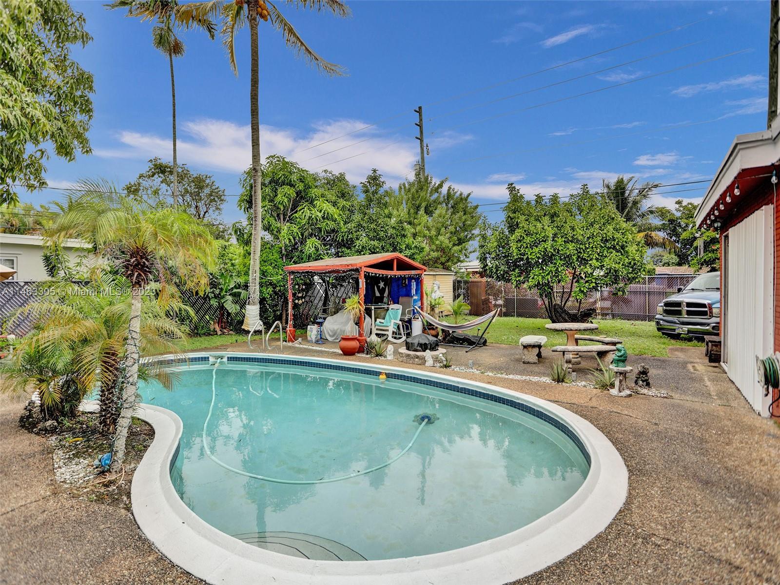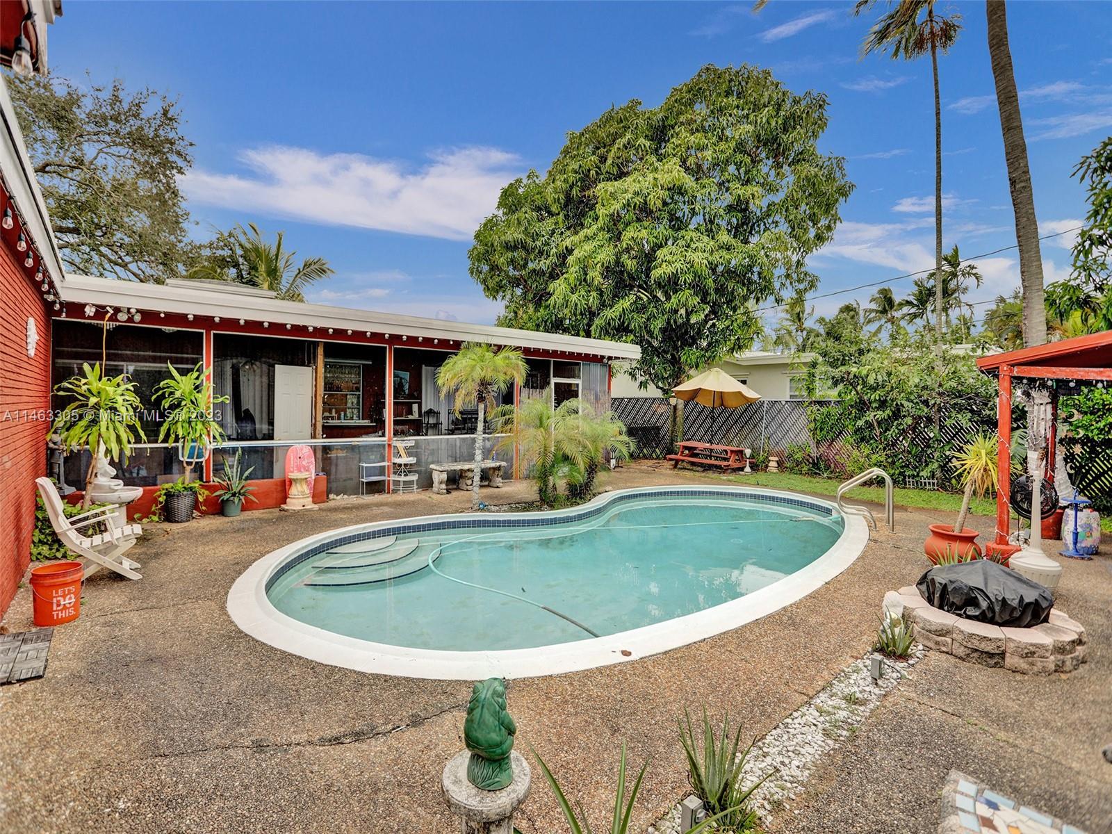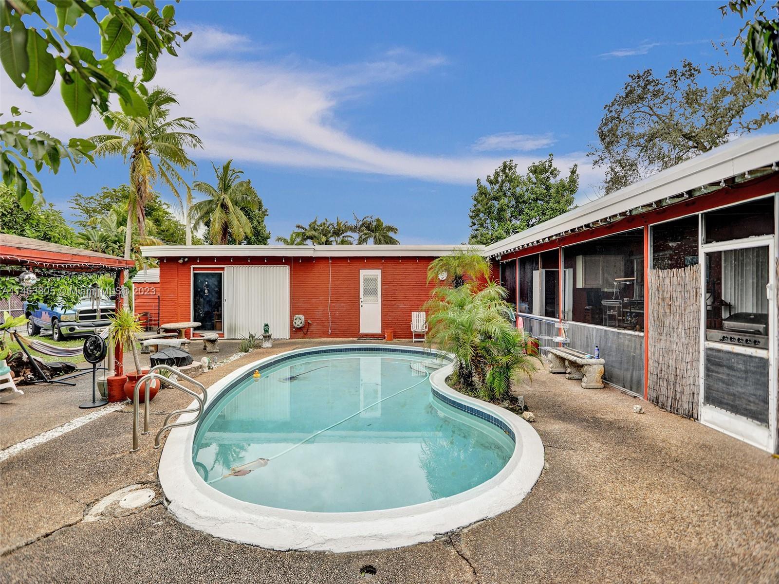 4 bed 3 bath pool home. It can easily be divided into 3/2 main home and 1/1 unit with its own separate entrance. Located just a few minutes from Hollywood Beach in the desirable Hollywood Hills neighborhood. NO association dues and short-term rental-friendly neighborhood. Close to all major highways and the international airport. The large yard has many fruit trees. New roof shingle sloped roof in 2022, AC 2019. Ready to move in or ready to be your blank canvas.