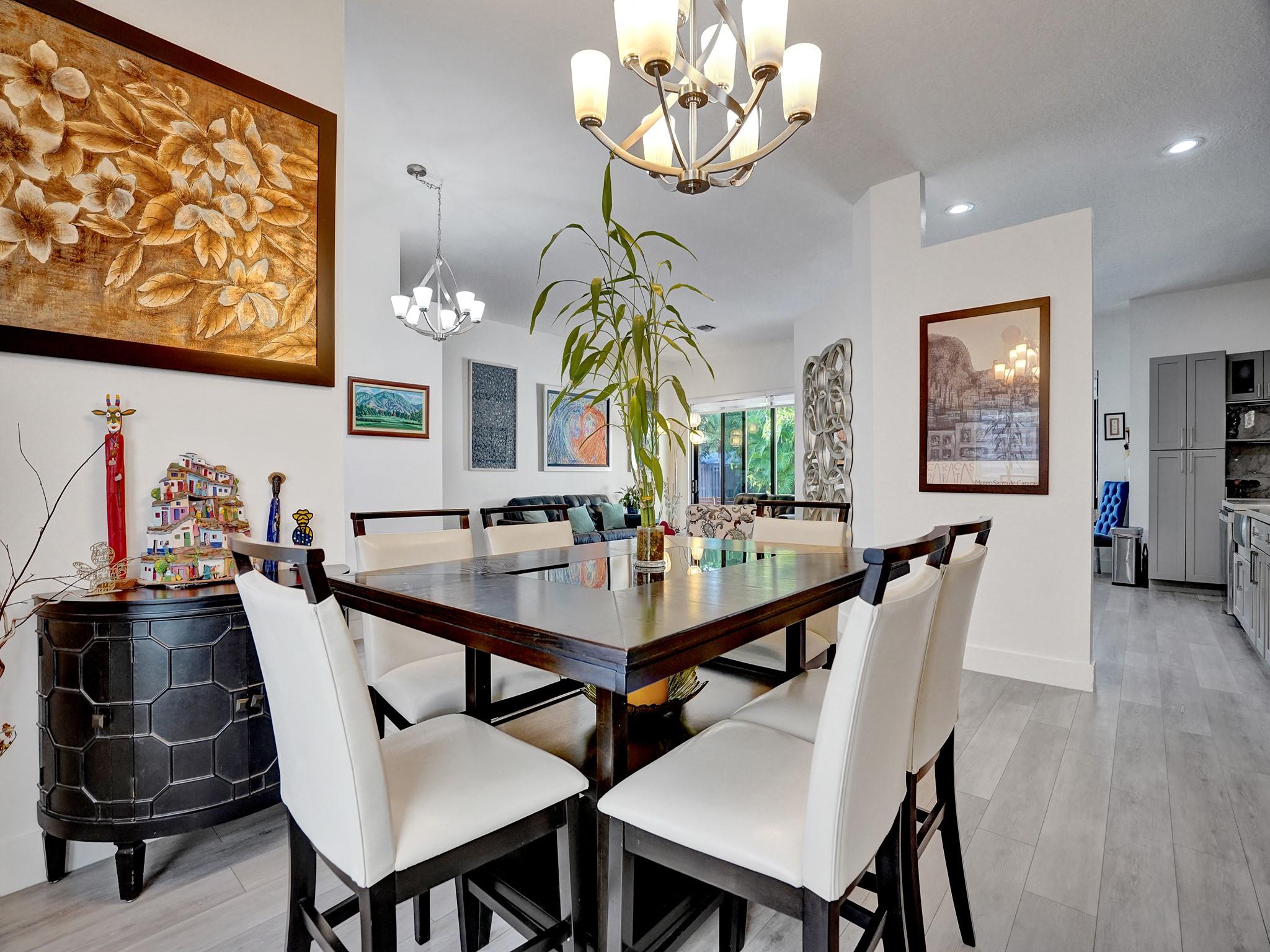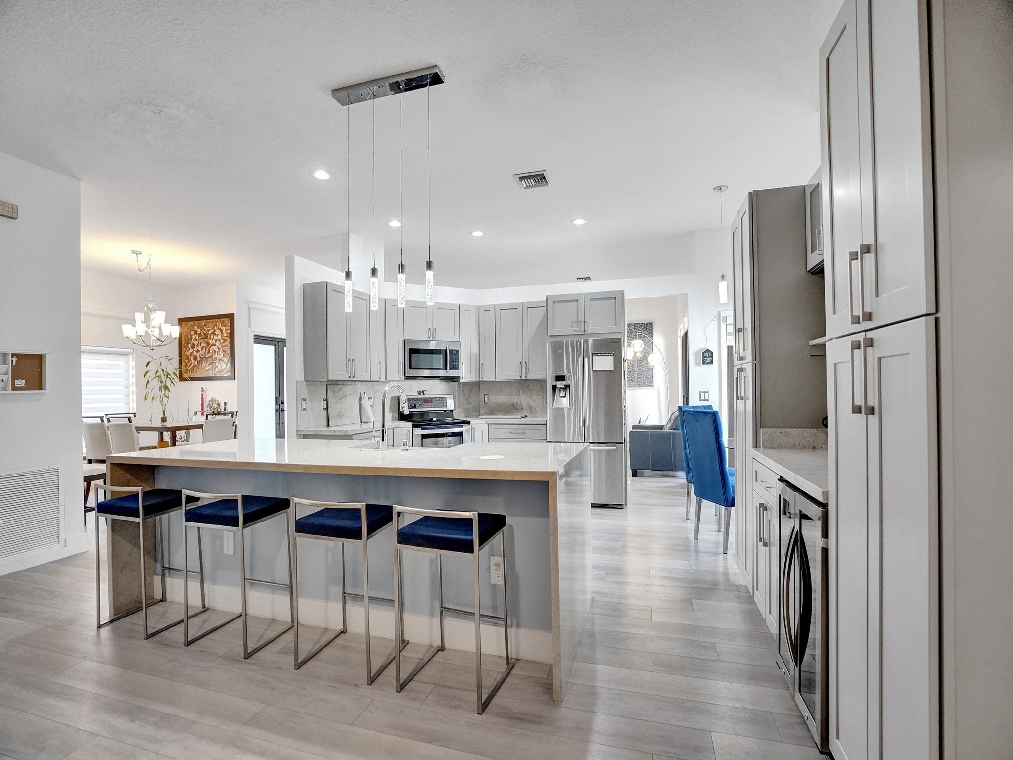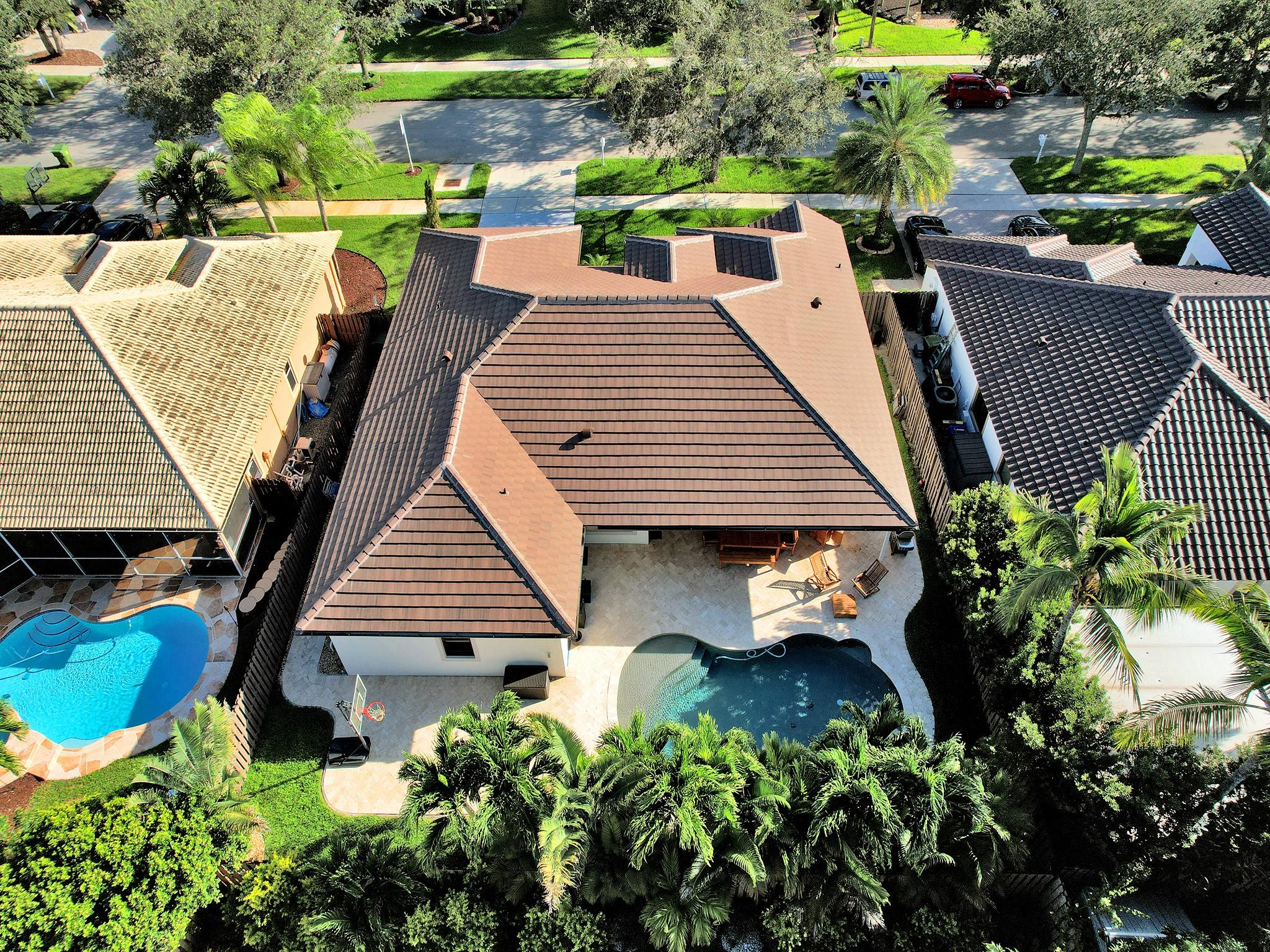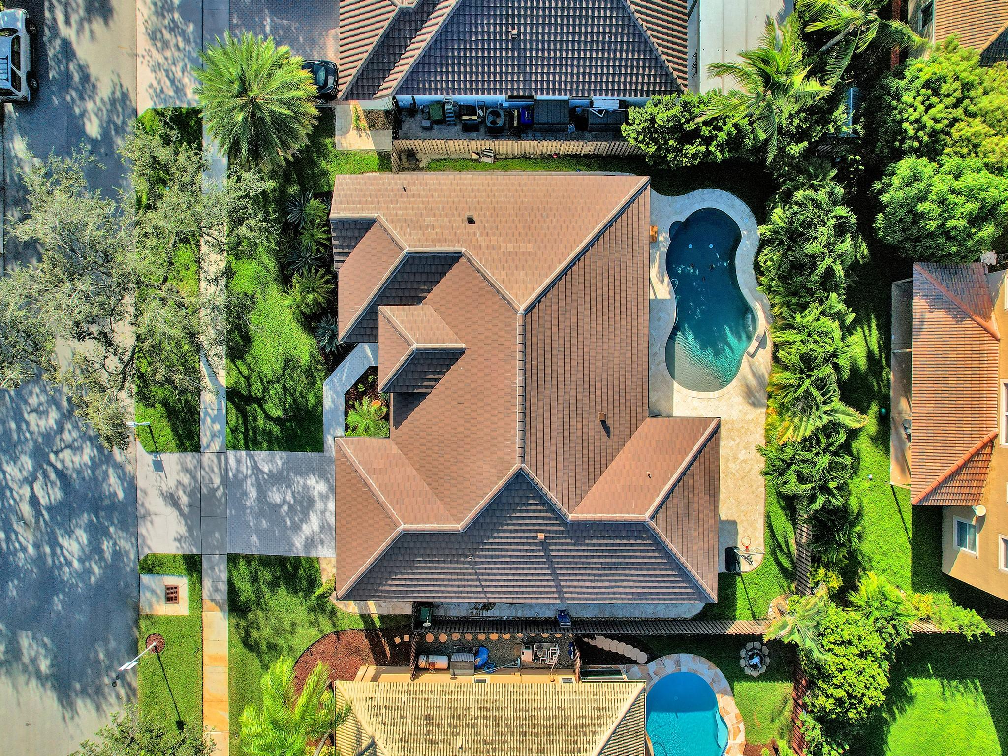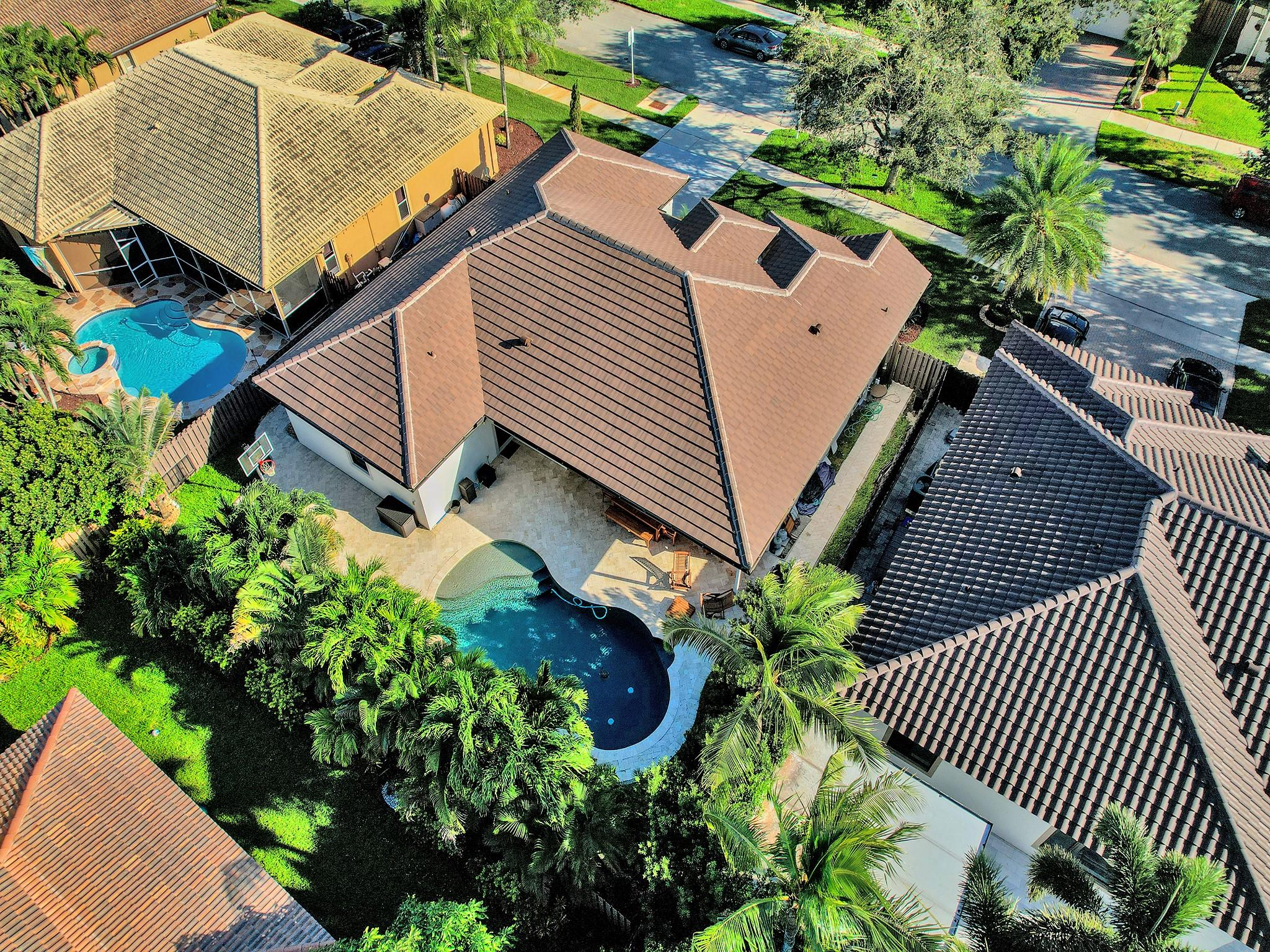 Stylish & Stately, updated pool home w NEW 2023 Roof & NEW Impact Windows. Lots of Natural light & luxe finishes, volume ceilings & laminate flooring throughout. Foyer entry w formal dining & living room overlooking the pool, patio & tropically landscaped fenced yard. Open kitchen w cafe nook, marble counters & island, wood cabs w added cabinetry off cafe area. Big family room opens to kitchen. Spacious Master Suite w views of pool, 2 large closets, Spa level updated bath w huge shower, custom cabinetry and adjacent bedroom/den w door into Master. Generous sized secondary bedrooms w walk-in closets and updated cabana bath. Large freeform heated pool w overflow water feature, marble paver patio, big sun deck & covered patio. Great location, manned gated community w top rated schools.