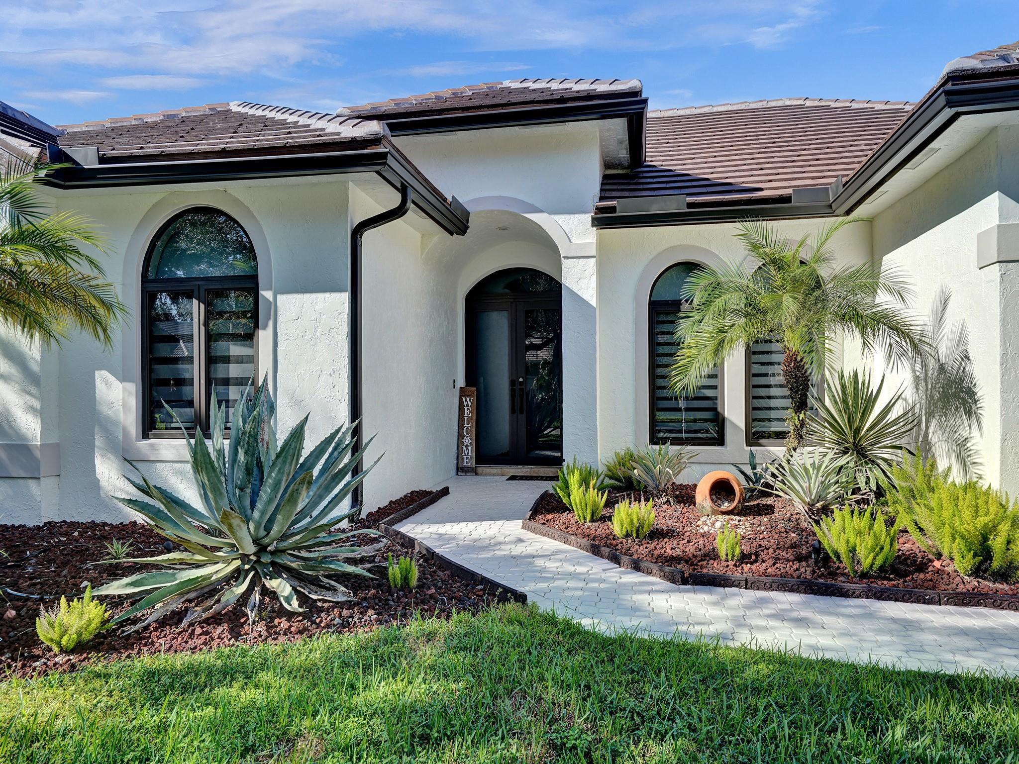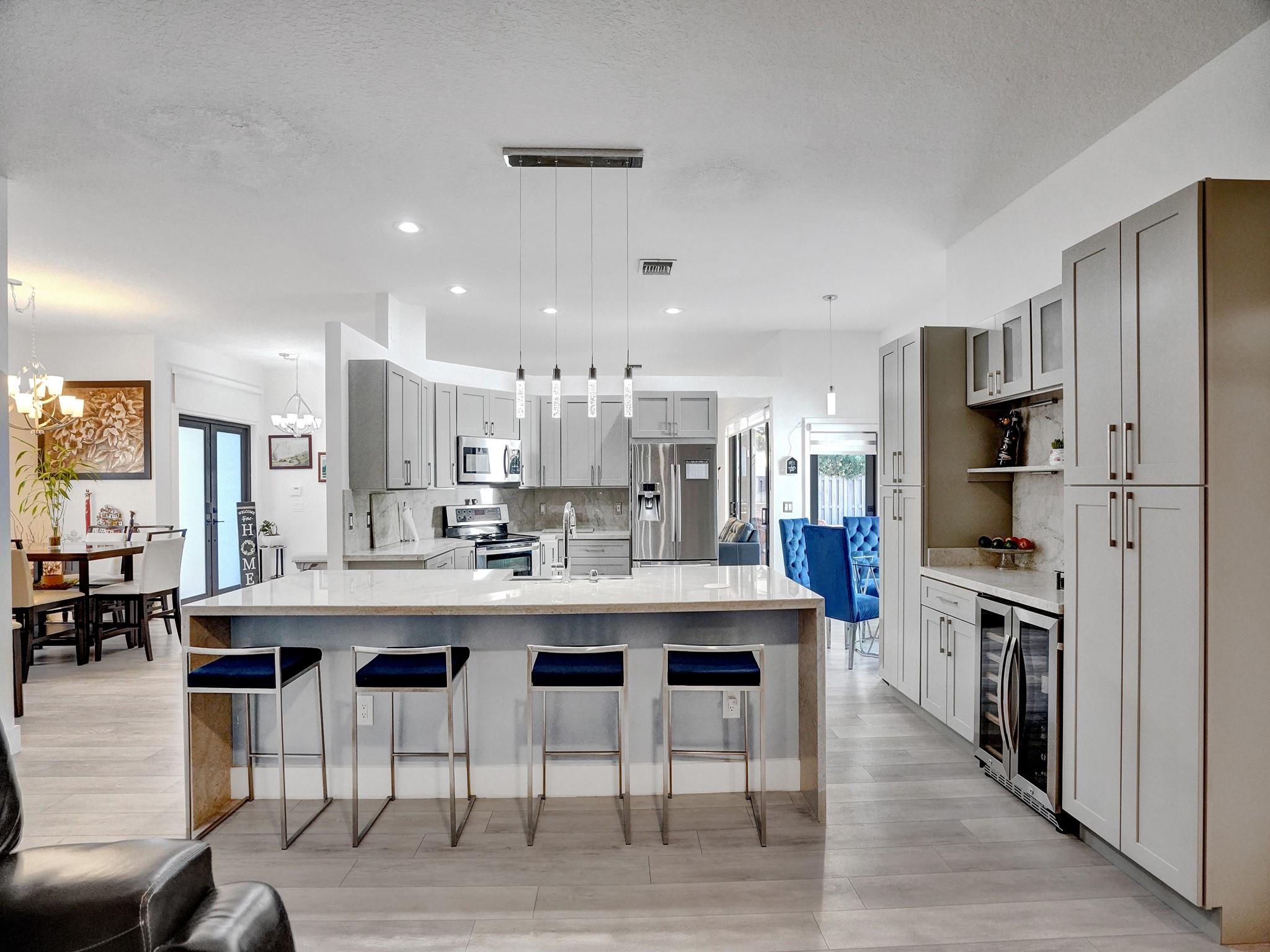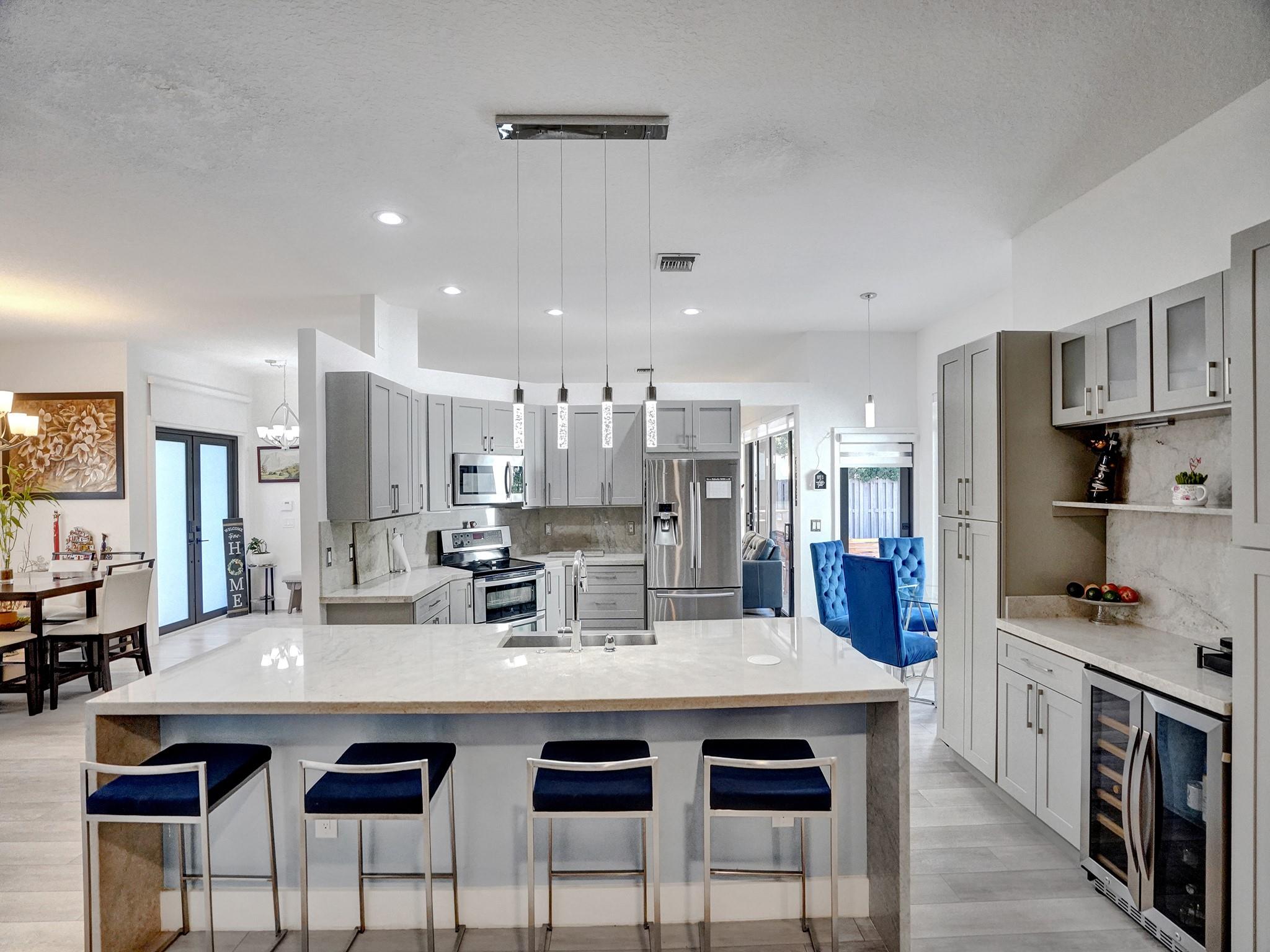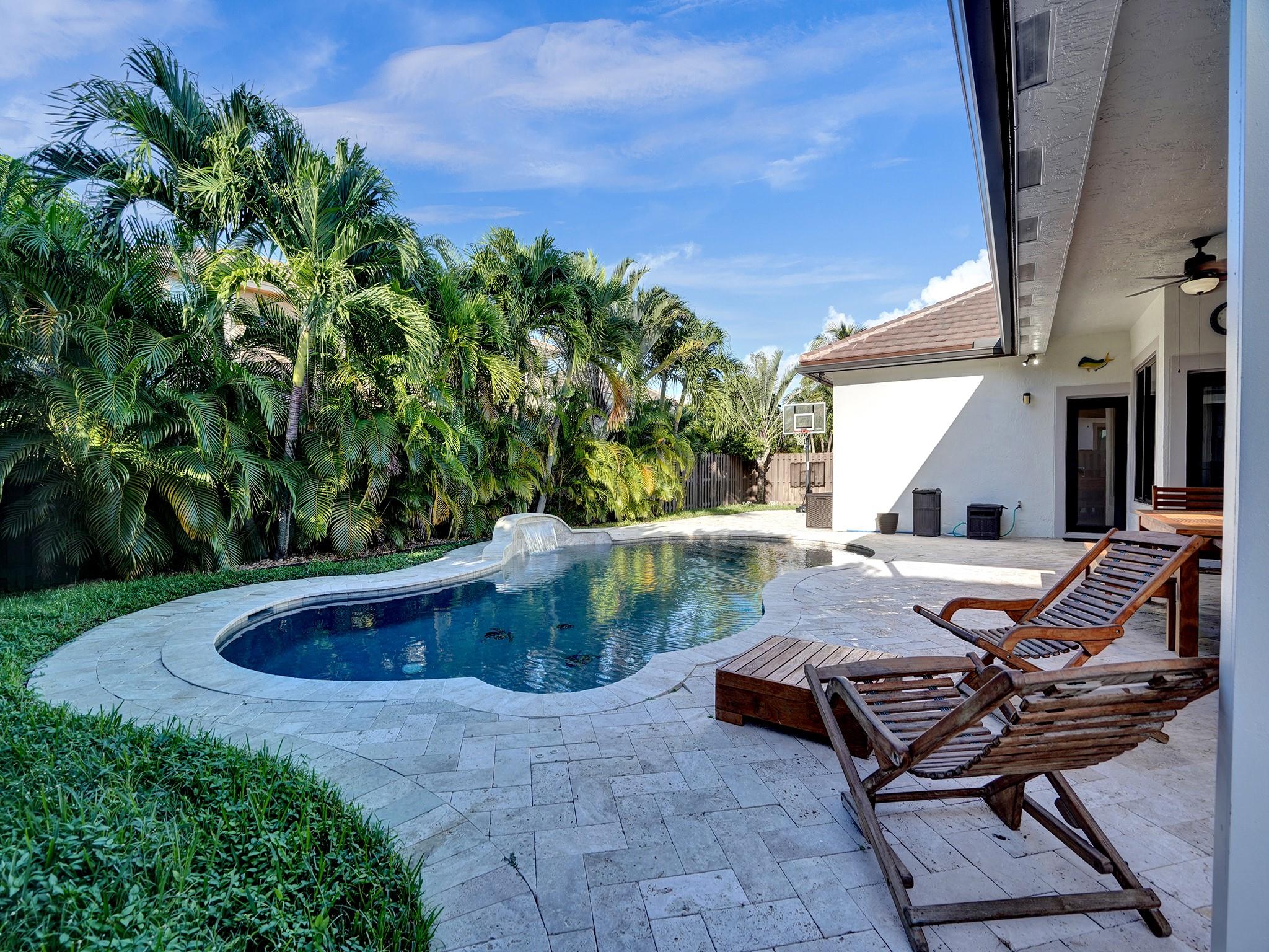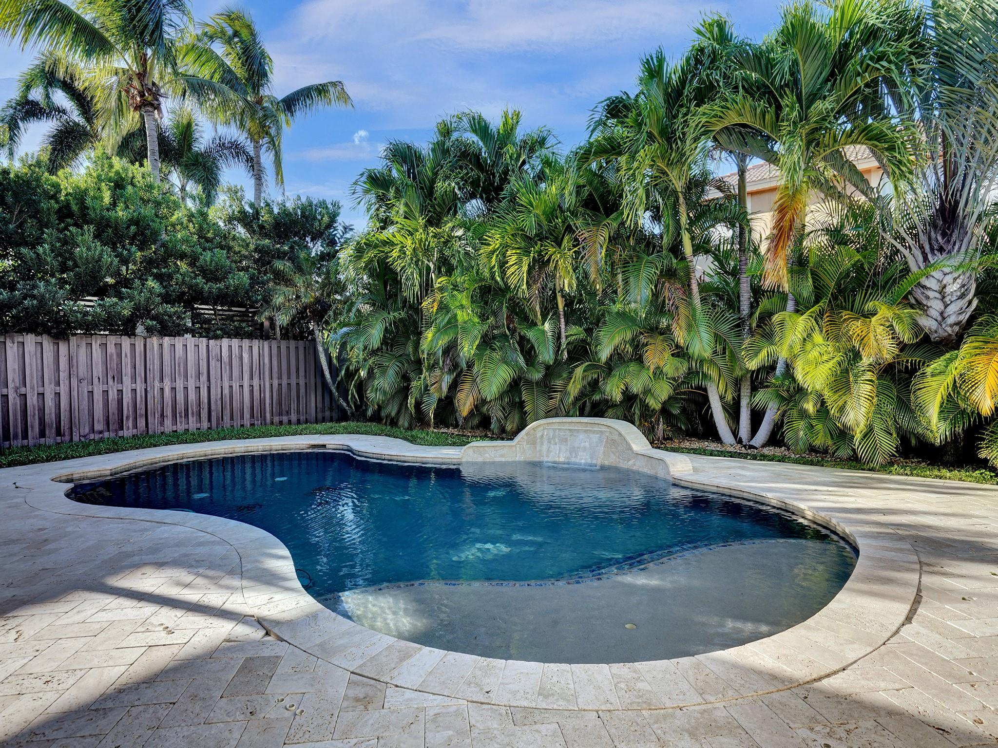 Stylish & Stately, updated pool home w NEW 2023 Roof & NEW Impact Windows. Lots of Natural light & luxe finishes, volume ceilings & laminate flooring throughout. Foyer entry w formal dining & living room overlooking the pool, patio & tropically landscaped fenced yard. Open kitchen w cafe nook, marble counters & island, wood cabs w added cabinetry off cafe area. Big family room opens to kitchen. Spacious Master Suite w views of pool, 2 large closets, Spa level updated bath w huge shower, custom cabinetry and adjacent bedroom/den w door into Master. Generous sized secondary bedrooms w walk-in closets and updated cabana bath. Large freeform heated pool w overflow water feature, marble paver patio, big sun deck & covered patio. Great location, manned gated community w top rated schools.