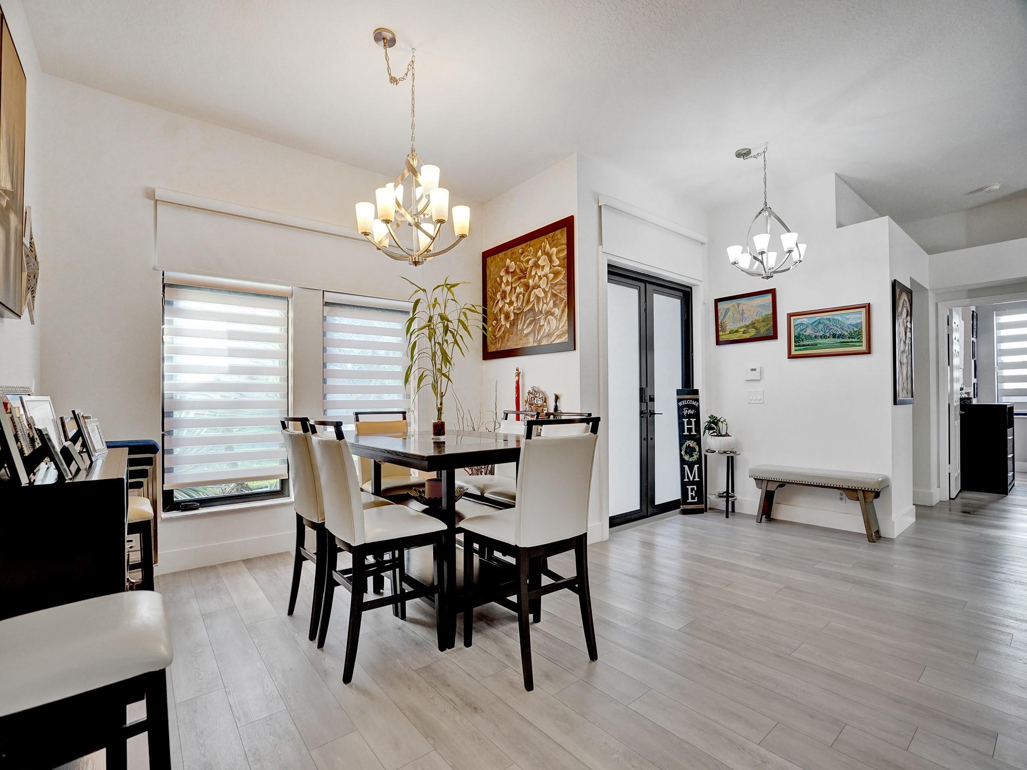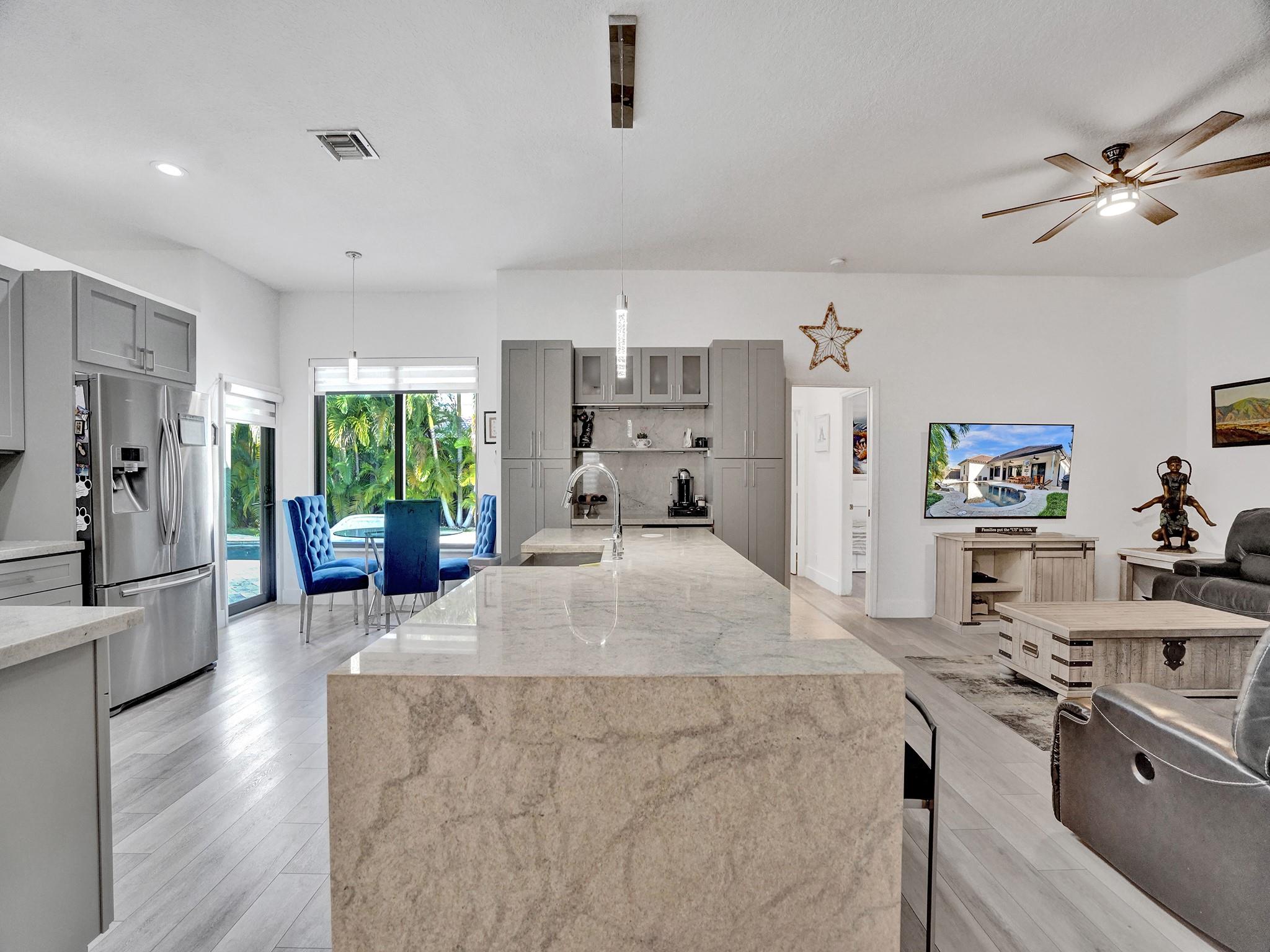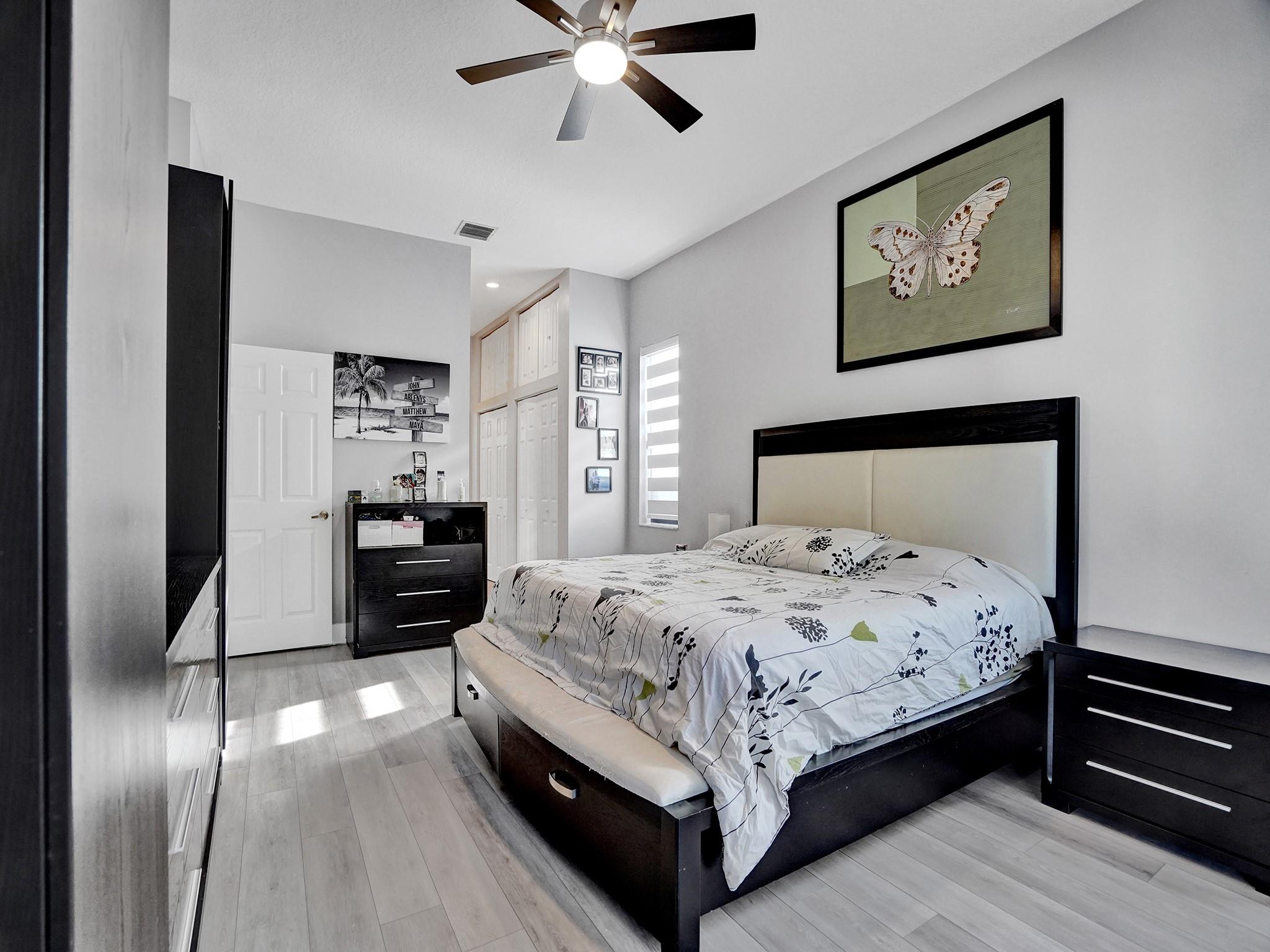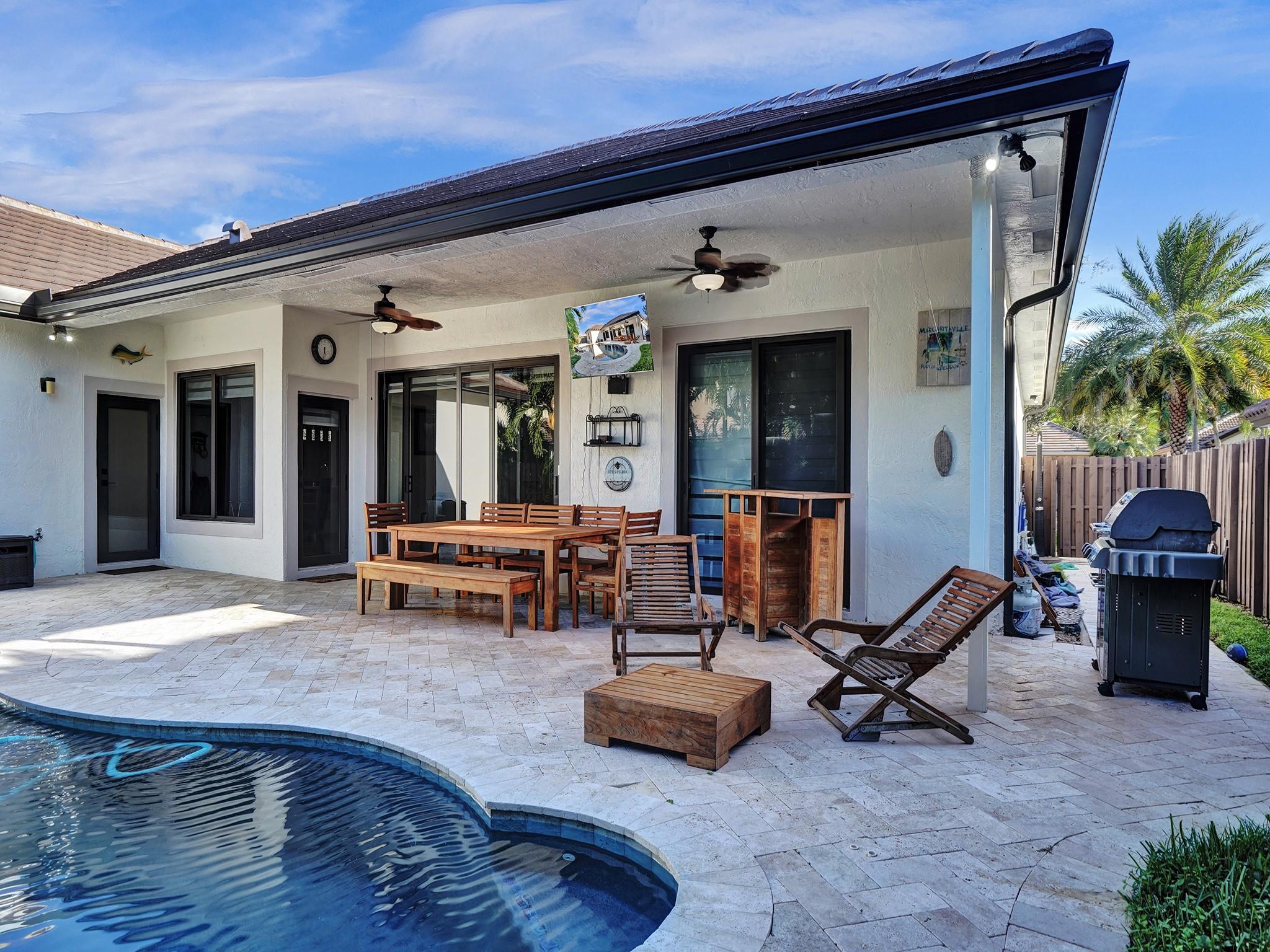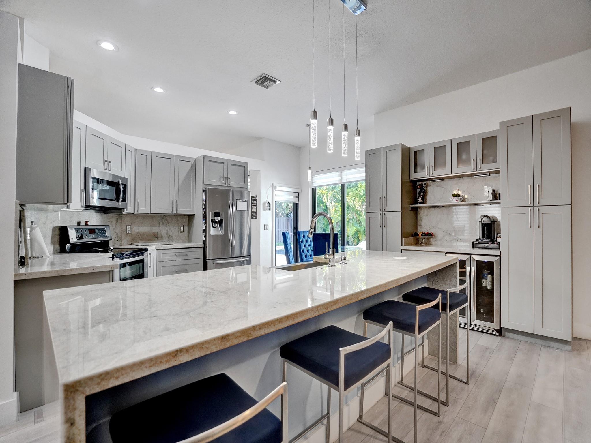 Stylish & Stately, updated pool home w NEW 2023 Roof & NEW Impact Windows. Lots of Natural light & luxe finishes, volume ceilings & laminate flooring throughout. Foyer entry w formal dining & living room overlooking the pool, patio & tropically landscaped fenced yard. Open kitchen w cafe nook, marble counters & island, wood cabs w added cabinetry off cafe area. Big family room opens to kitchen. Spacious Master Suite w views of pool, 2 large closets, Spa level updated bath w huge shower, custom cabinetry and adjacent bedroom/den w door into Master. Generous sized secondary bedrooms w walk-in closets and updated cabana bath. Large freeform heated pool w overflow water feature, marble paver patio, big sun deck & covered patio. Great location, manned gated community w top rated schools.