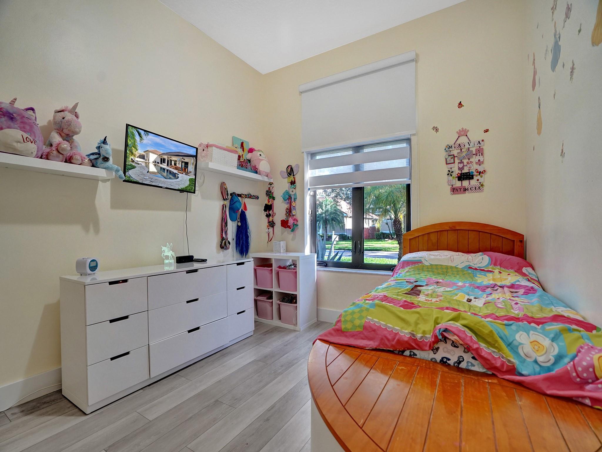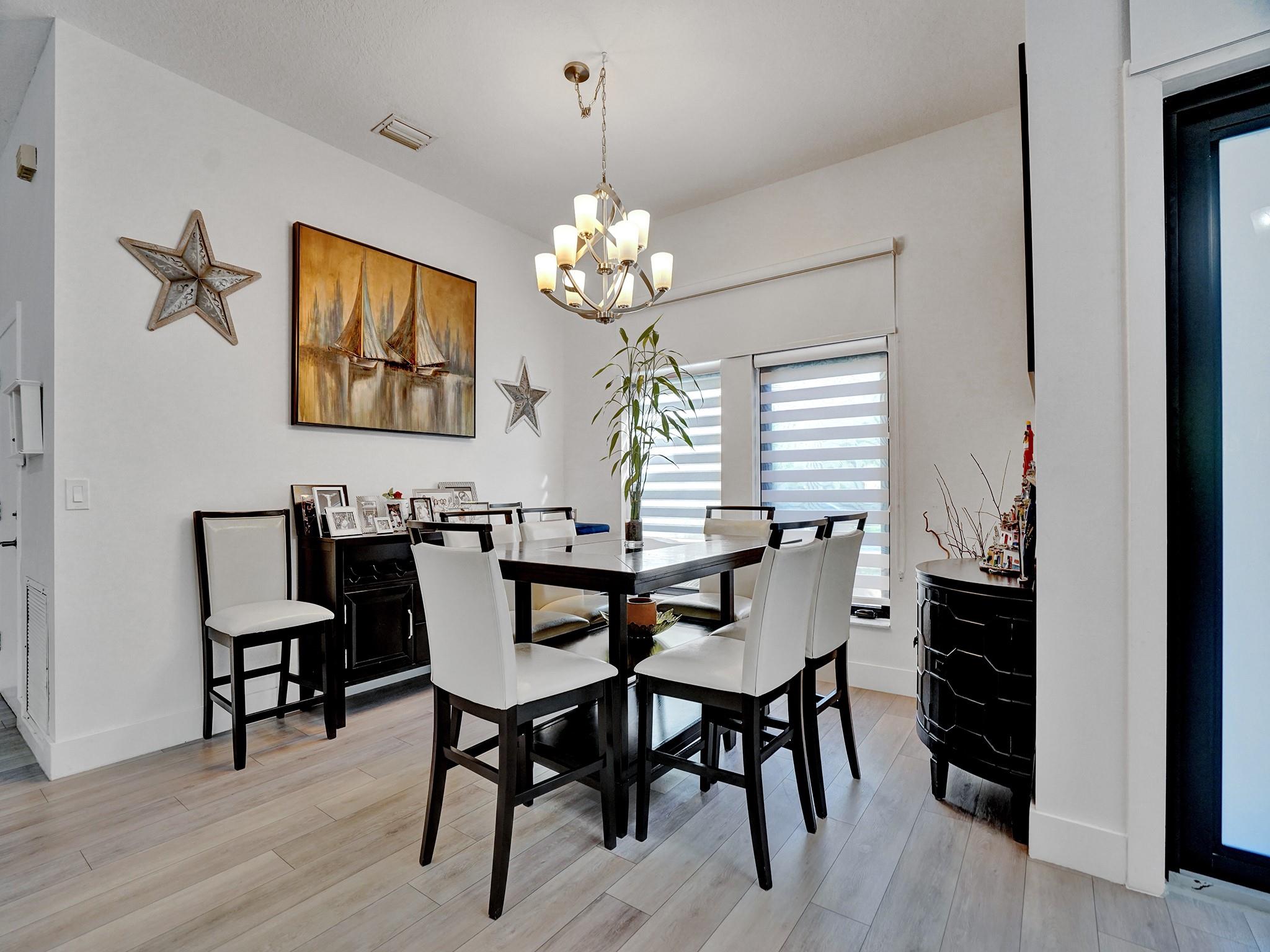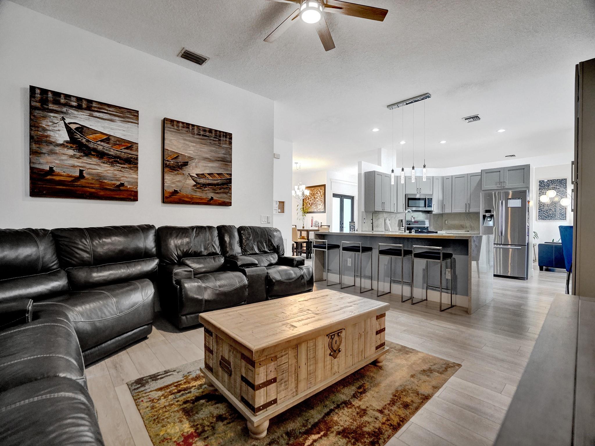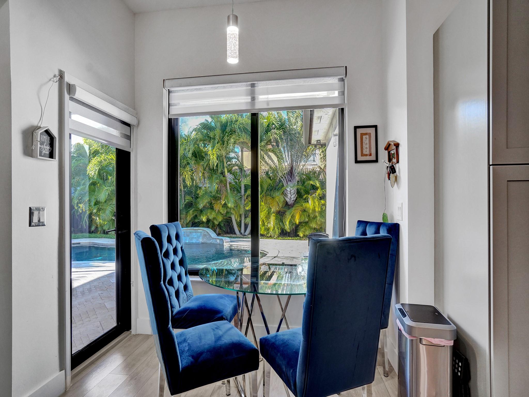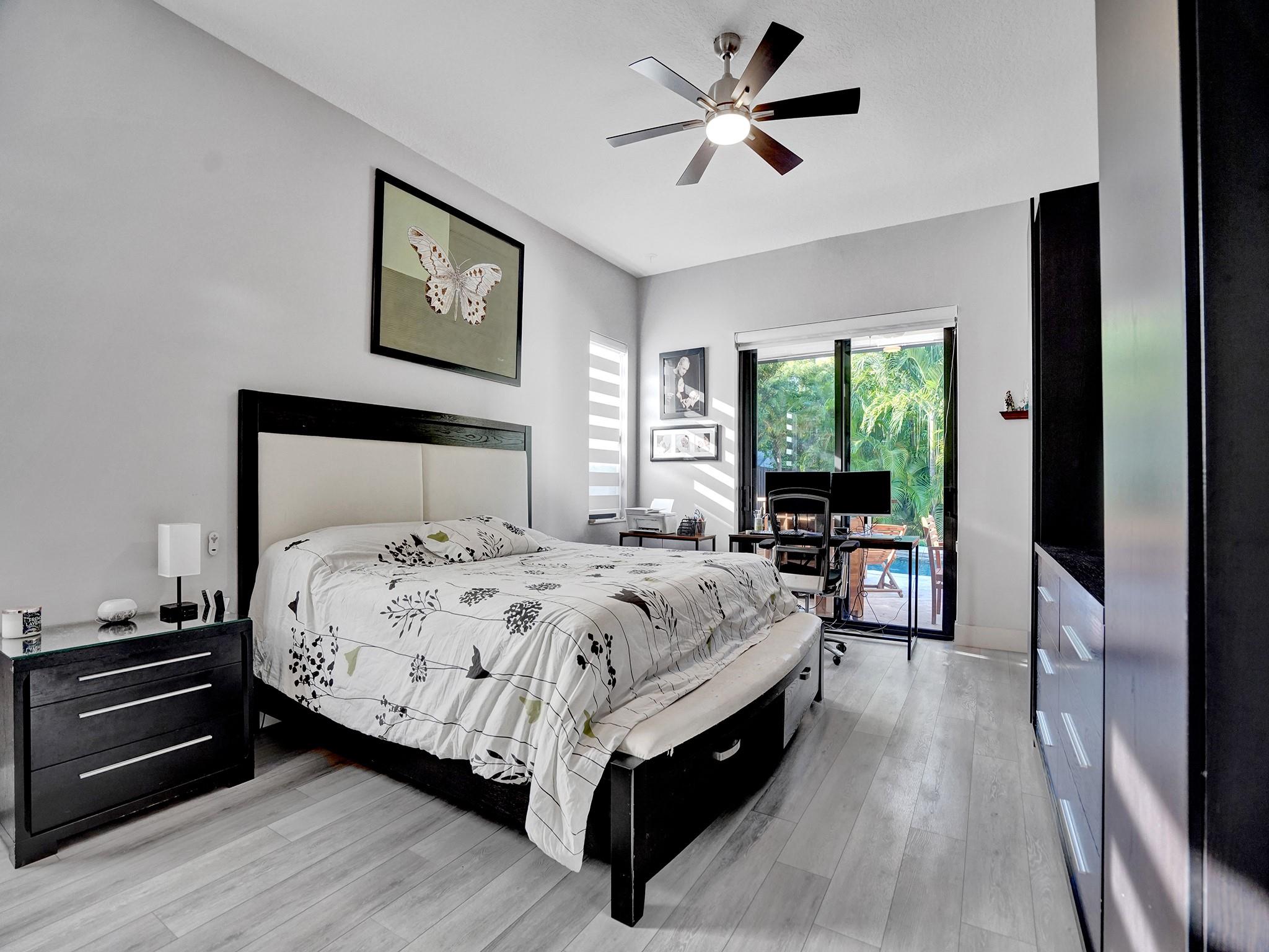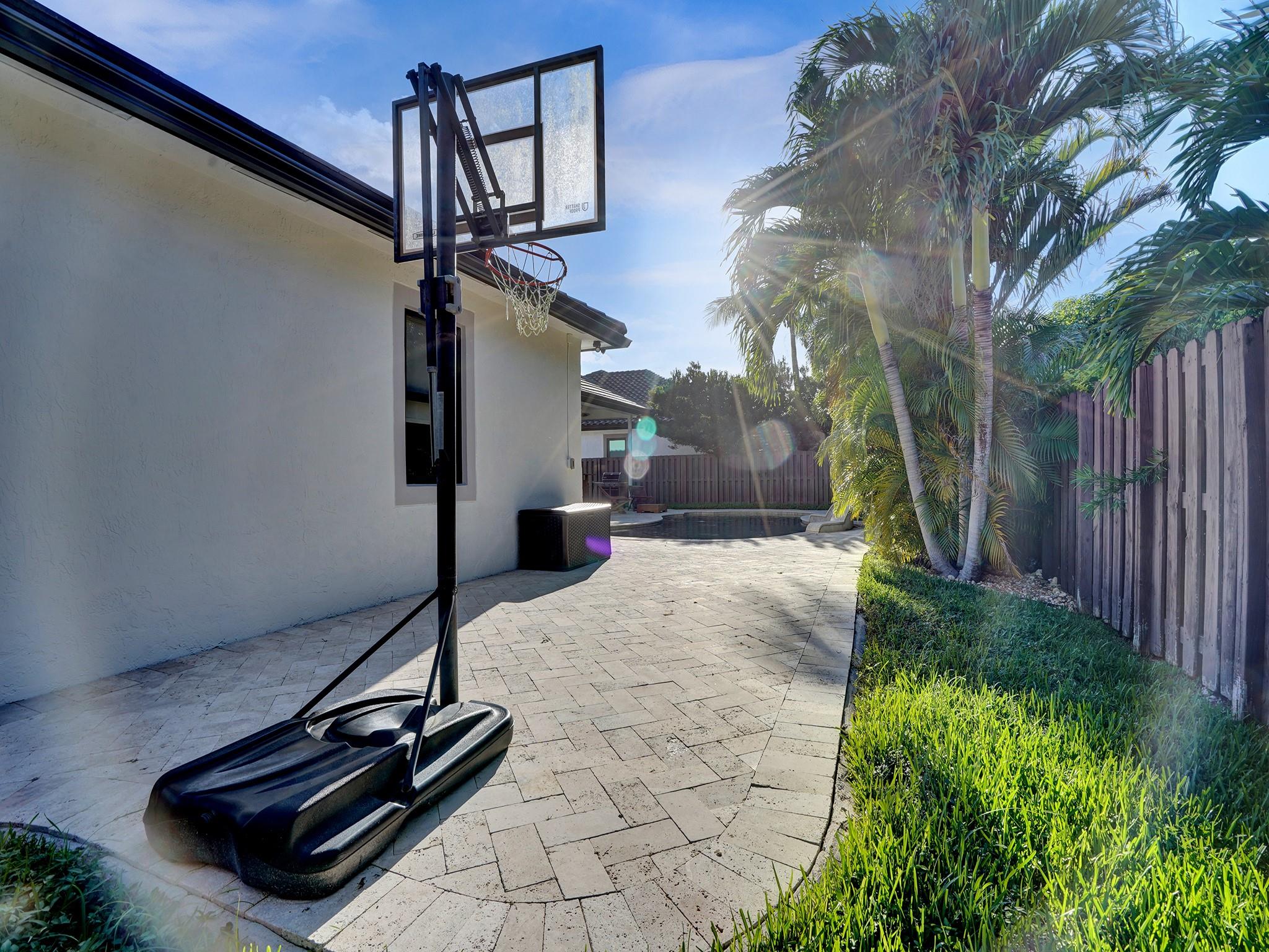 Stylish & Stately, updated pool home w NEW 2023 Roof & NEW Impact Windows. Lots of Natural light & luxe finishes, volume ceilings & laminate flooring throughout. Foyer entry w formal dining & living room overlooking the pool, patio & tropically landscaped fenced yard. Open kitchen w cafe nook, marble counters & island, wood cabs w added cabinetry off cafe area. Big family room opens to kitchen. Spacious Master Suite w views of pool, 2 large closets, Spa level updated bath w huge shower, custom cabinetry and adjacent bedroom/den w door into Master. Generous sized secondary bedrooms w walk-in closets and updated cabana bath. Large freeform heated pool w overflow water feature, marble paver patio, big sun deck & covered patio. Great location, manned gated community w top rated schools.