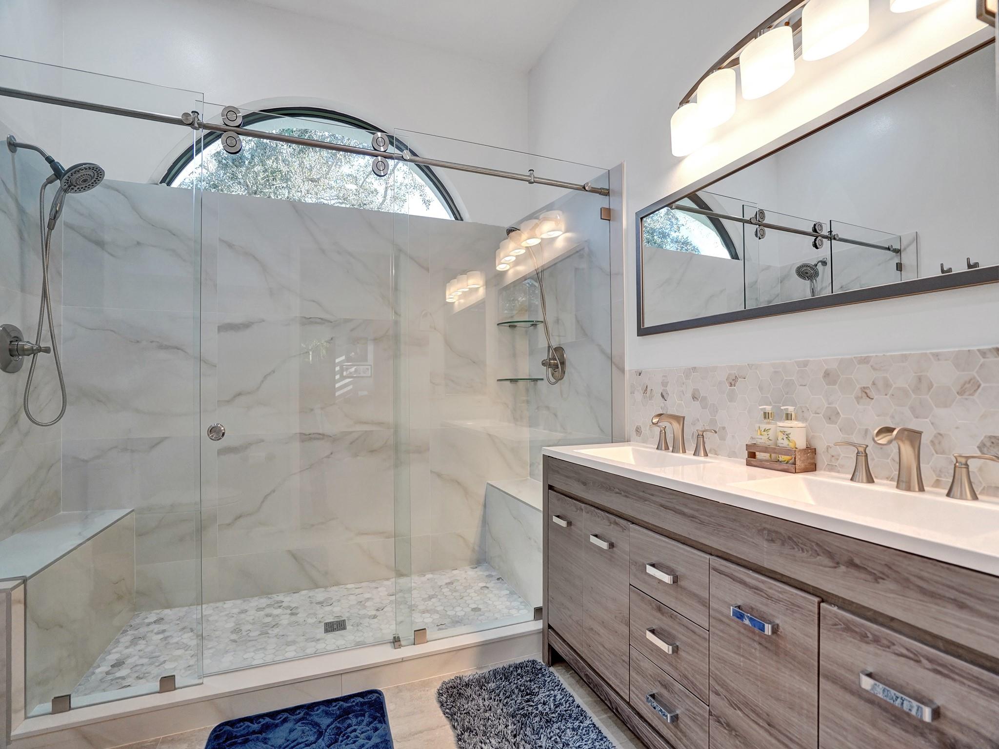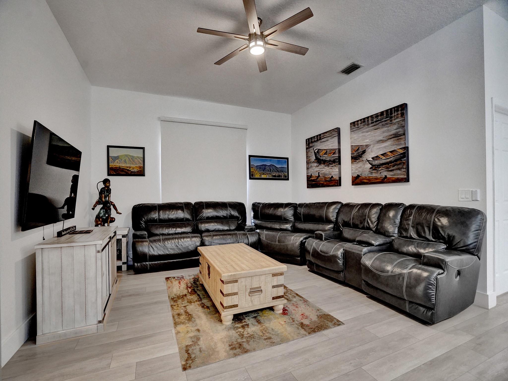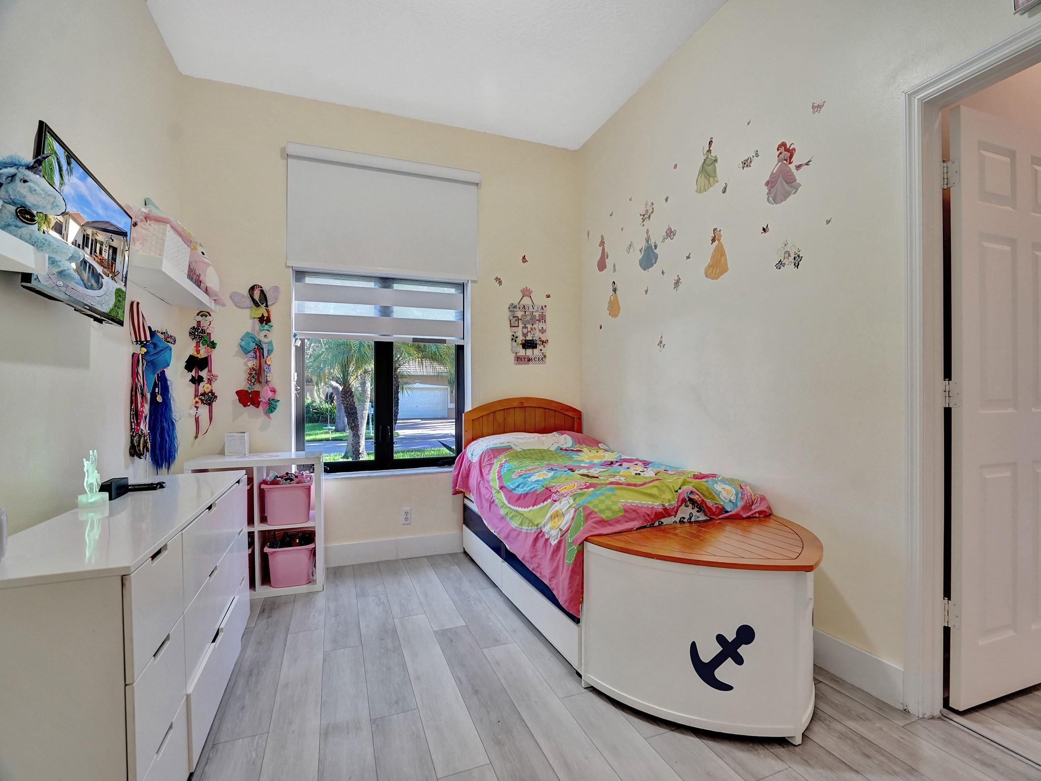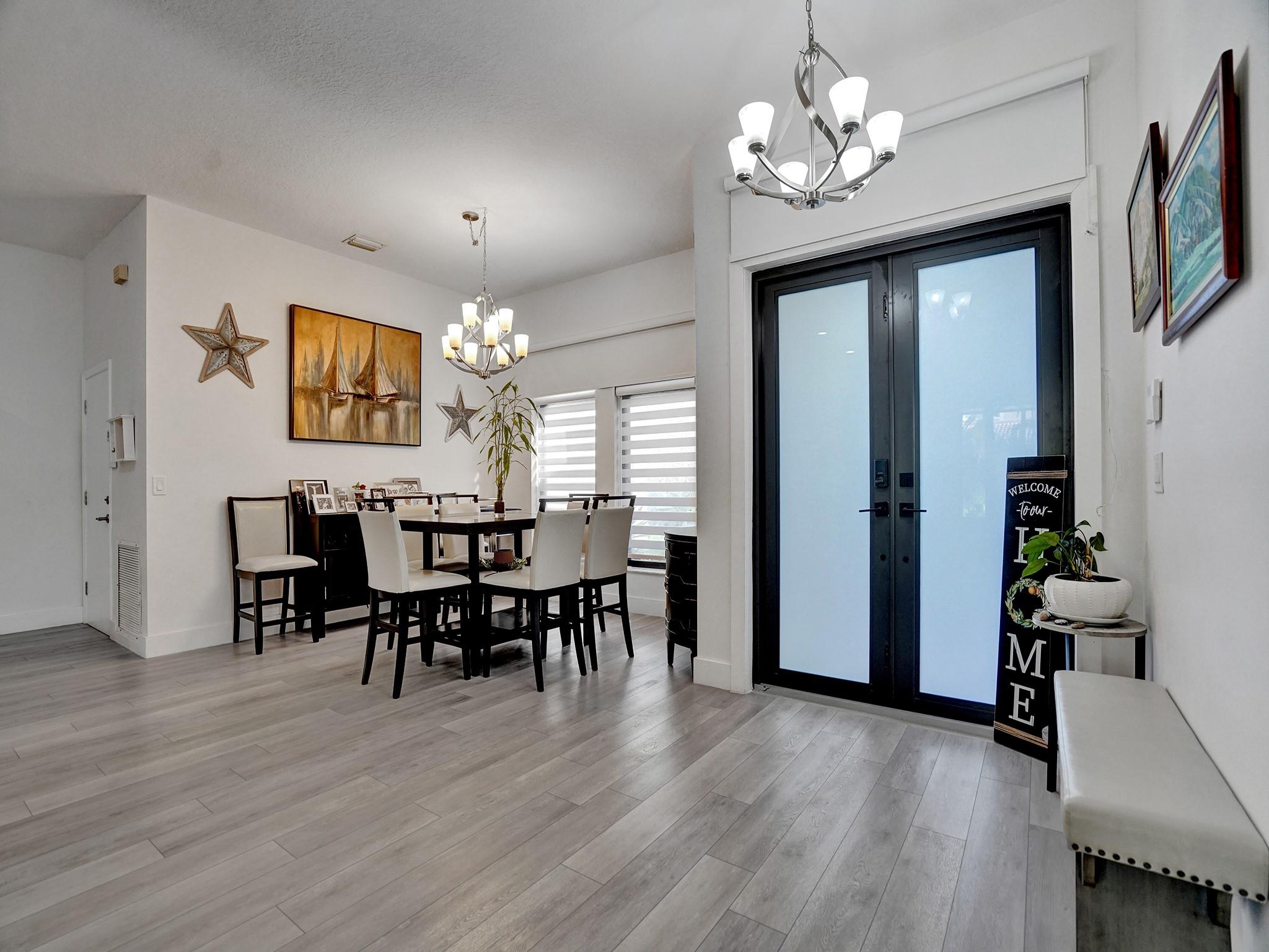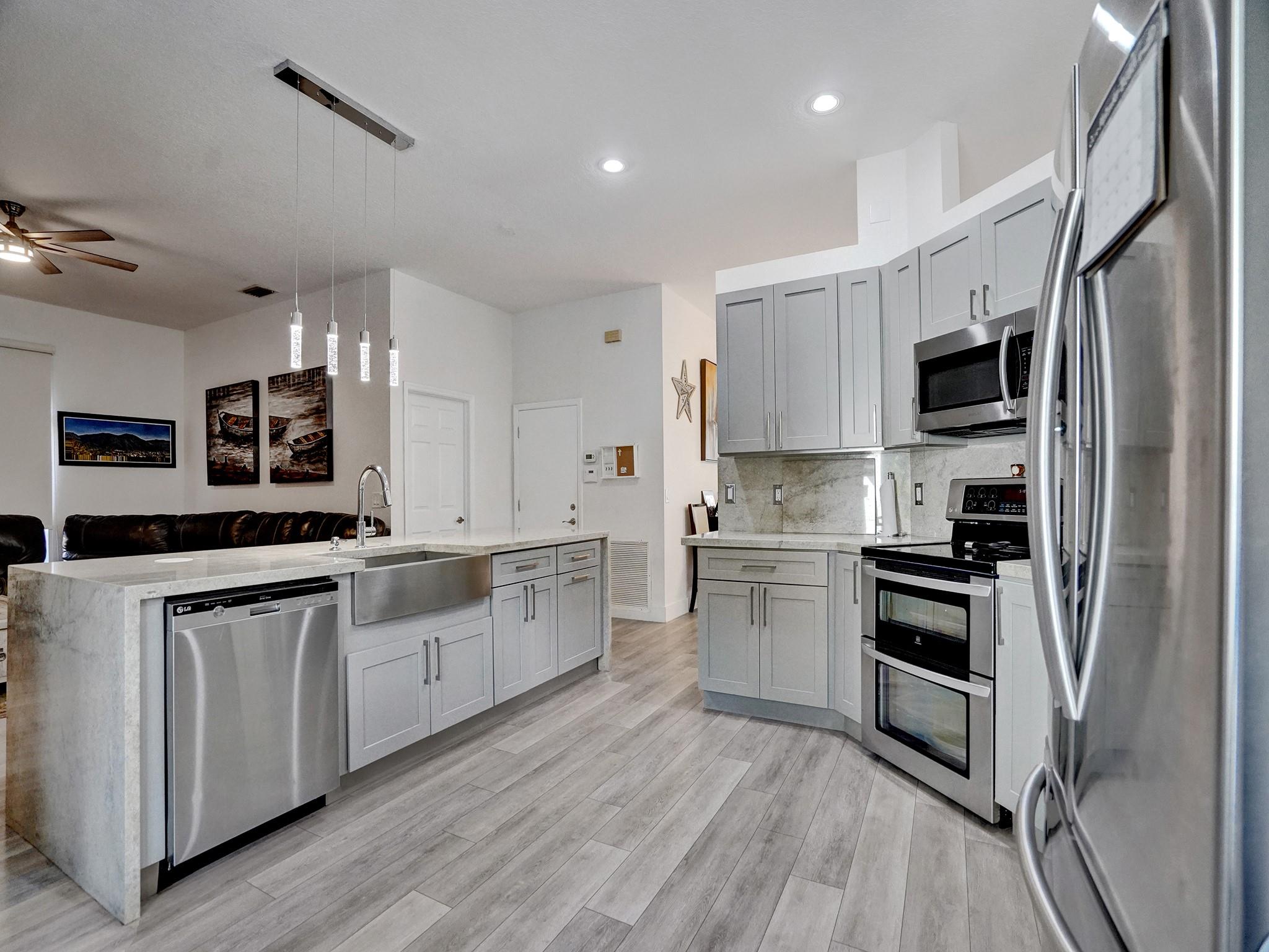 Stylish & Stately, updated pool home w NEW 2023 Roof & NEW Impact Windows. Lots of Natural light & luxe finishes, volume ceilings & laminate flooring throughout. Foyer entry w formal dining & living room overlooking the pool, patio & tropically landscaped fenced yard. Open kitchen w cafe nook, marble counters & island, wood cabs w added cabinetry off cafe area. Big family room opens to kitchen. Spacious Master Suite w views of pool, 2 large closets, Spa level updated bath w huge shower, custom cabinetry and adjacent bedroom/den w door into Master. Generous sized secondary bedrooms w walk-in closets and updated cabana bath. Large freeform heated pool w overflow water feature, marble paver patio, big sun deck & covered patio. Great location, manned gated community w top rated schools.