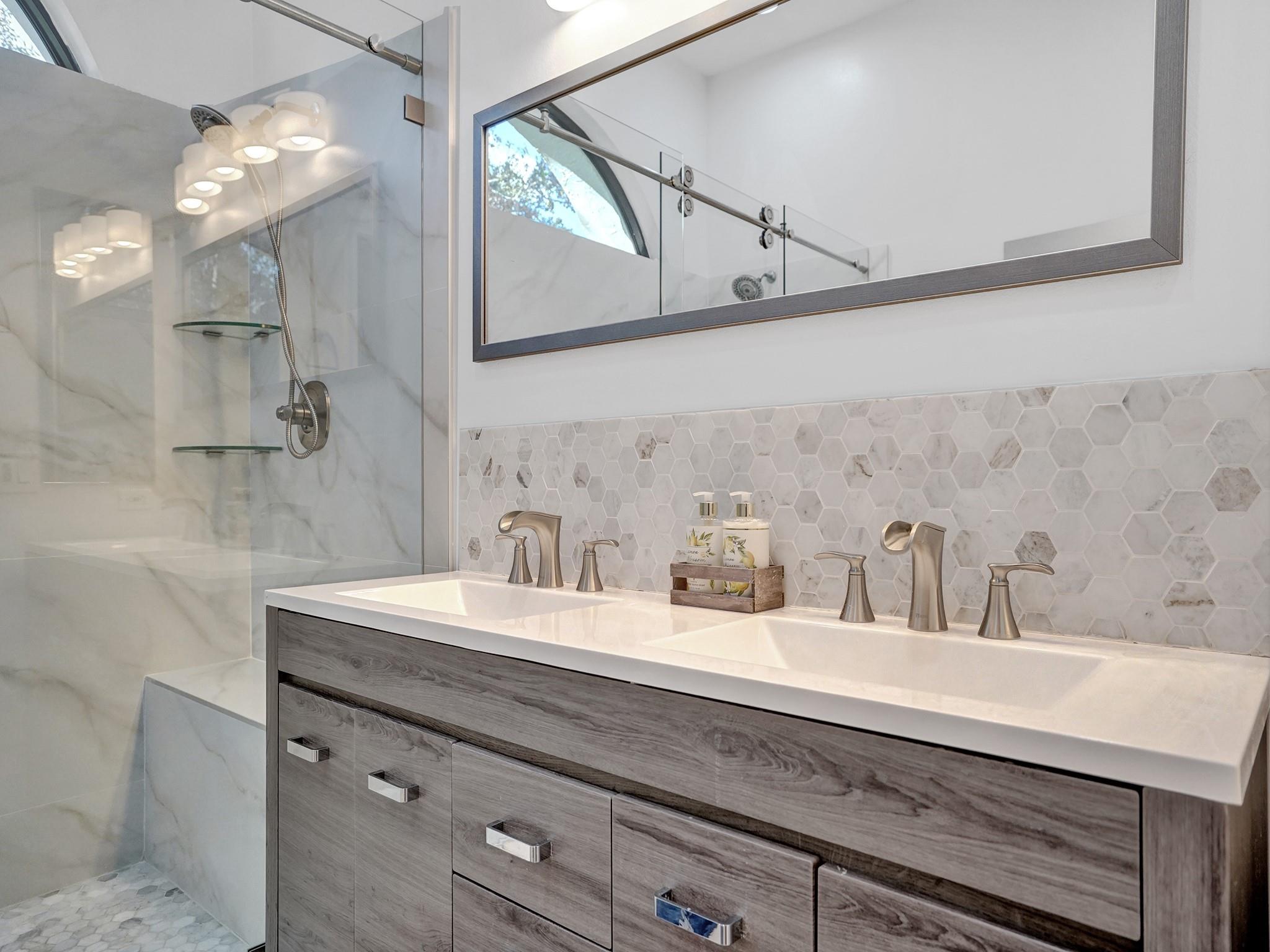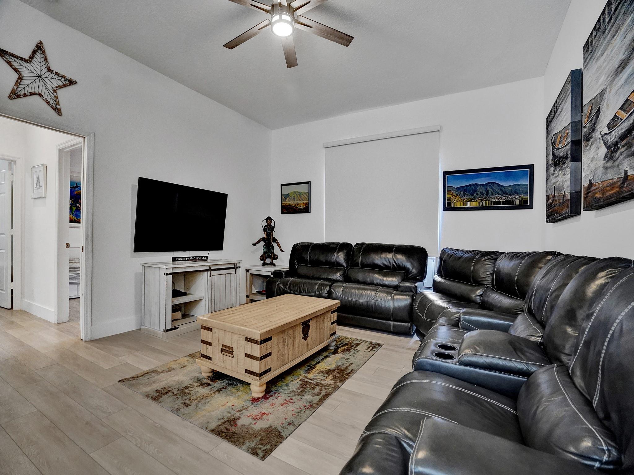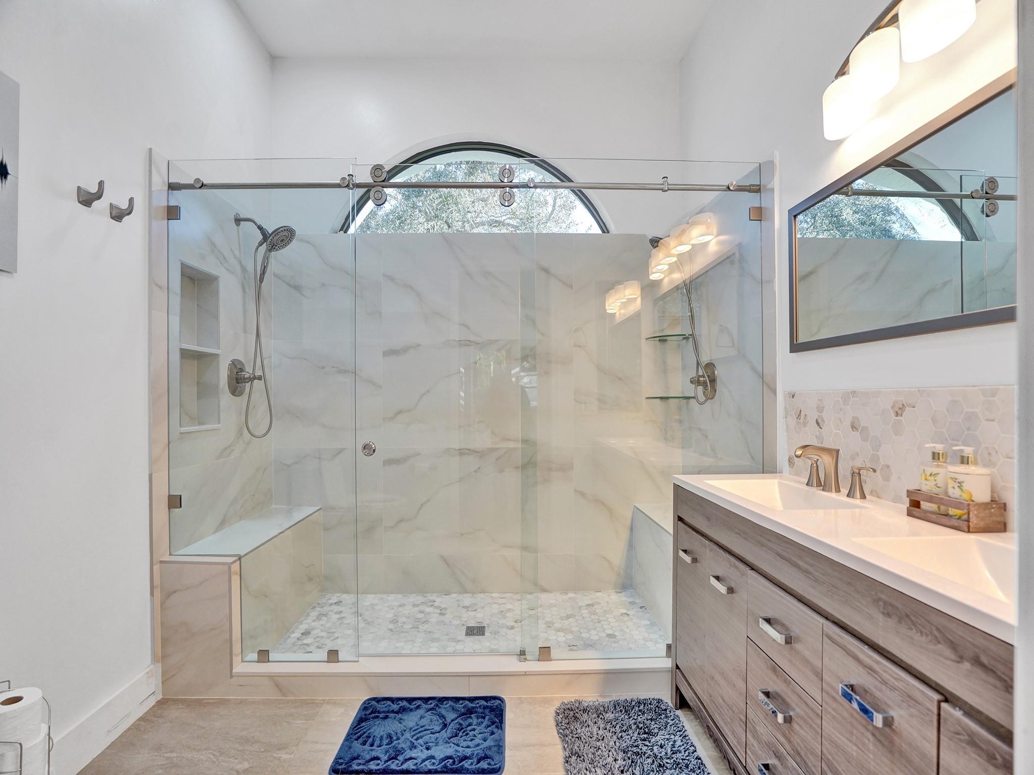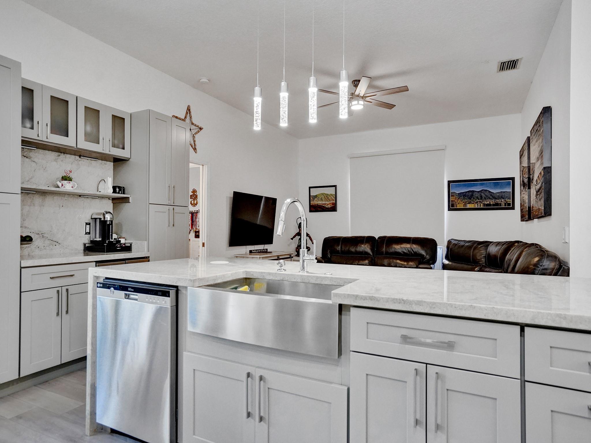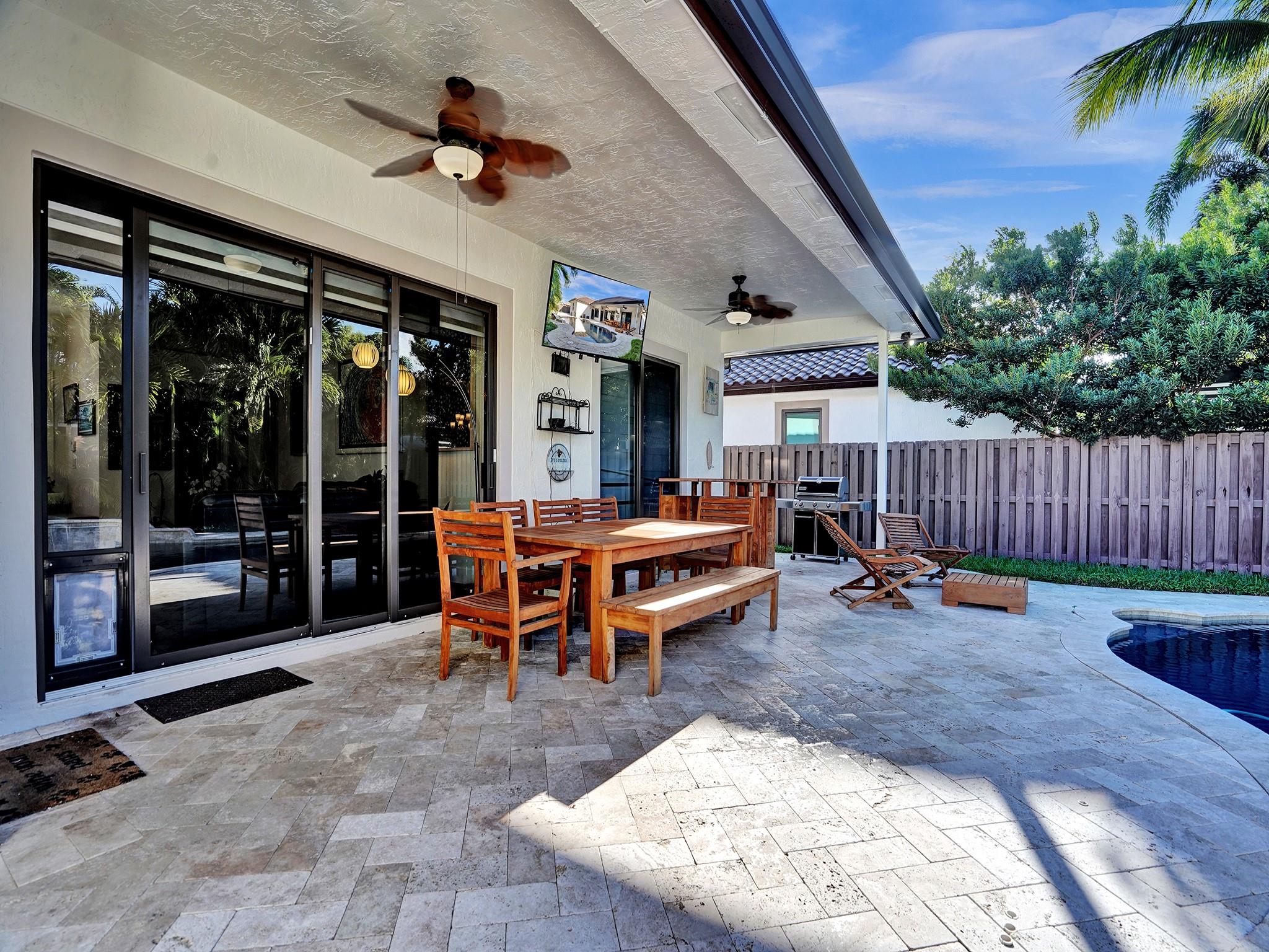 Stylish & Stately, updated pool home w NEW 2023 Roof & NEW Impact Windows. Lots of Natural light & luxe finishes, volume ceilings & laminate flooring throughout. Foyer entry w formal dining & living room overlooking the pool, patio & tropically landscaped fenced yard. Open kitchen w cafe nook, marble counters & island, wood cabs w added cabinetry off cafe area. Big family room opens to kitchen. Spacious Master Suite w views of pool, 2 large closets, Spa level updated bath w huge shower, custom cabinetry and adjacent bedroom/den w door into Master. Generous sized secondary bedrooms w walk-in closets and updated cabana bath. Large freeform heated pool w overflow water feature, marble paver patio, big sun deck & covered patio. Great location, manned gated community w top rated schools.