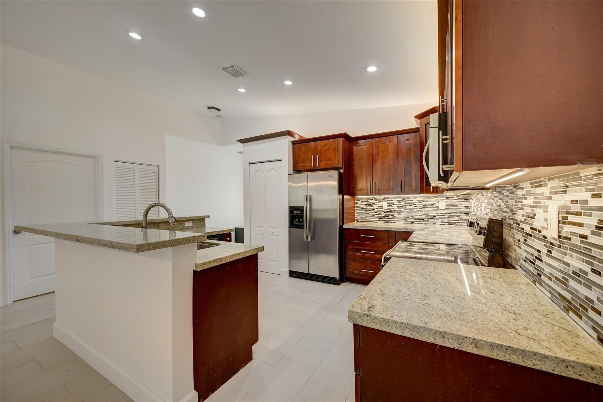 Stunning, updated Centrally located 3 bedroom, 2 bathroom + a den single family home in Ft. Lauderdale! NO HOA allows for immediate renting, so bring your investors, FHA & VA buyers! This home features a gourmet kitchen, complete w/ wood cabinets, granite countertops, & SS appliances. The large primary suite features a sitting area, a luxurious en-suite w/ vanities with granite countertops, a whirlpool spa tub, and large walk-in closet. Other features include tile floor in the main living area, wood floor in the bedrooms, vaulted ceilings, recessed lighting in the kitchen, a laundry room and impact windows for extra protection! The large fenced in backyard has ample room for a pool, and tons of room for the kids and dogs to play. Close to great dining, shopping, and highways.