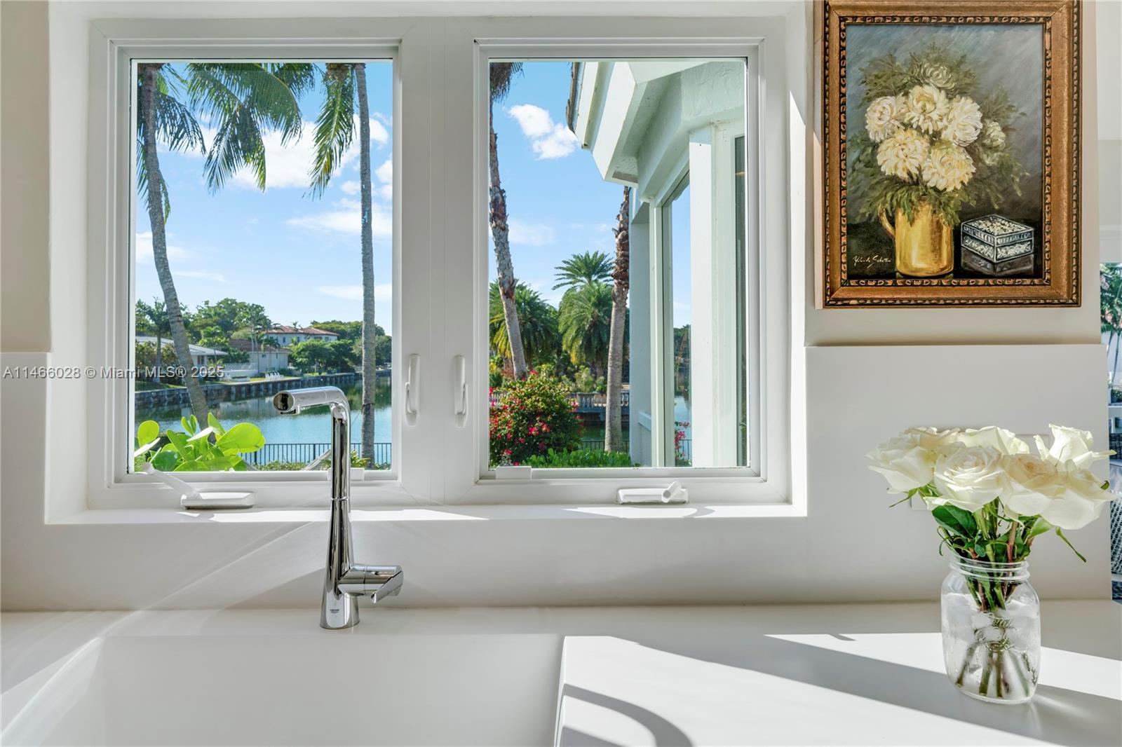 Welcome to your dream waterfront home in Gables by the Sea, a prestigious gated community offering tranquility and luxury. This stunning 2-story residence has been impeccably renovated with top-tier finishes, seamlessly blending sophistication and serenity. Soaring ceilings and Porcelanosa floors frame breathtaking water views. The primary suite boasts high ceilings, adding a sense of space and flooding the room w/ natural light, while the private balcony overlooks lush tropical gardens and peaceful waterfront vistas. Relax in the Jacuzzi, cascading into a sparkling saline-chlorine pool. The gourmet kitchen, featuring a grand quartzite island and Thermador & Wolf appliances, is a chef’s delight. Every gorgeous sunset feels magical in your private oasis—resort-style living at its finest