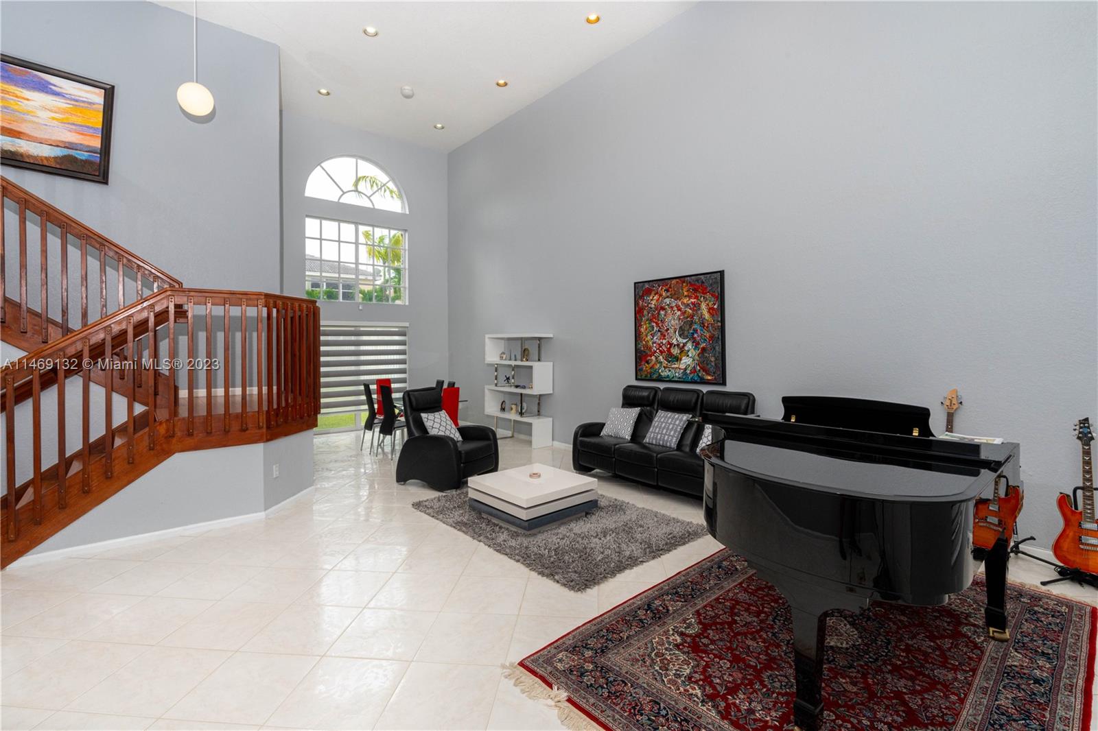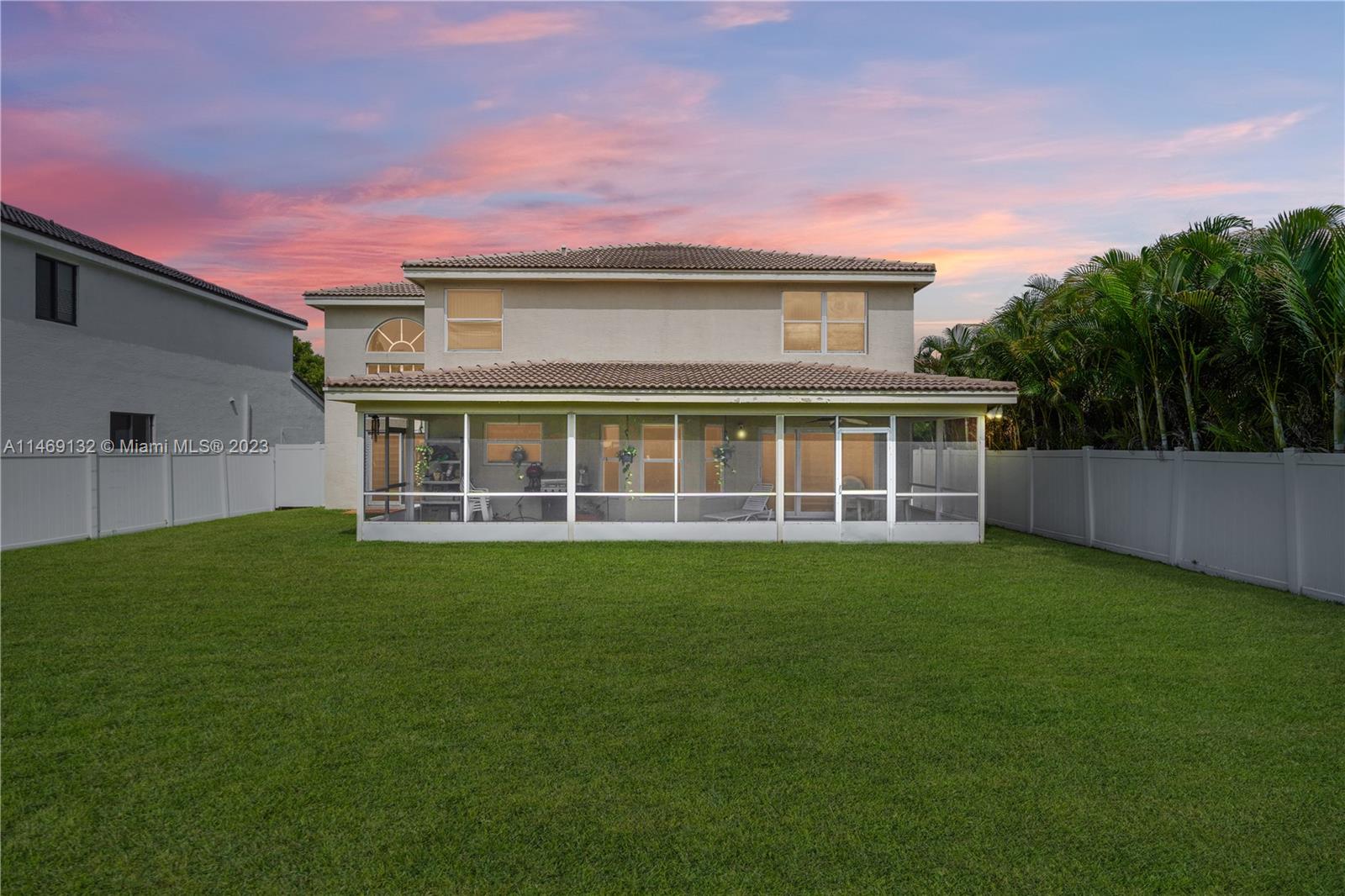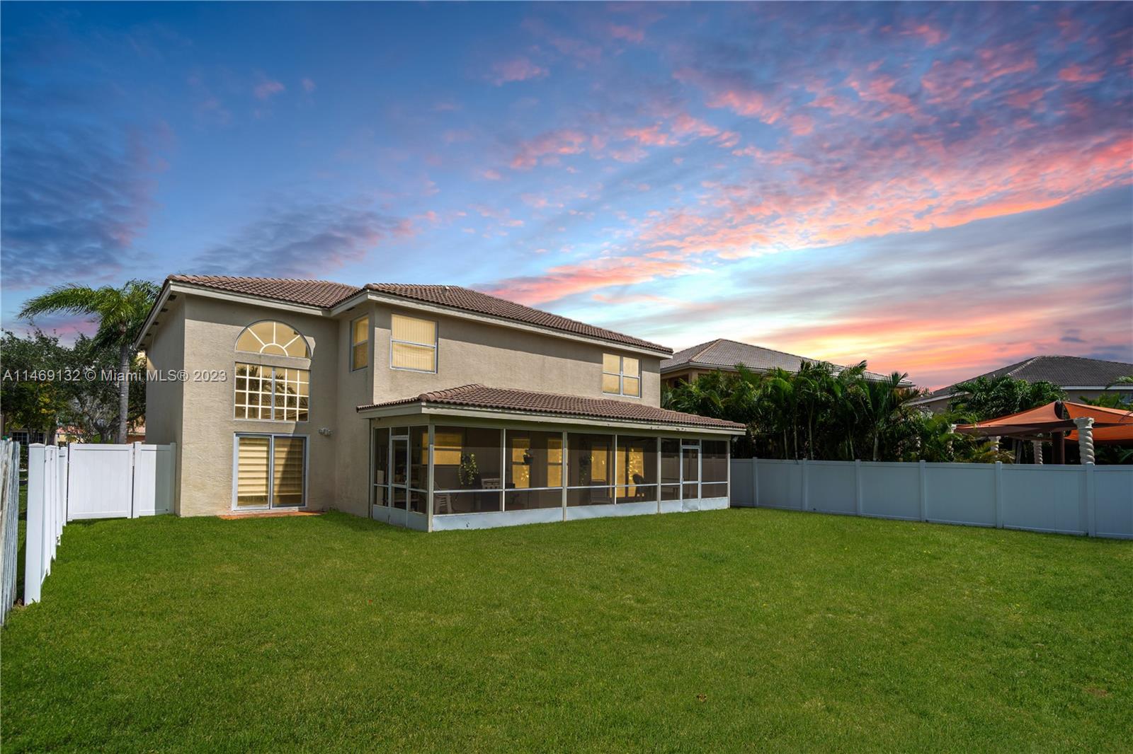 Beautiful and spacious 5 bedrooms + office/den, 3 bath with 3 car garage home located in quiet and tree lined community in West Miramar. Home features lot of natural light, high vaulted ceilings, new kitchen with wood cabinets and quartz countertops, new dishwasher, pantry, recessed spot lights throughout. First floor has new zebra blinds and hurricane impact windows, neutral color tile, one bedroom downstairs currently used as entertainment/movie room, one full bathroom, laundry room, fully screened patio great for entertaining and cookouts. Second floor has laminate floors throughout, master bedroom has 2 walk in closet (his and hers) spacious master bathroom with two vanities, roman bathtub and separate shower, 3rd, 4th and 5th bedroom and a home office. Welcome home!