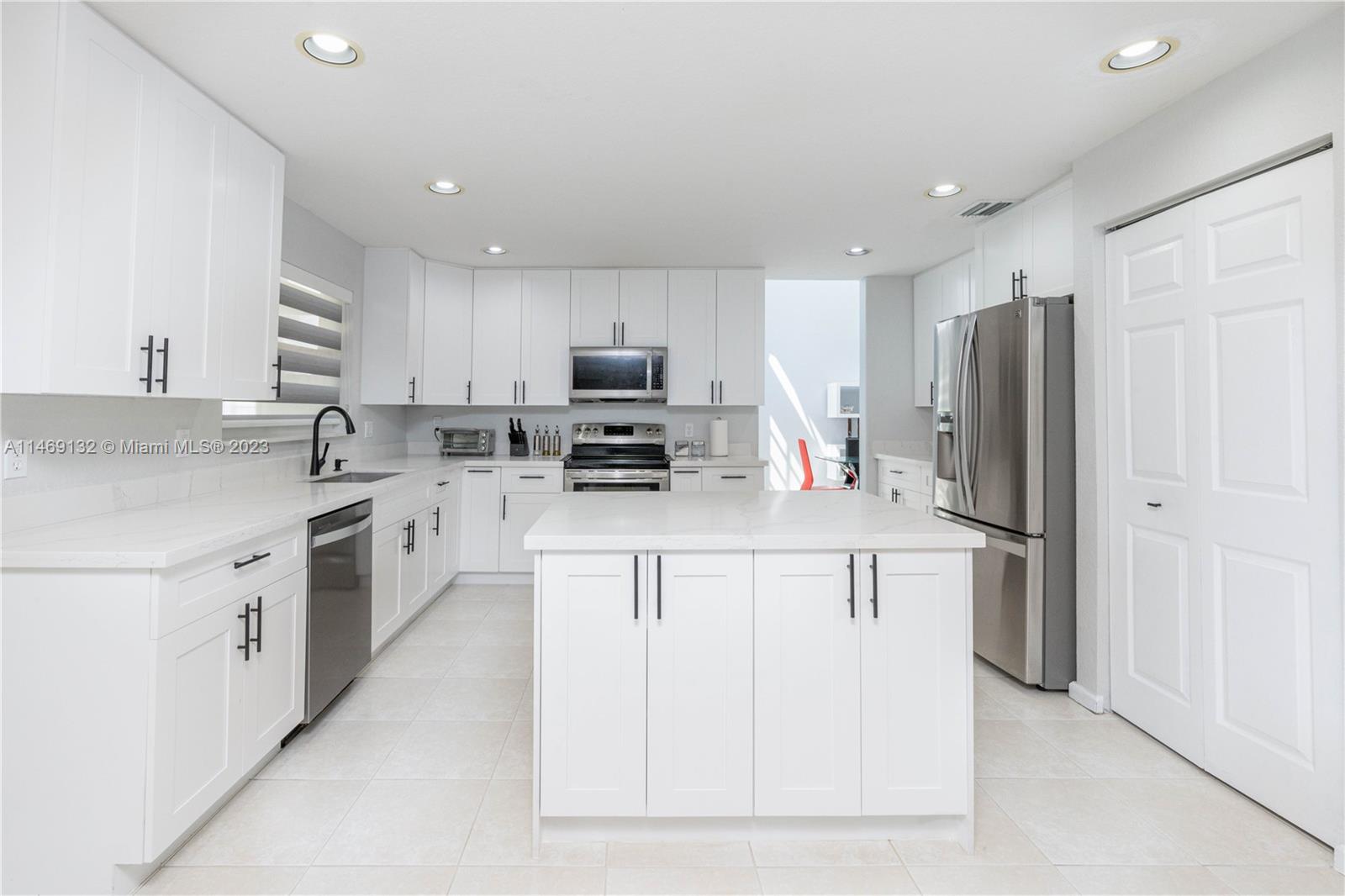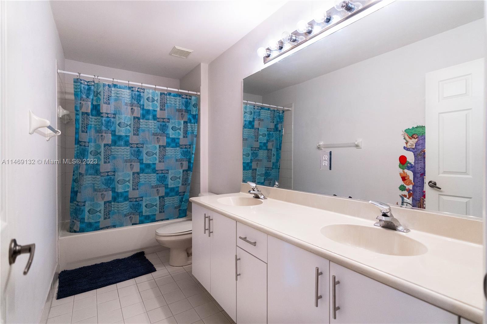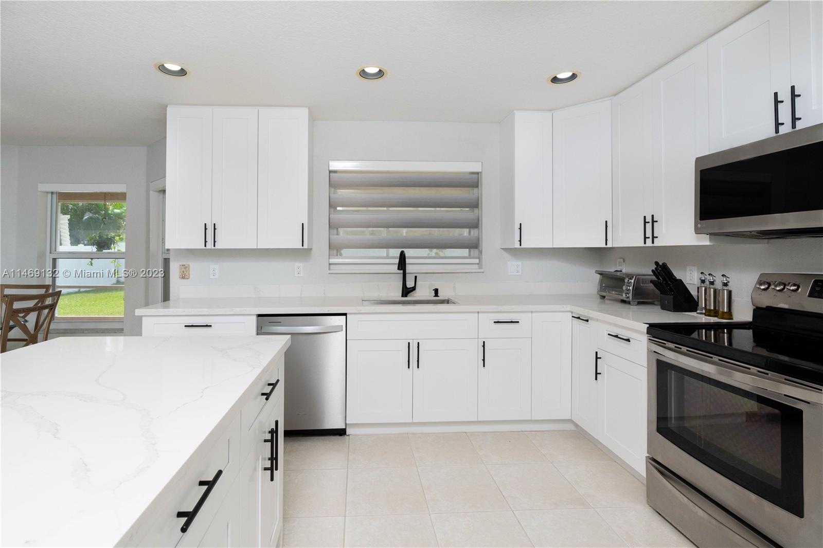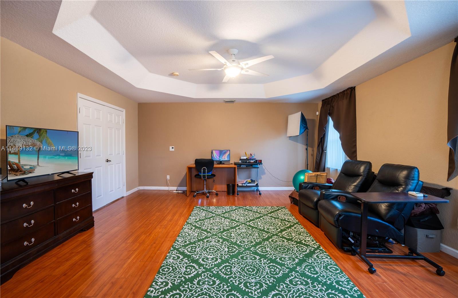 Beautiful and spacious 5 bedrooms + office/den, 3 bath with 3 car garage home located in quiet and tree lined community in West Miramar. Home features lot of natural light, high vaulted ceilings, new kitchen with wood cabinets and quartz countertops, new dishwasher, pantry, recessed spot lights throughout. First floor has new zebra blinds and hurricane impact windows, neutral color tile, one bedroom downstairs currently used as entertainment/movie room, one full bathroom, laundry room, fully screened patio great for entertaining and cookouts. Second floor has laminate floors throughout, master bedroom has 2 walk in closet (his and hers) spacious master bathroom with two vanities, roman bathtub and separate shower, 3rd, 4th and 5th bedroom and a home office. Welcome home!
