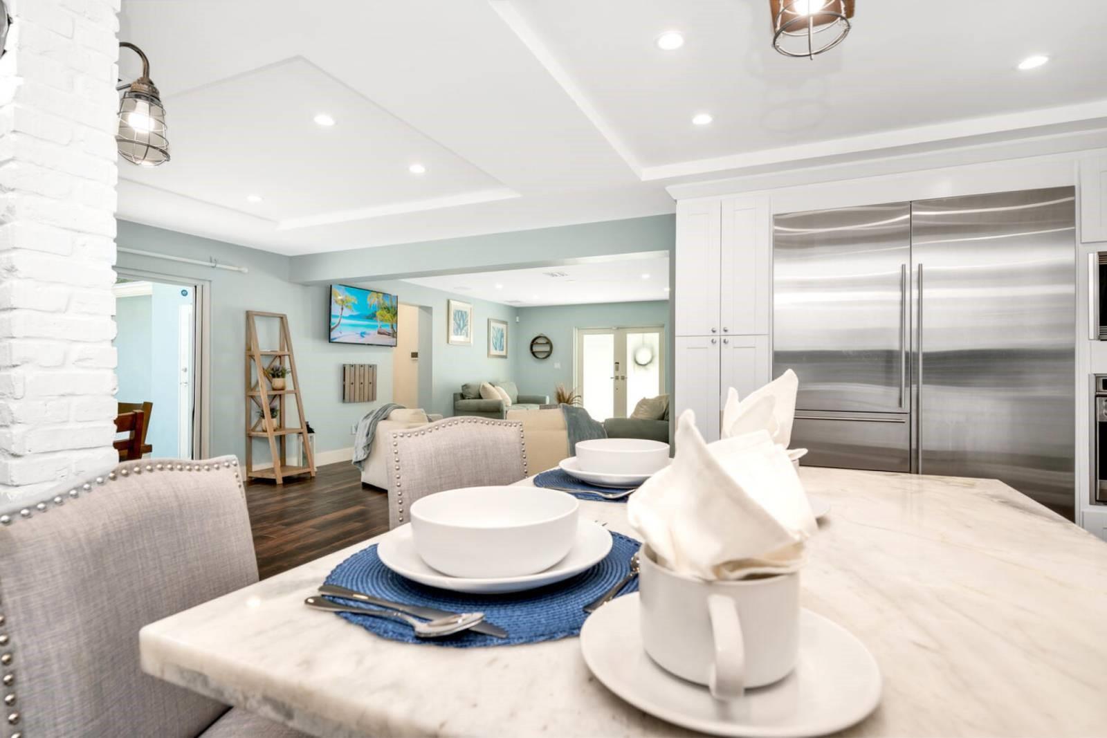 Custom fully renovated 4/3.5 single family home. Construction completed in 2021. Property features separate 1/1 guest house and separate carport/open garage. Fully impact doors and windows with plantation shutters, metal roof, a/c unit with u/v light, & water heater all 2021. In home security camera system convey with home. Free form salt water chlorinated heated pool with extra large sun deck. Tiki hut with bar. State of the art kitchen with TWO Subzero refrigerators, Wolf oven and microwave, Bosch range cook top and BEST hood. Master features walk in closet and double sinks. Guest home has separate water heater and a/c units. Turf grass throughout backyard, sprinkler system for front yard.