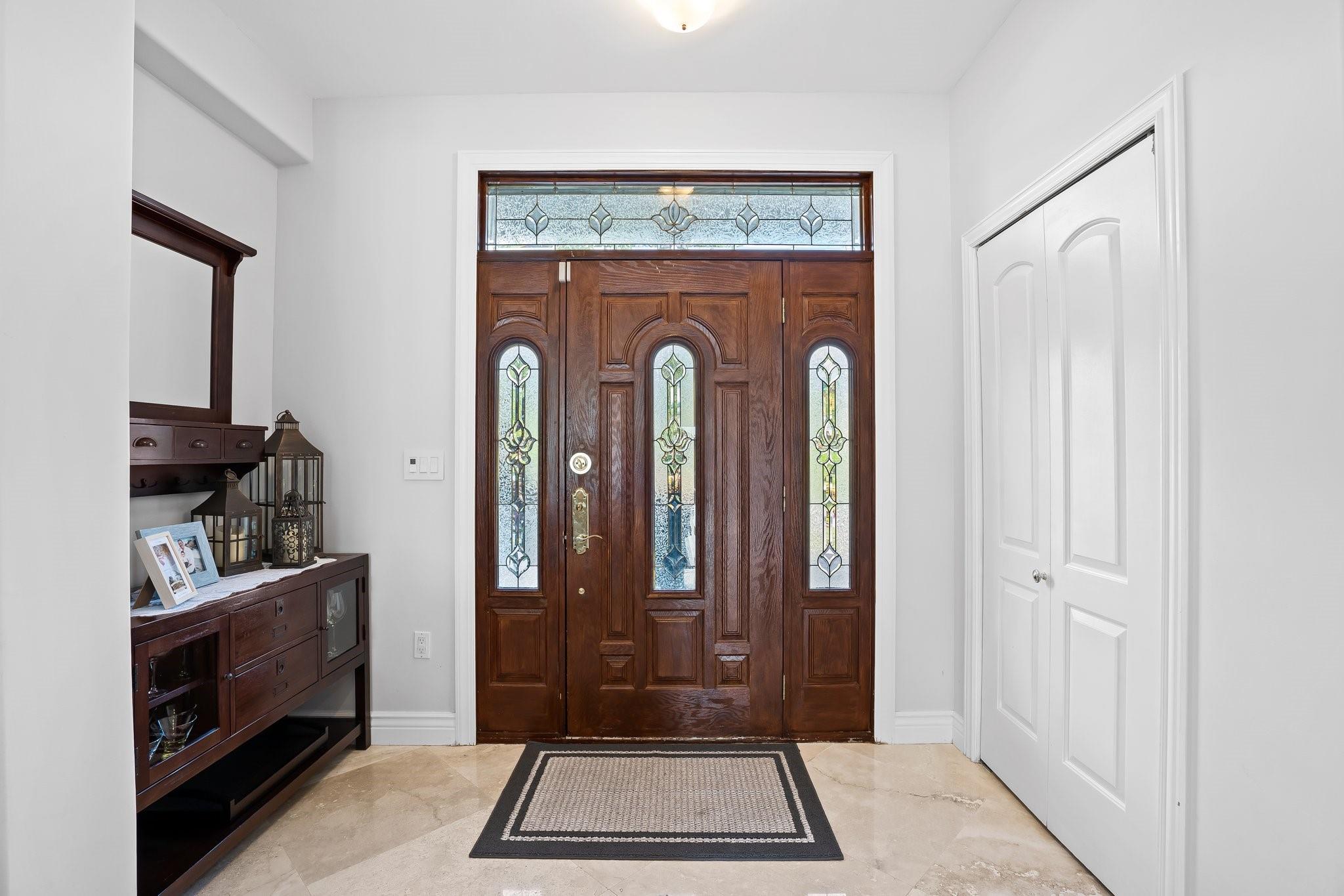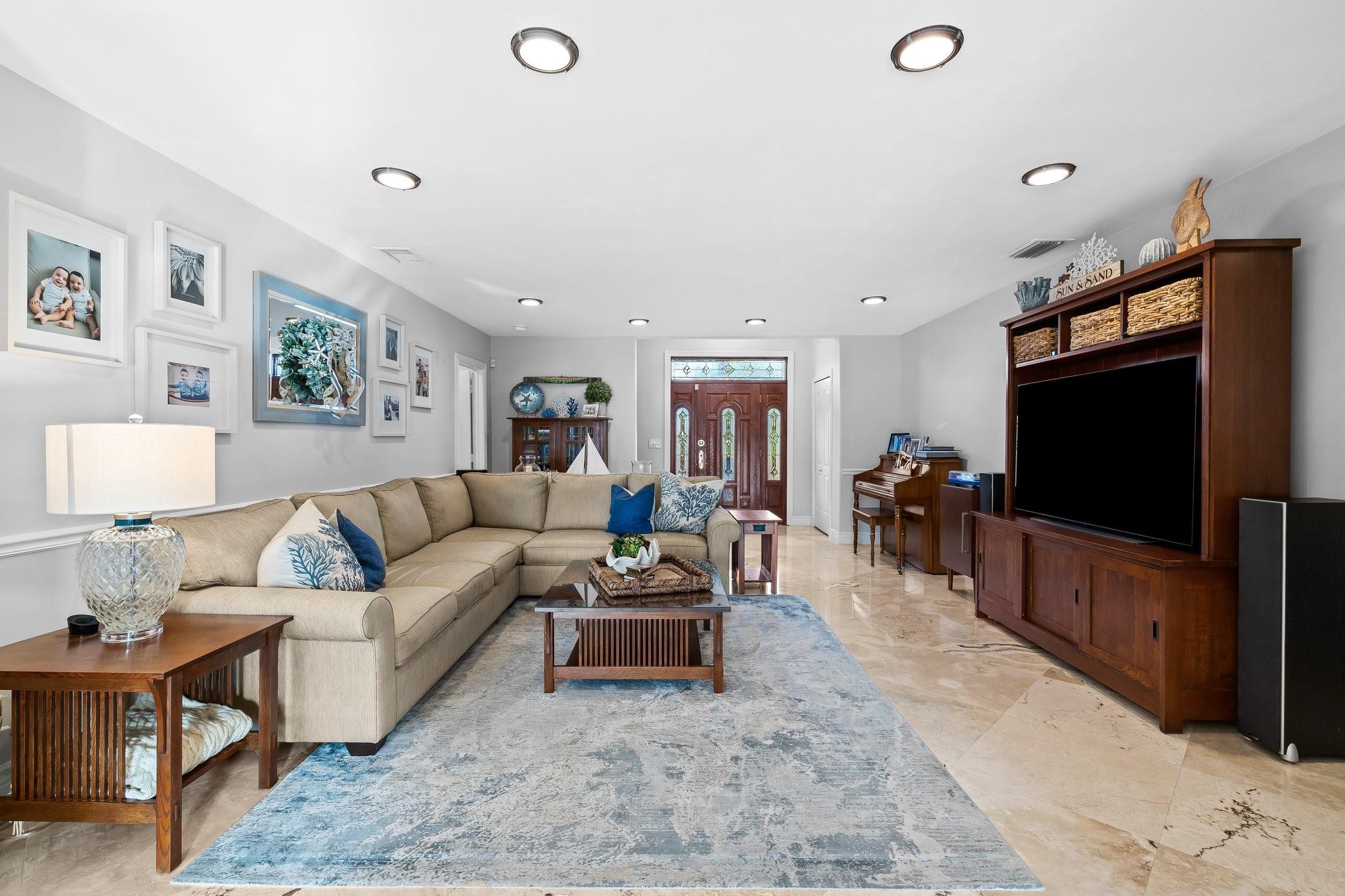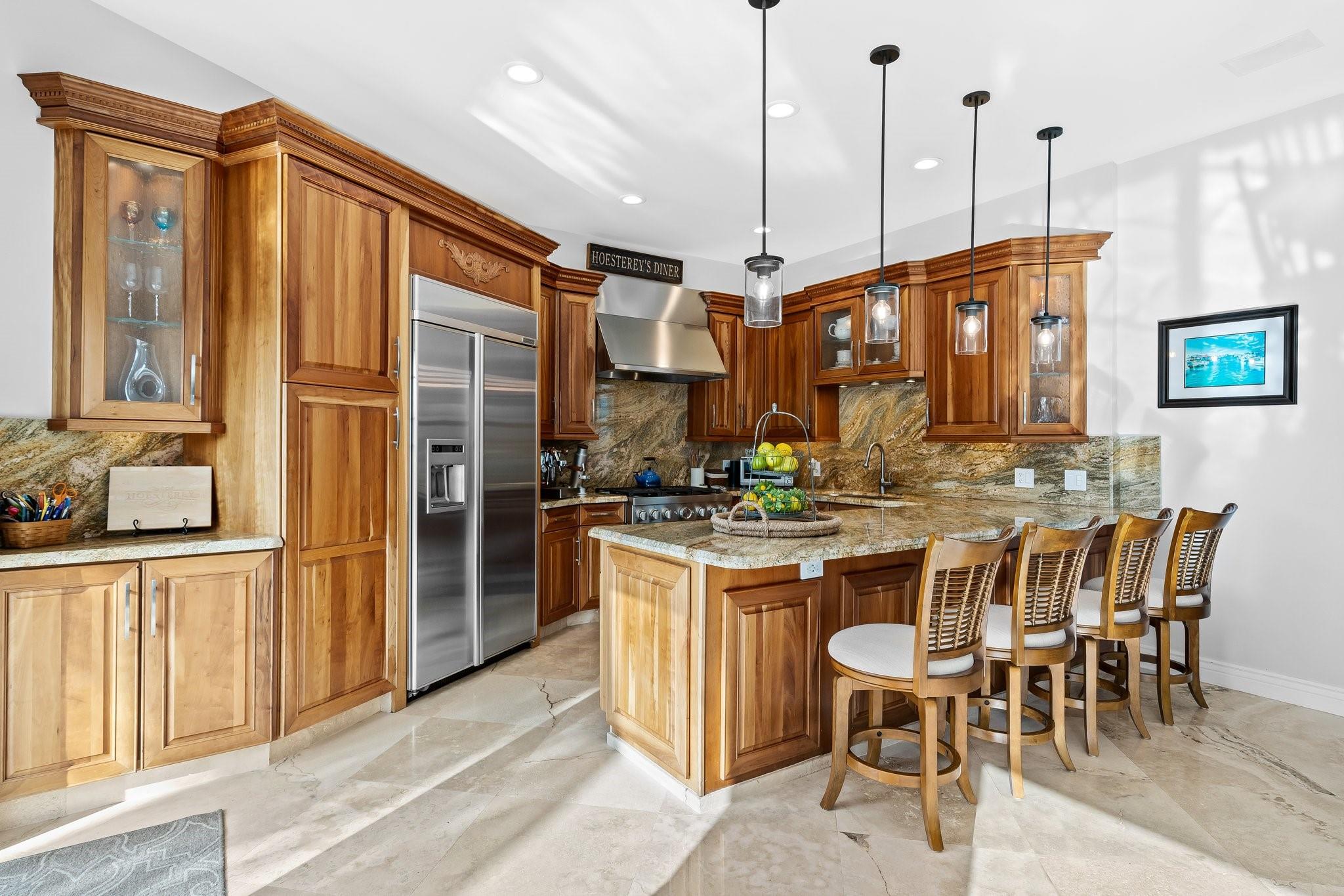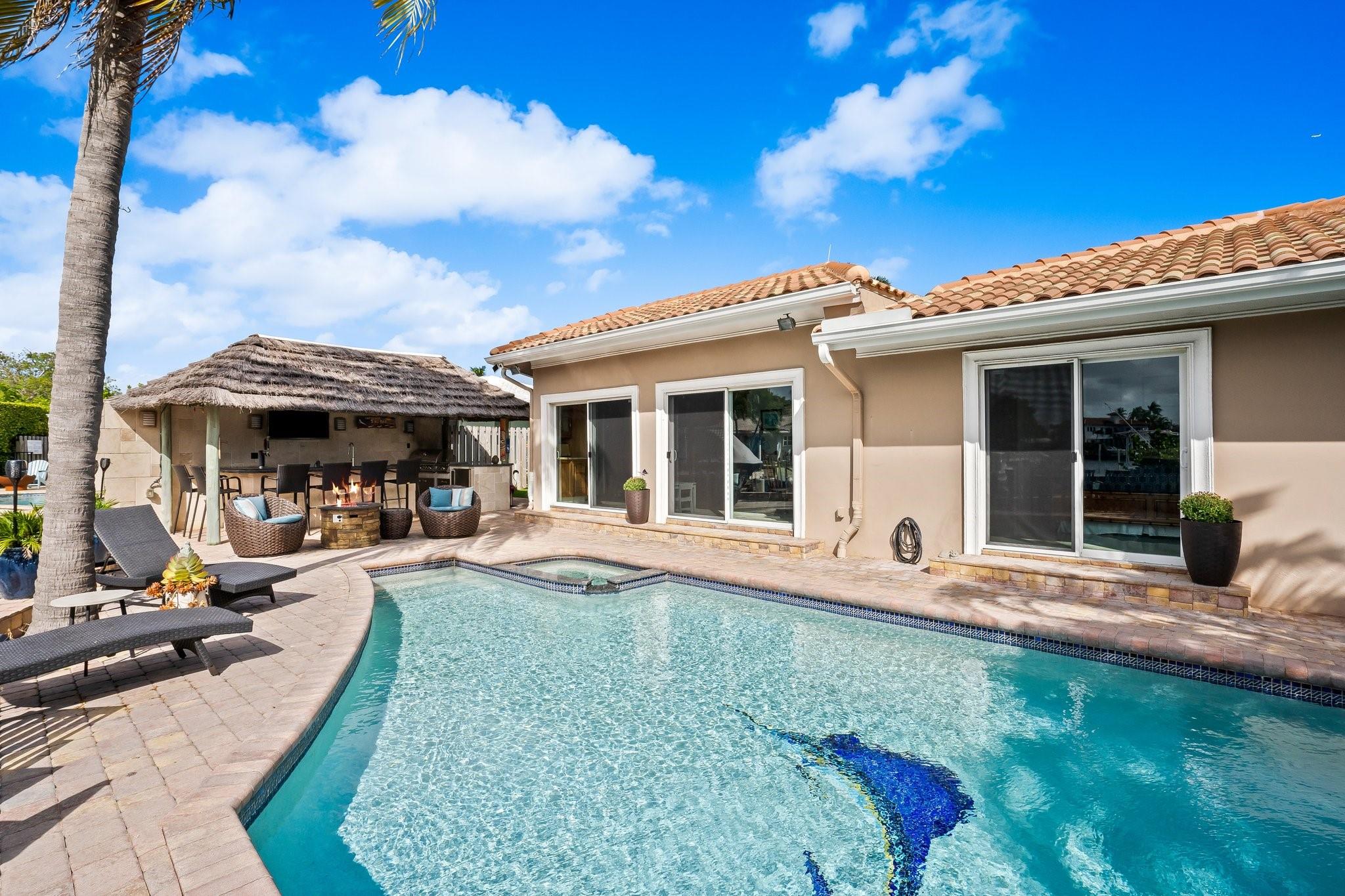 Welcome to this stunning 3 bed /3bath waterfront oasis with the most breathtaking view in the neighborhood! Inside, luxurious marble floors throughout the house secured with impact windows and doors. The custom kitchen is a dream, featuring granite countertops, stainless steel KitchenAid appliances, including a 6 burner gas range with a Stainless hood and an under-mount sink with a convenient bar area. Step outside into the backyard and be greeted by an inviting pool with a heated spa, perfect for relaxation and gatherings. The Tiki hut completes the ultimate outdoor experience with its full granite bar, range, sink, and refrigerator. Only one fixed bridge (US1) stands between you and thrilling boating adventures! Don't miss out on owning this incredible home with the best view in town.
