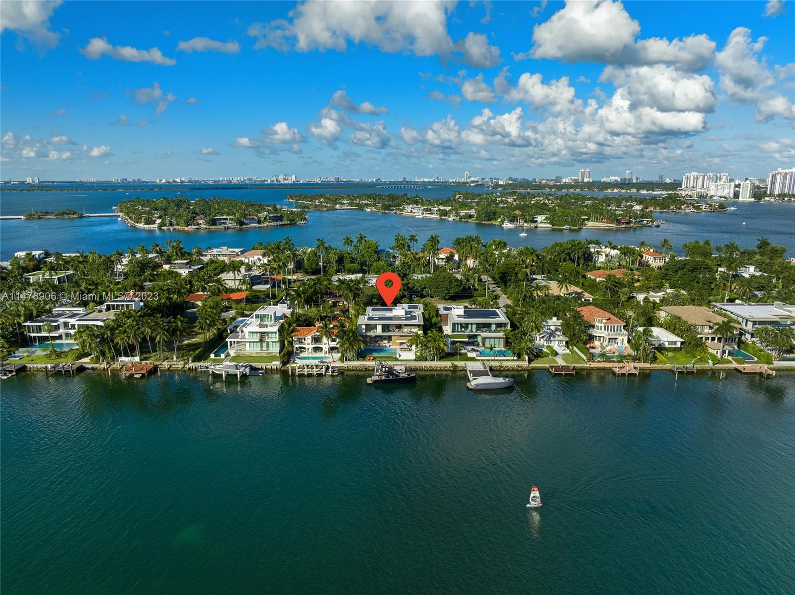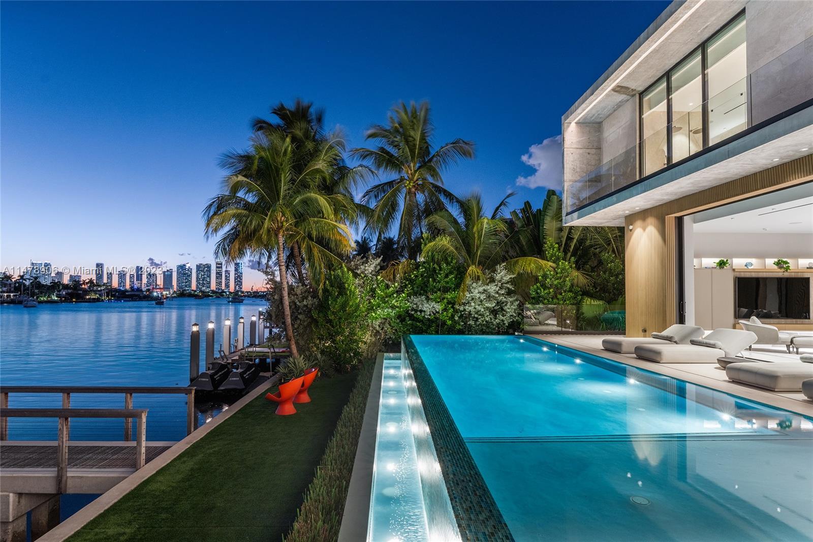 This 2-story, Ralph Choeff designed waterfront estate on guard-gated Hibiscus Island truly epitomizes luxury living in Miami Beach. Property boasts 7BR/7+1BA, sitting on a meticulously landscaped 15,750 SF lot, w/panoramic vistas of the iconic Miami skyline. Inside, the residence showcases impeccable interior design, soaring ceilings, & floor-to-ceiling telescoping glass doors that flood serene natural light while bringing the outdoors in. The expansive Great Room seamlessly integrates a family/media room, dining area, & chef's kitchen, all w/captivating water views. The 2nd story principal suite offers a terrace overlooking the waterway with city views and a beautiful plunge pool/spa. Outdoor spaces are a tropical oasis w/infinity pool, private dock for large vessels & easy ocean access.