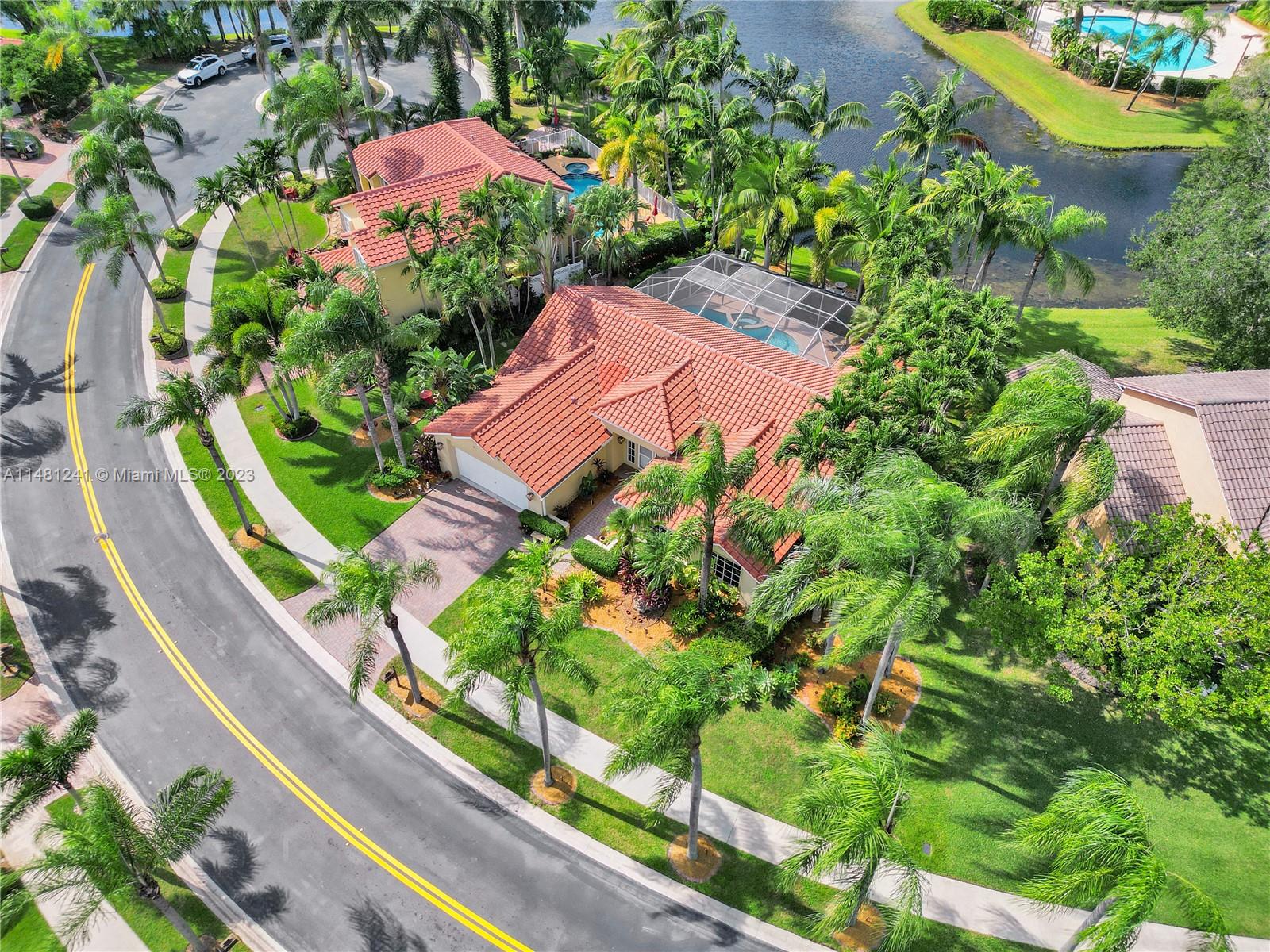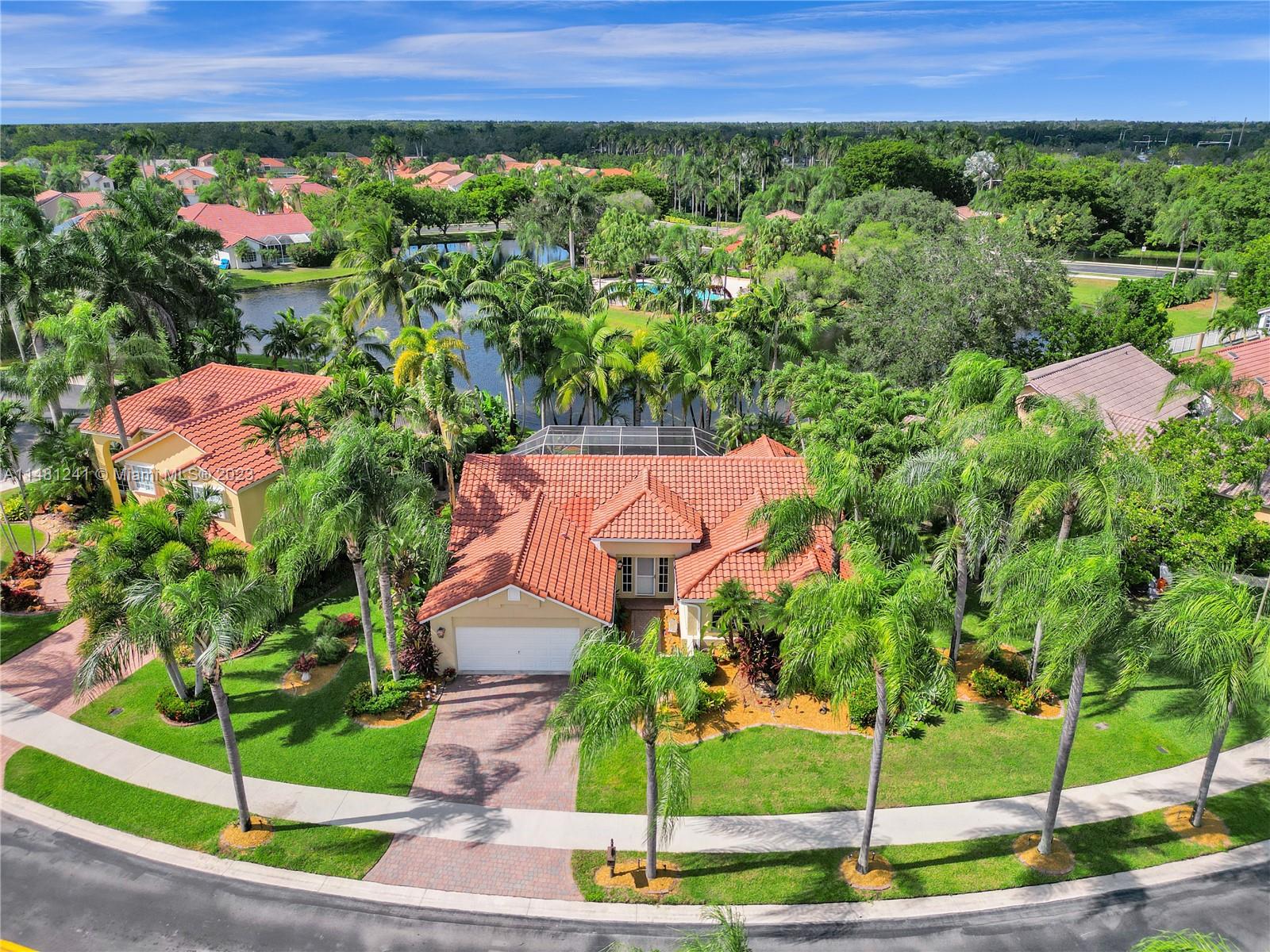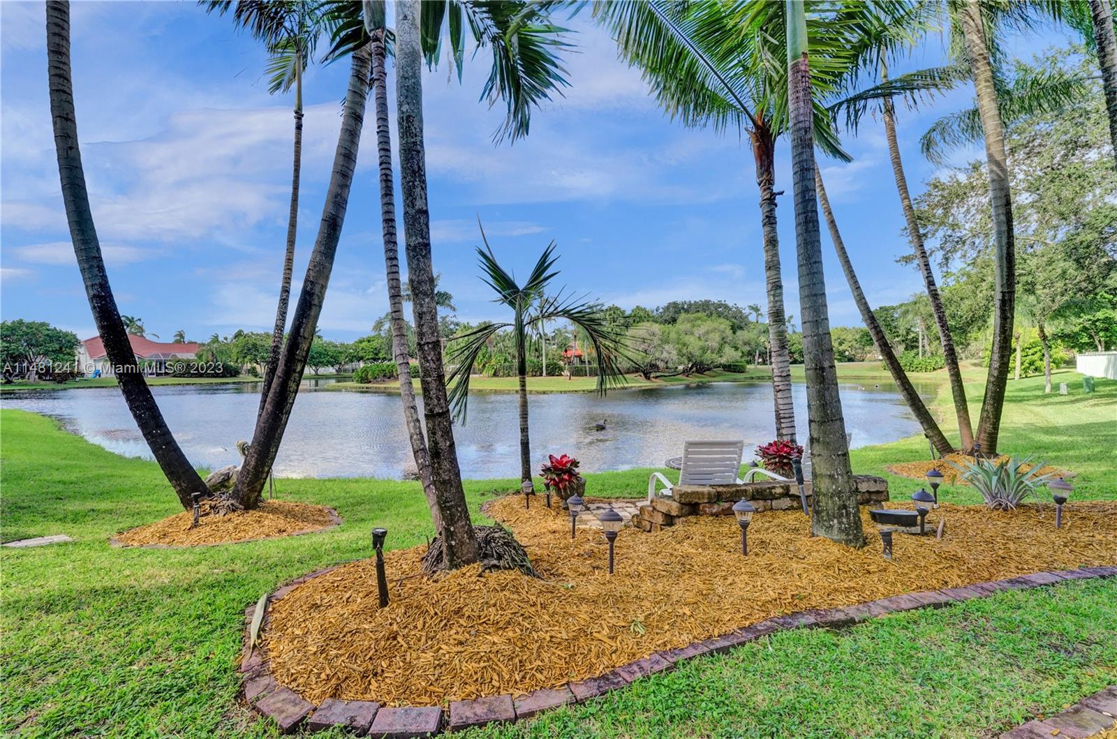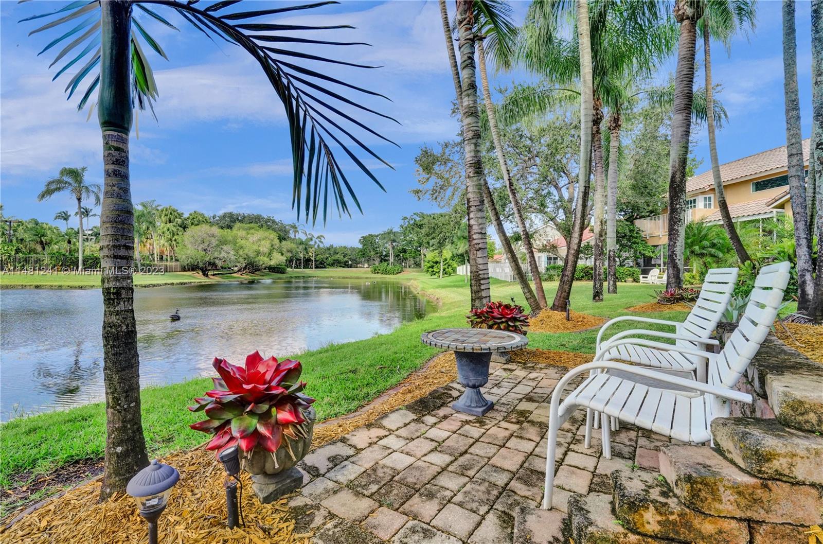 Nestled in a tranquil cul-de-sac, this vibrant waterfront gem is one of just 106 homes in an intimate enclave. Impeccable, cozy New Orleans-inspired haven offering peaceful views & lush tropical surroundings. Updated interior, including tile/ porcelain floors & designer bathrooms. Roomy kitchen with plenty of storage & work space, wood cabinetry, stone counters, wine-cooler & stainless appliances. Outdoor living at its best, sparkling heated pool and spa, surrounded by over $60,000 in professional landscaping & outdoor lighting. Charming brick pavers and brass lanterns compliment the exterior. Updated pool equipment, A/C, water heater, storm-rated garage door & lake-fed irrigation. Community pool and clubhouse. Convenient to schools, parks & houses of worship. The roof was replaced 2006.
