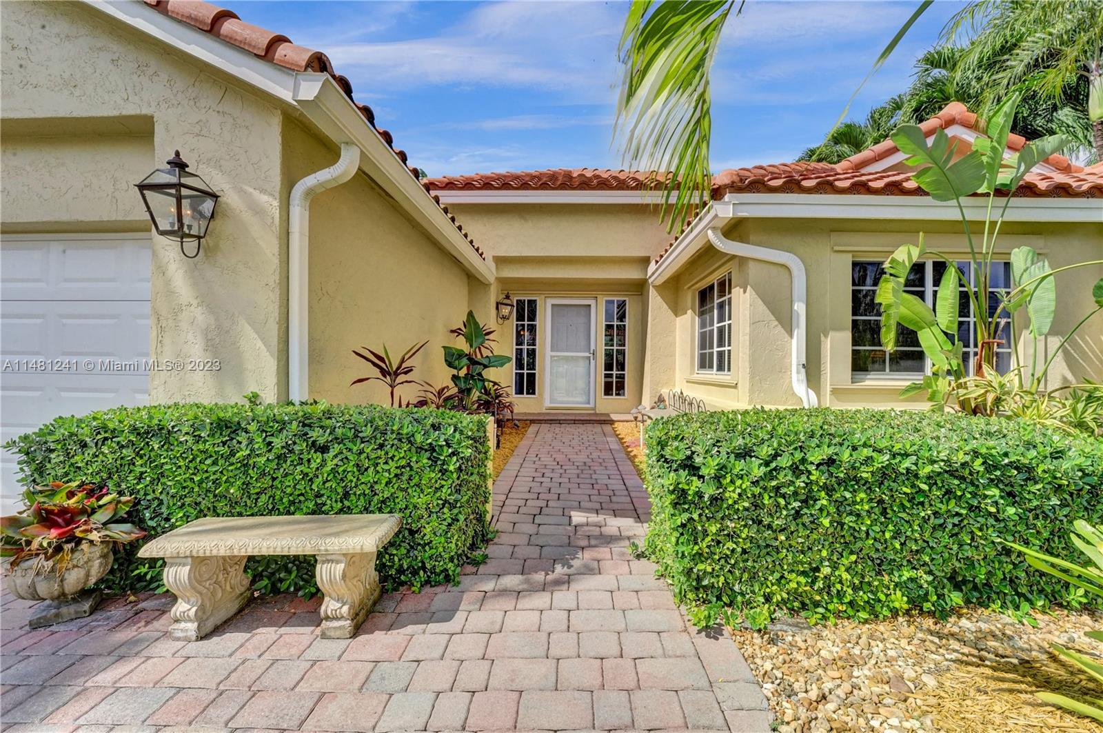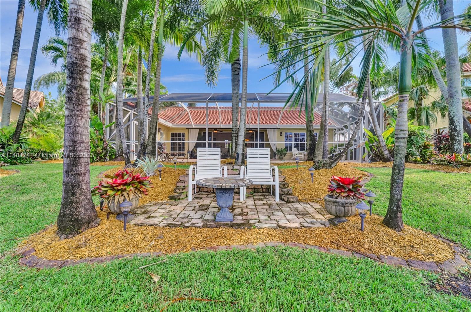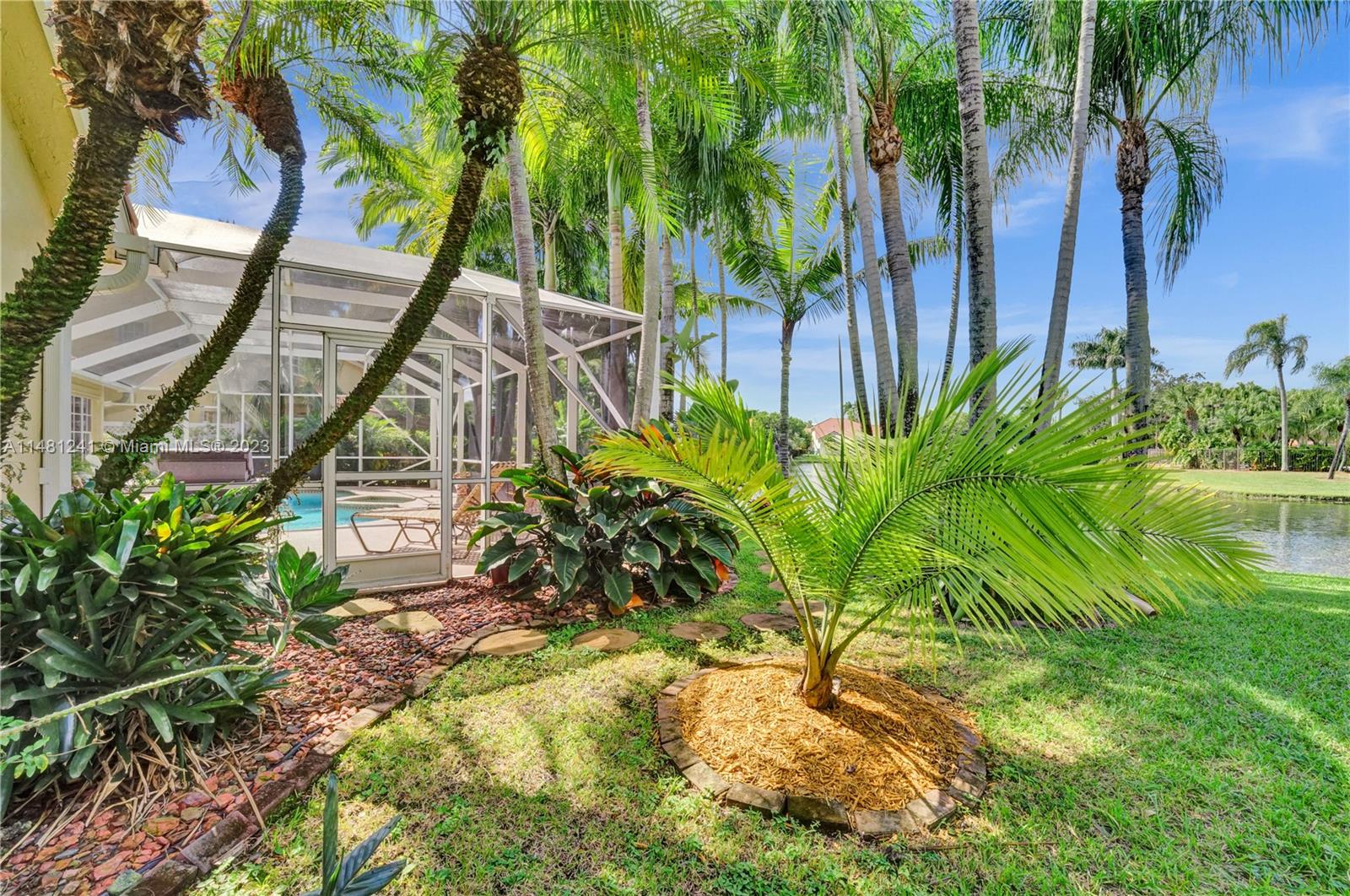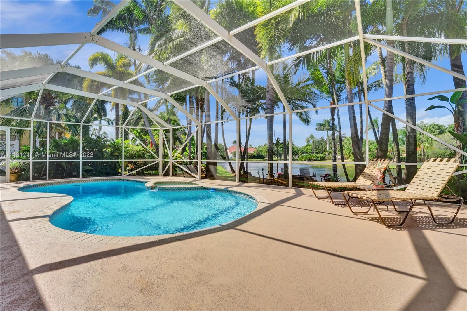 Nestled in a tranquil cul-de-sac, this vibrant waterfront gem is one of just 106 homes in an intimate enclave. Impeccable, cozy New Orleans-inspired haven offering peaceful views & lush tropical surroundings. Updated interior, including tile/ porcelain floors & designer bathrooms. Roomy kitchen with plenty of storage & work space, wood cabinetry, stone counters, wine-cooler & stainless appliances. Outdoor living at its best, sparkling heated pool and spa, surrounded by over $60,000 in professional landscaping & outdoor lighting. Charming brick pavers and brass lanterns compliment the exterior. Updated pool equipment, A/C, water heater, storm-rated garage door & lake-fed irrigation. Community pool and clubhouse. Convenient to schools, parks & houses of worship. The roof was replaced 2006.
