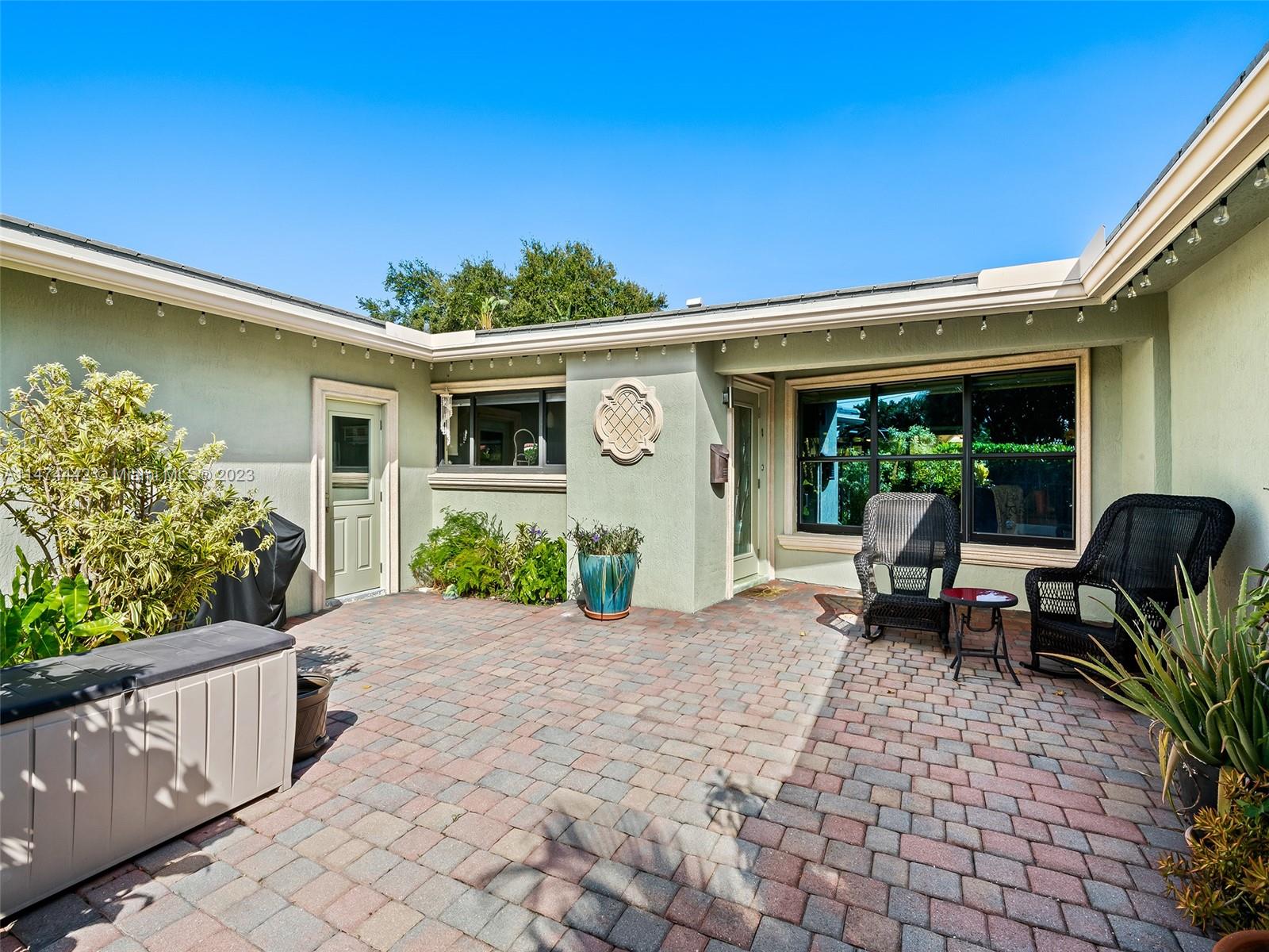 Mid-century modern residence sited in the center of a small isle behind the gates of Bermuda Riviera. Only two blocks from the shoreline, this 3 bed 3 bath home is move-in ready with many upgrades, a heated pool (2017), and lush tropical landscaping. Features include: oak flooring, chef's kitchen with gas stove, built in banquette eating area, wine refrigerator, walk-in closets, custom window treatments, 2022 A/C, garage shower, hurricane impact windows and doors, 2016 roof, private screened in porch, butterfly garden, newer sanitation pipes, separate irrigation meter, piling foundation, and a crawl space. Bayview school district with close proximity to private schools, places of worship, luxury shopping, conservation park, intracoastal waterways, fine dining, and Lauderdale By The Sea.