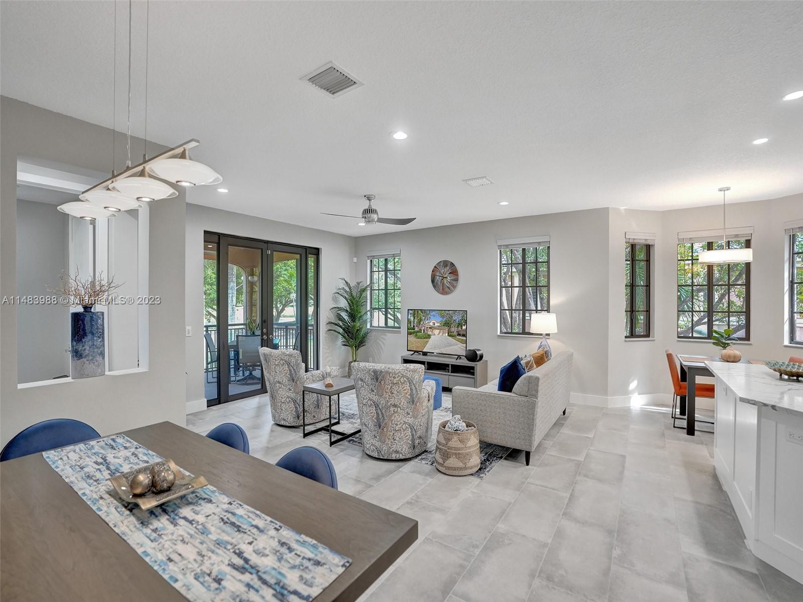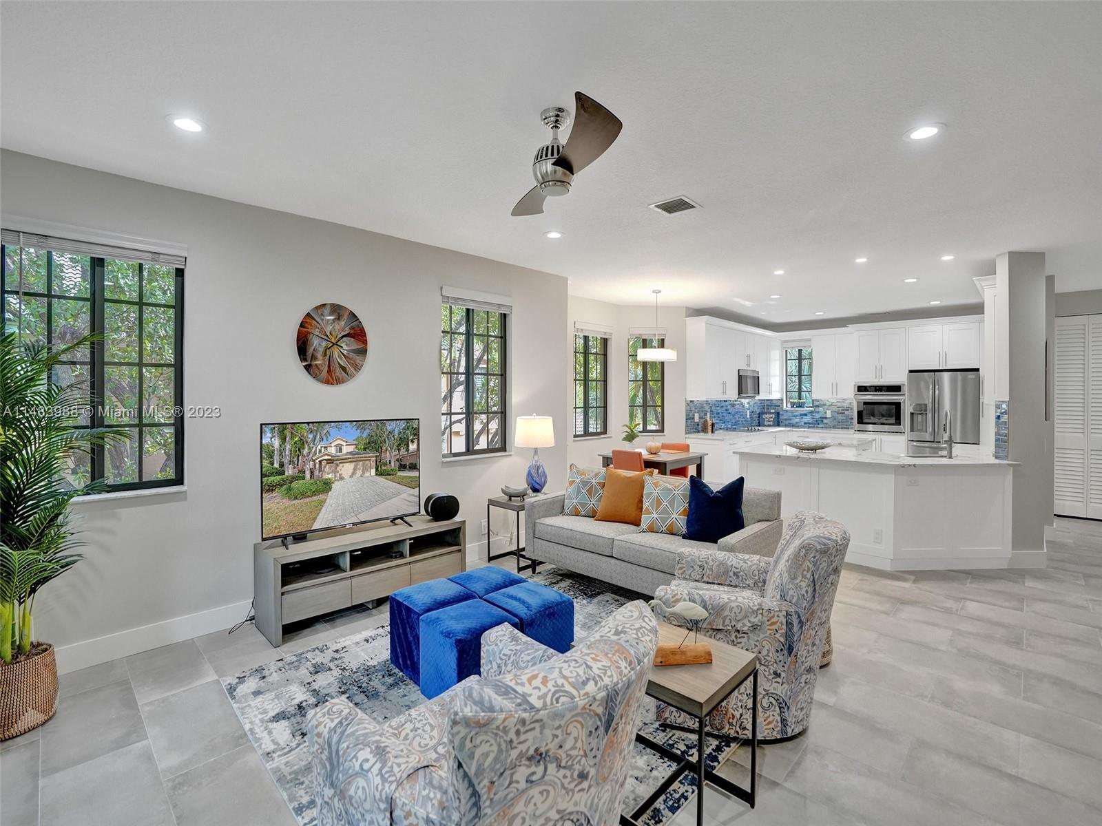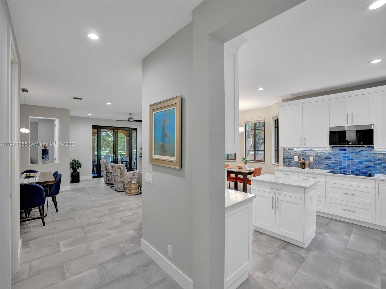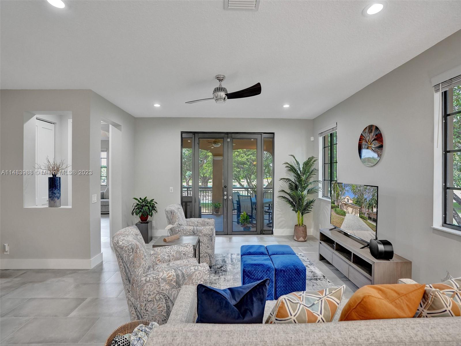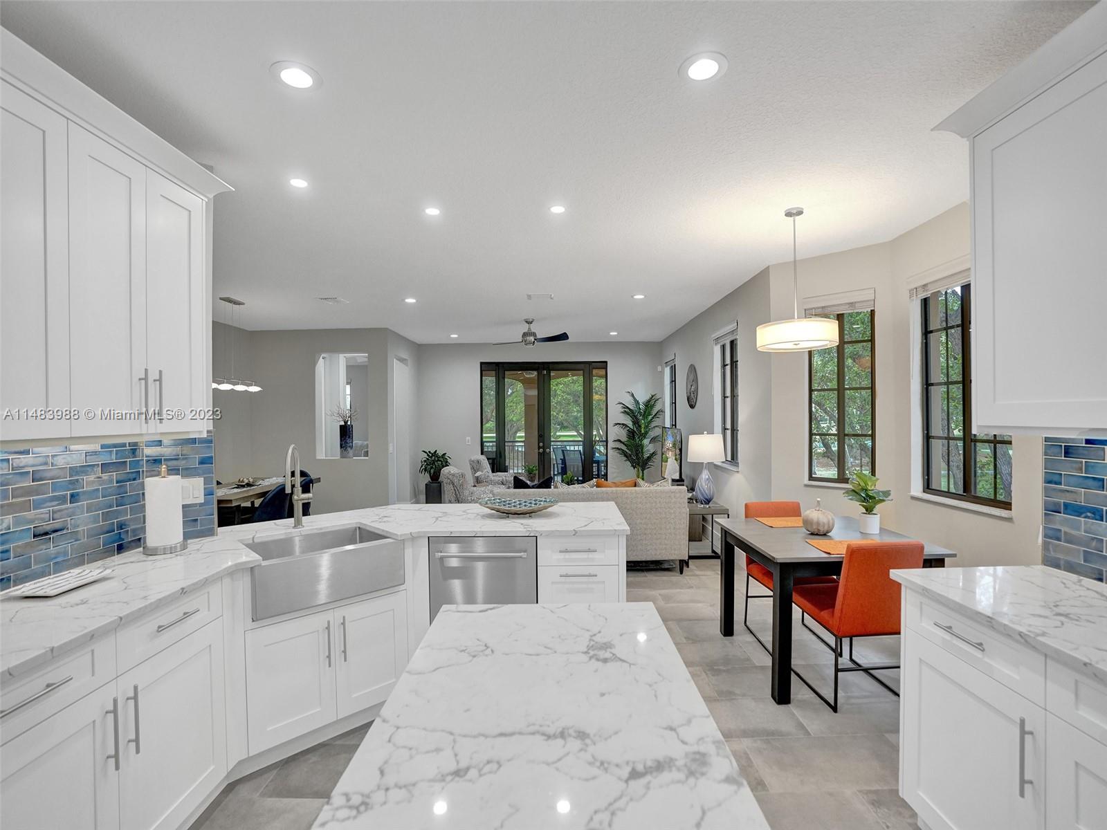 Beautiful Weston gated Community at Courtside. Newly renovated down to the drywall, this open floor plan coach home offers quality throughout. Custom cabinetry and quartz counter tops in kitchen and baths. Porcelain tile throughout and LVP stairs. Custom elevator, high impact windows, newer plumbing fixtures, wood blinds, light fixtures, ss appliances and interior doors. 3rd bedroom converted to office. Large bedrooms with walk-in closets with built ins (double walk-in in primary bdrm). Private en-suite to each bedroom. Beautifully shaded large 180 sq ft screened balcony overlooking golf course and lake. Walking distance to Country Club, golf course, pool, tennis courts and gym (all available through membership). Over $260K in renovations. Enjoy the Lifestyle.
