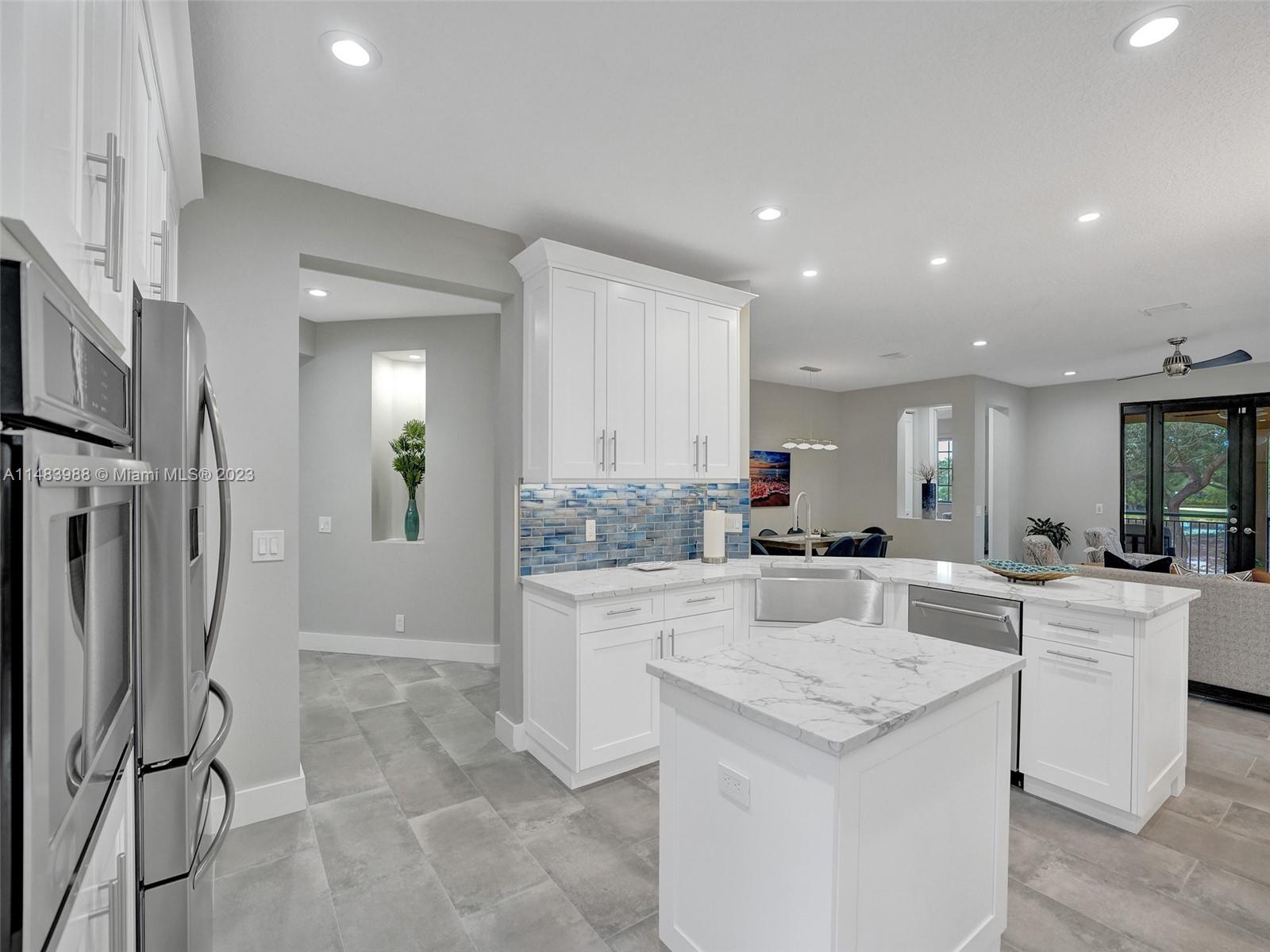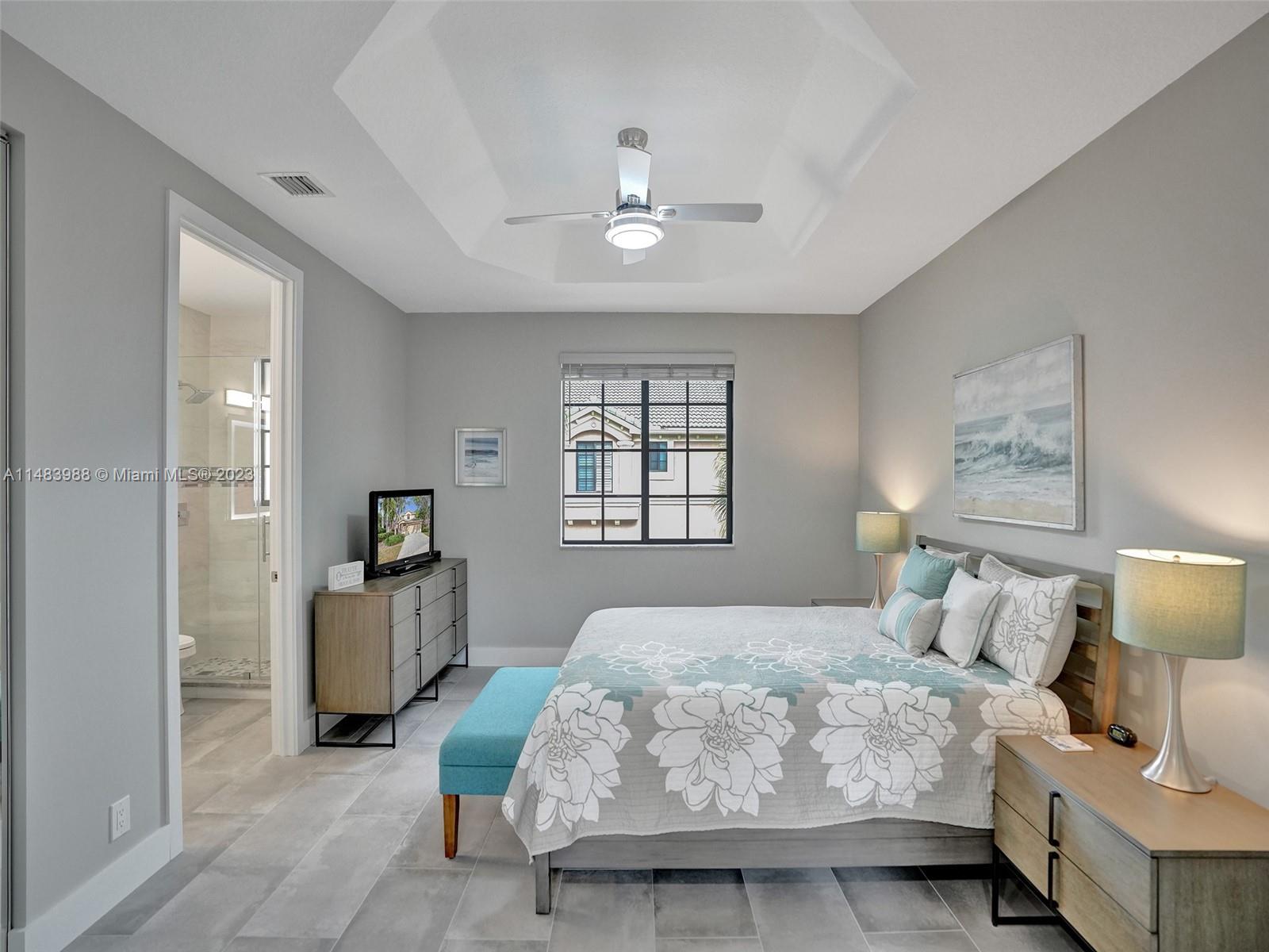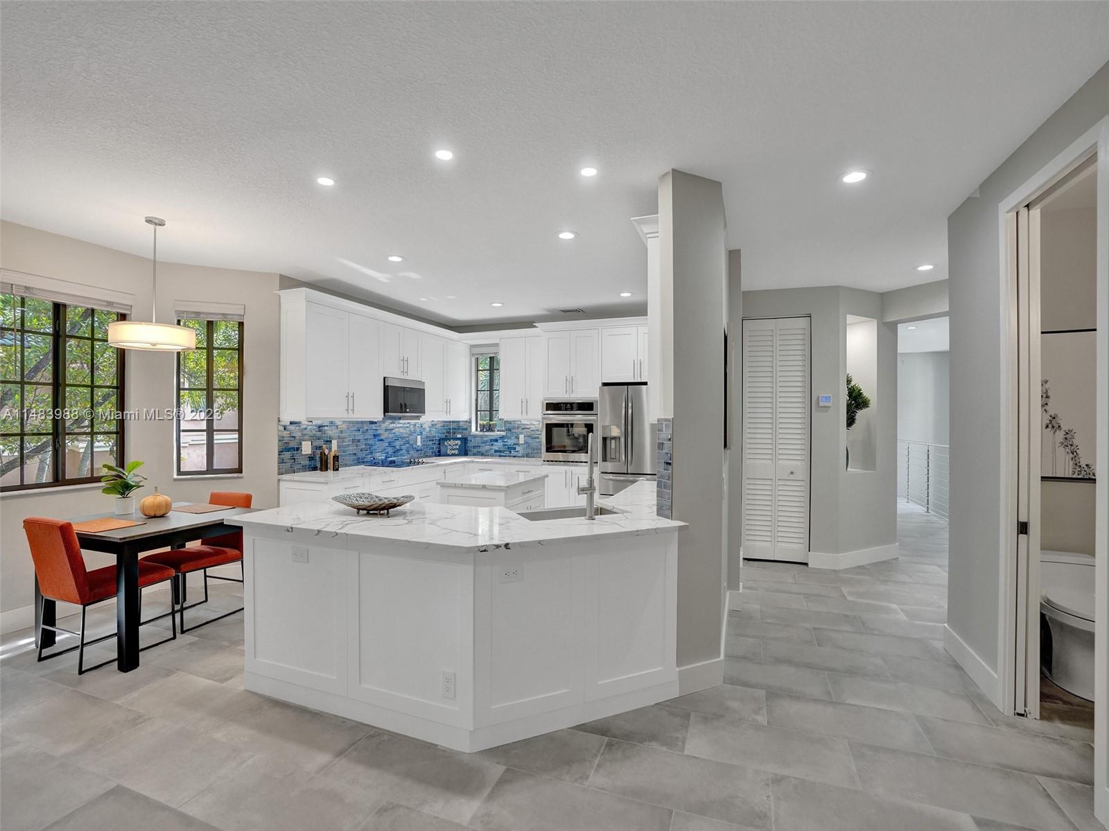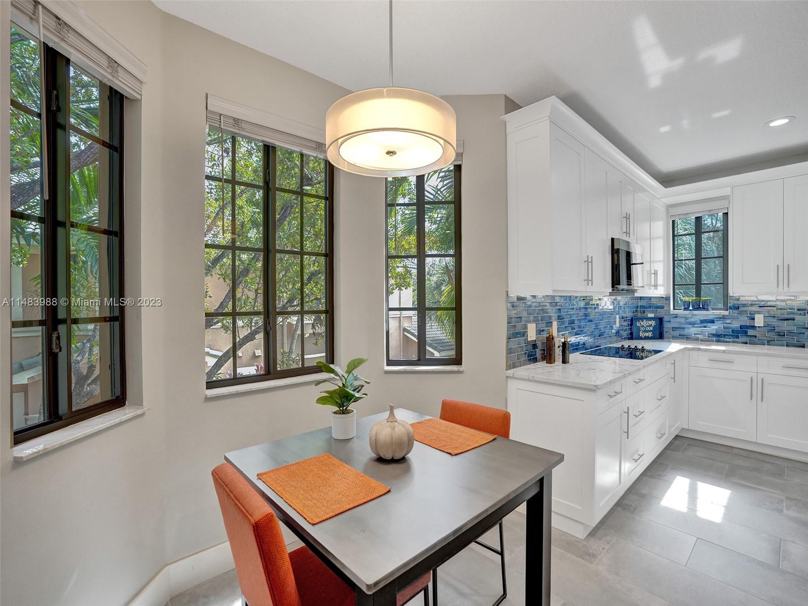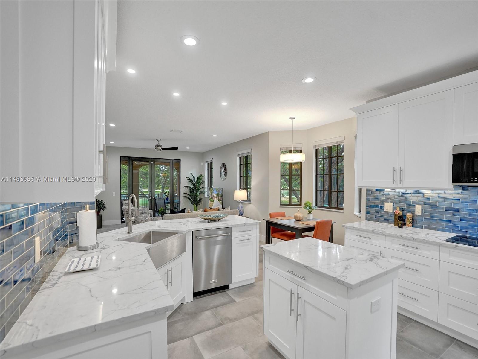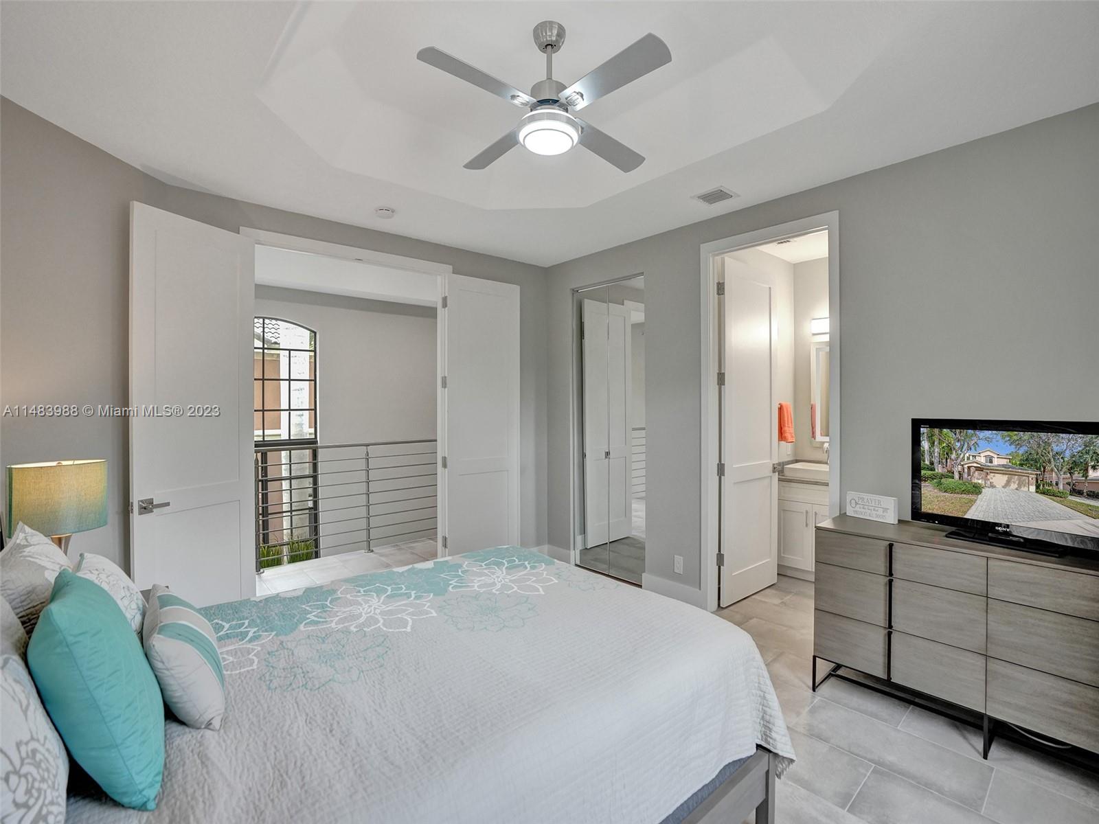 Beautiful Weston gated Community at Courtside. Newly renovated down to the drywall, this open floor plan coach home offers quality throughout. Custom cabinetry and quartz counter tops in kitchen and baths. Porcelain tile throughout and LVP stairs. Custom elevator, high impact windows, newer plumbing fixtures, wood blinds, light fixtures, ss appliances and interior doors. 3rd bedroom converted to office. Large bedrooms with walk-in closets with built ins (double walk-in in primary bdrm). Private en-suite to each bedroom. Beautifully shaded large 180 sq ft screened balcony overlooking golf course and lake. Walking distance to Country Club, golf course, pool, tennis courts and gym (all available through membership). Over $260K in renovations. Enjoy the Lifestyle.
