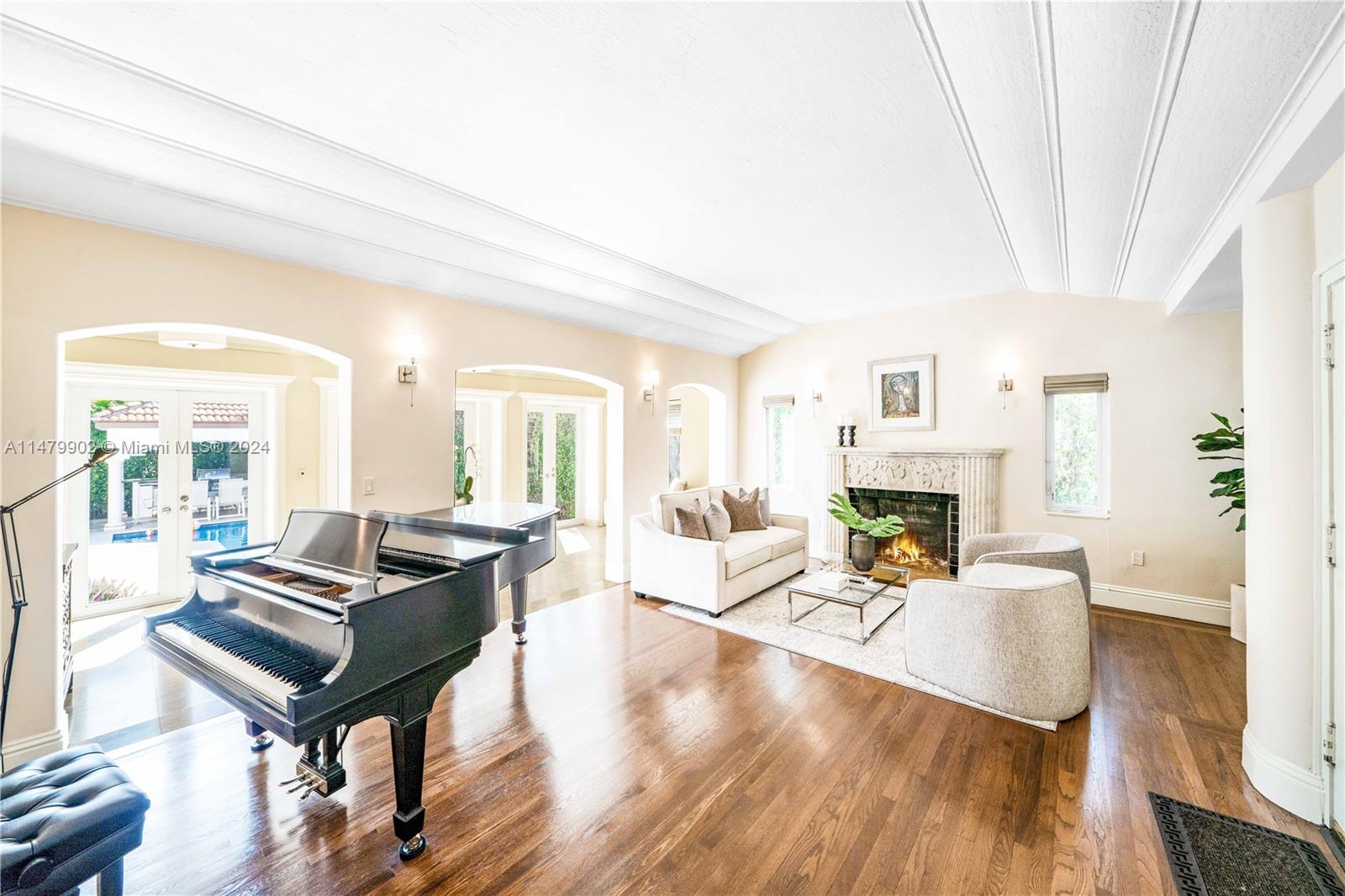 Welcome to this private oasis on coveted North Bay Road. Offering a fantastic floor-plan w/ 3 bedrooms upstairs & 2 downstairs, totaling 5BD/5BA + den/office. Enjoy sun drenched interiors, an open eat-in kitchen w/ cooking island, Great room w/ working fireplace, high ceilings, gleaming wood & marble floors, impact windows & doors, & primary suite w/ 10'6" ceilings, office + nursery, & bath w/ separate jacuzzi tub & shower. Outside find a serene backyard surrounded by lush landscaping & mango/banana trees w/ a gorgeous heated pool, covered summer kitchen w/ Alfresco dining. For added convenience the home is complete w/ a circular driveway w/ ample parking, cameras, & a separate laundry room w/ full sized washer/dryer. Walk to Sunset Harbour!