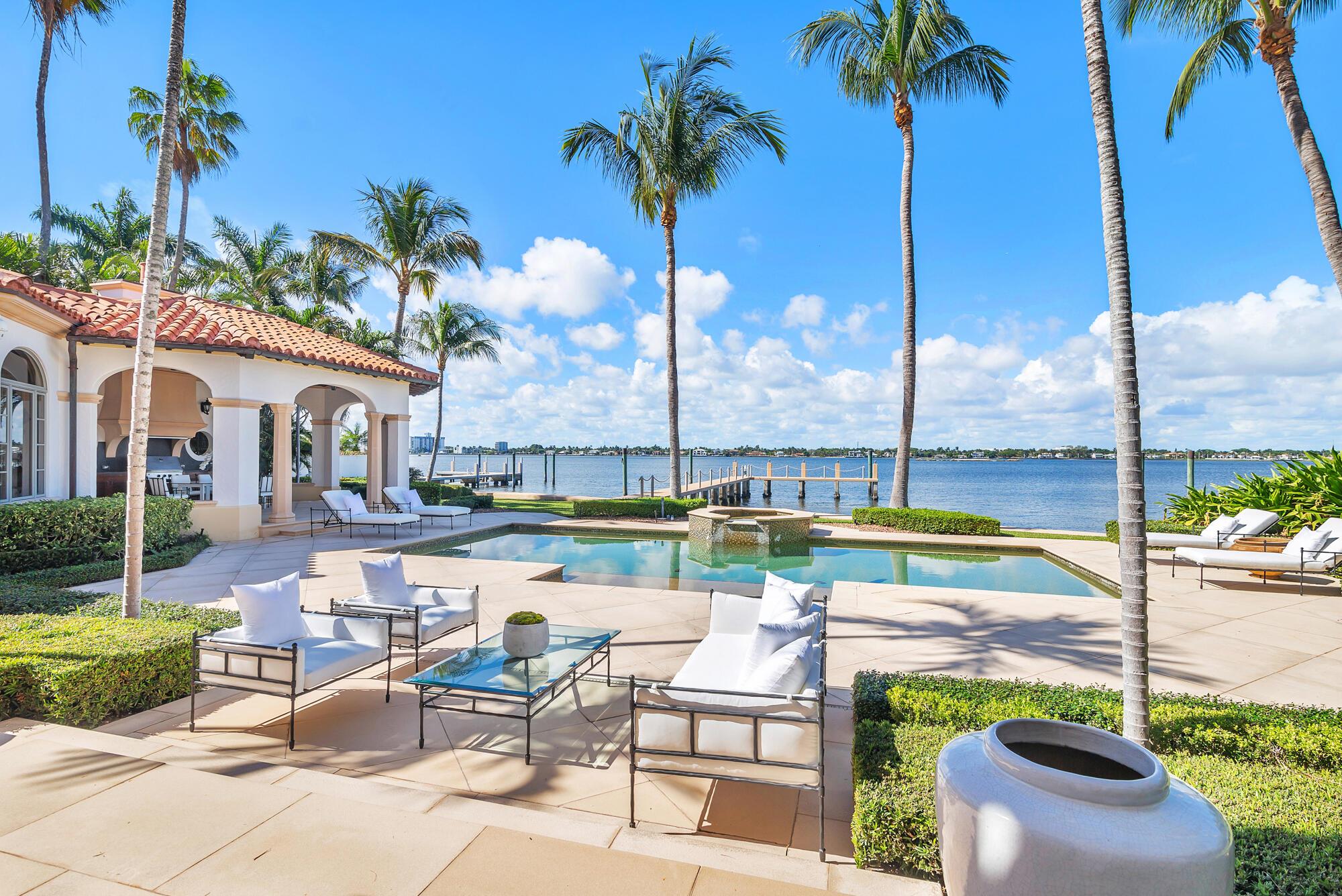 Water, Water Everywhere from the moment you walk in to this magnificent direct lakefront Mediterranean estate on over 2/3 of an acre located in the exclusive Estate Section of Palm Beach. Gated and lushly landscaped, the property is surrounded by mature foliage providing maximum privacy before opening up to 117' of commanding Intracoastal views. The gracious floor plan offers 5 bedrooms/7.5 baths and volume ceilings throughout. Highlights include luxurious second floor primary suite with private balcony and sitting room, chef's kitchen with butler's pantry, wood paneled library, oversized family room, wine cellar, media room, elevator, 100' x 40' concrete dock, full house generator and 3 car garage. Fabulous outdoor spaces with grand covered loggia ideal for dining and entertaining.
