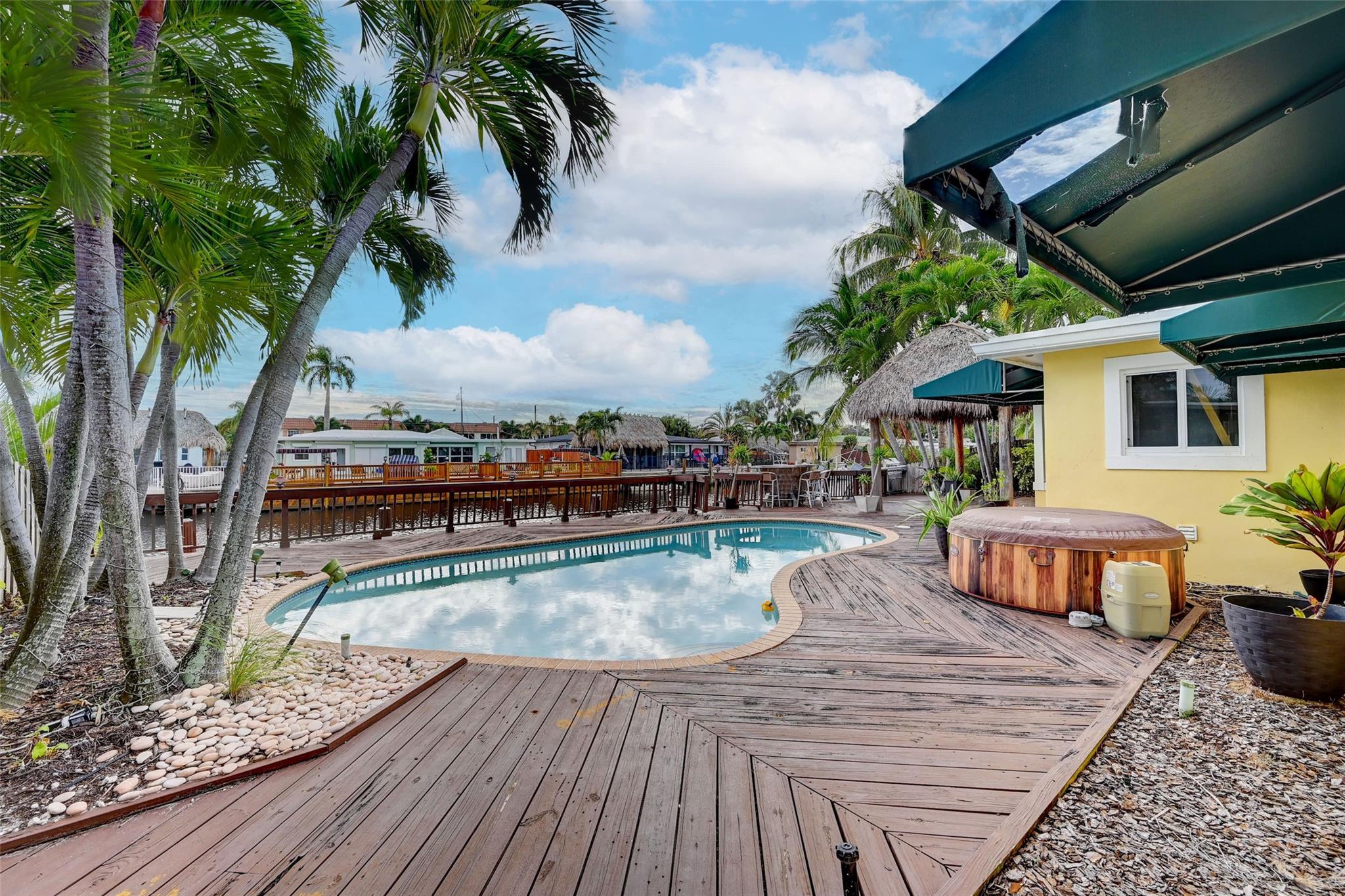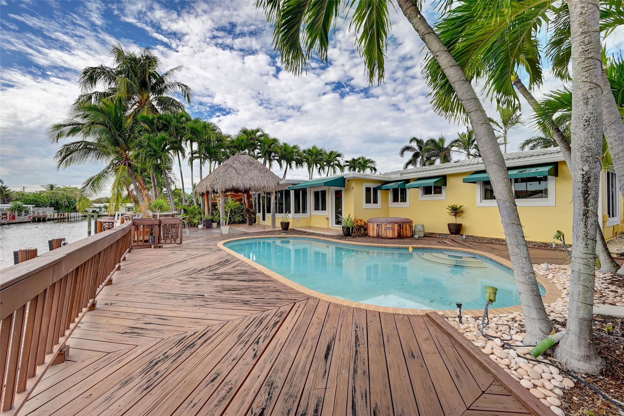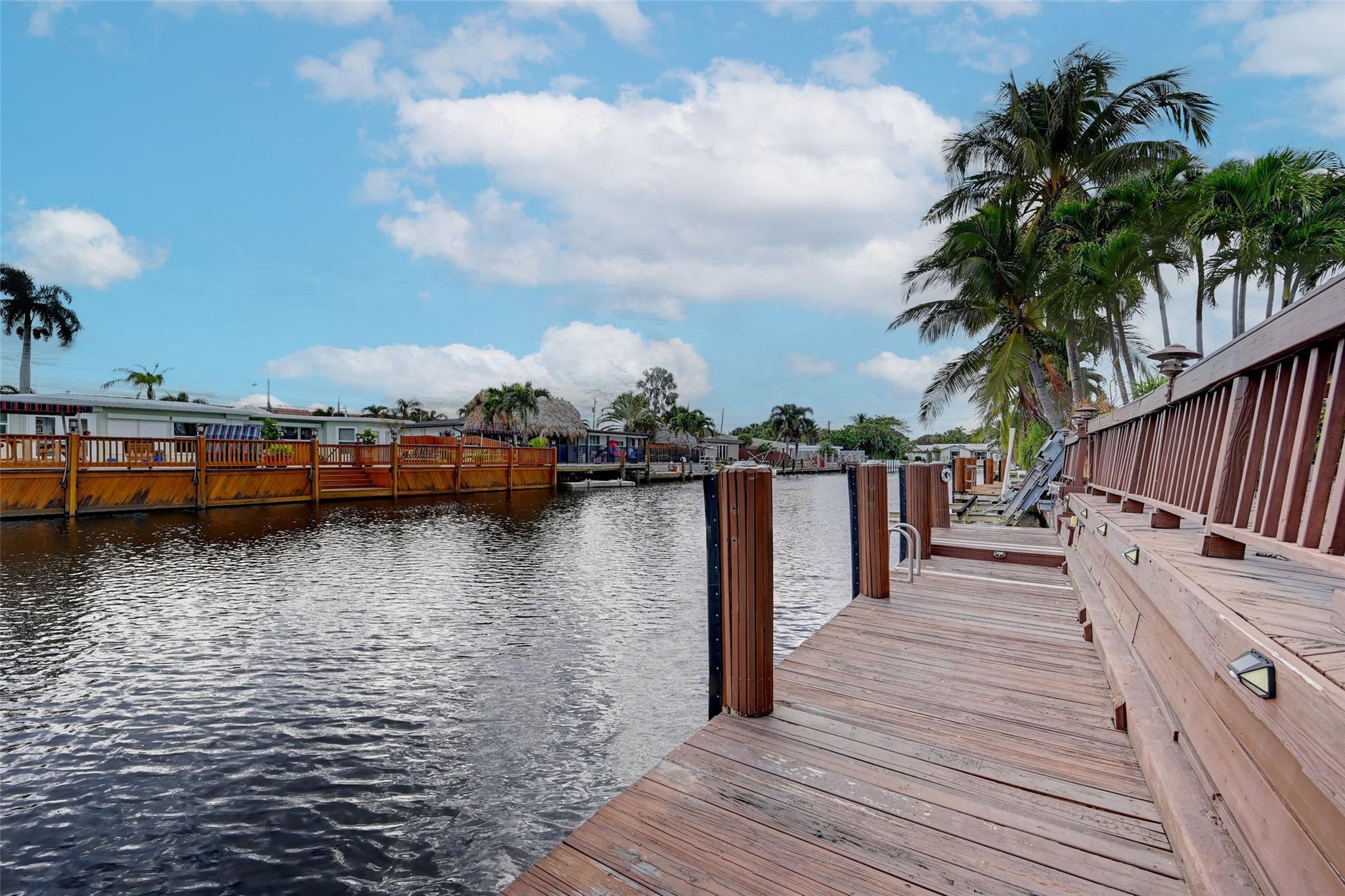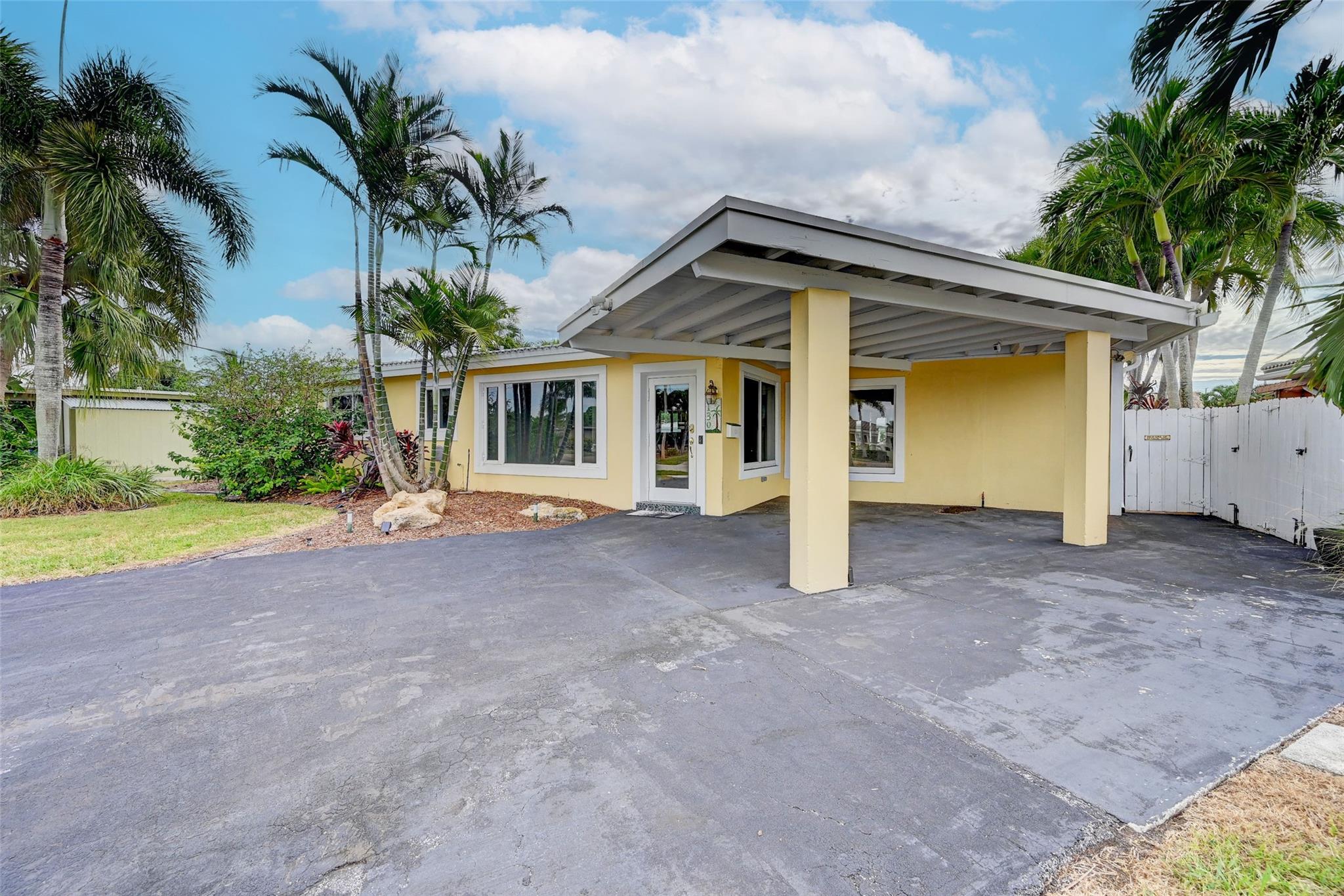 Beautiful updated 2 bedroom, 2 bath waterfront home with pool. Very spacious open floor plan with den/office area overlooking canal. Gourmet kitchen with stainless steel appliances and gas viking stove. Impact windows and doors throughout. New A/C. 1 carport and long driveway with plenty of room for parking. Salt water pool with large area for entertaining with tiki hut. Utility room and separate storage room. New electric panel. New pilings. South exposure! Great location close to shopping, restaurants, golfing and the beach! Lowest price waterfront home in Pompano with only one fixed bridge, federal highway.