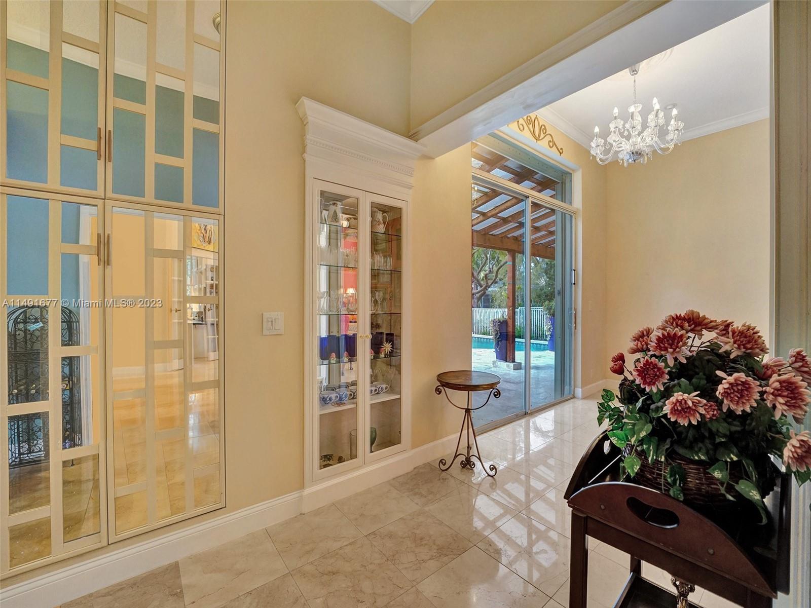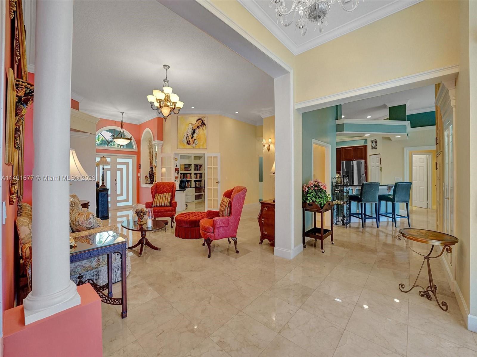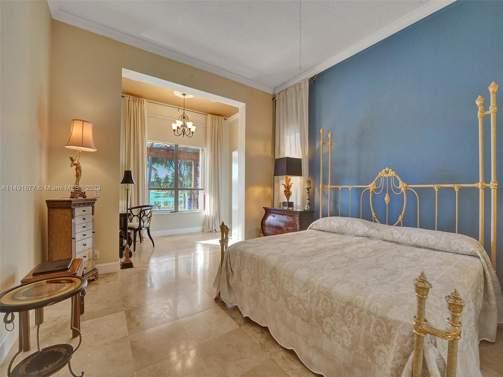 Tucked in a quiet cul-de-sac, this 4 Br + office + study/gym, waterfront gem offers an elegant interior with 12 ft ceilings & luxurious marble floors. Large kitchen featuring mahogany wood cabinetry, plenty of storage & workspace, updated appliances & gas stove. New air-conditioned sunroom w/remote-controlled shades. Outdoor oasis with a solar-heated salt pool, travertine deck & cedar pergola, views of the lake/wildlife preserve & memorable sunsets year-round. Oversized driveway, 3-year-old roof, new A/C unit. This haven is part of a welcoming community. Bonus features: New lake-fed irrigation system, new pool equipment, accordion shutters. Ideal location, closest to the resident gate, tennis court & playground, 4 mins from shopping & I-75. Nearby 7-1/2 miles of trails for biking/walking