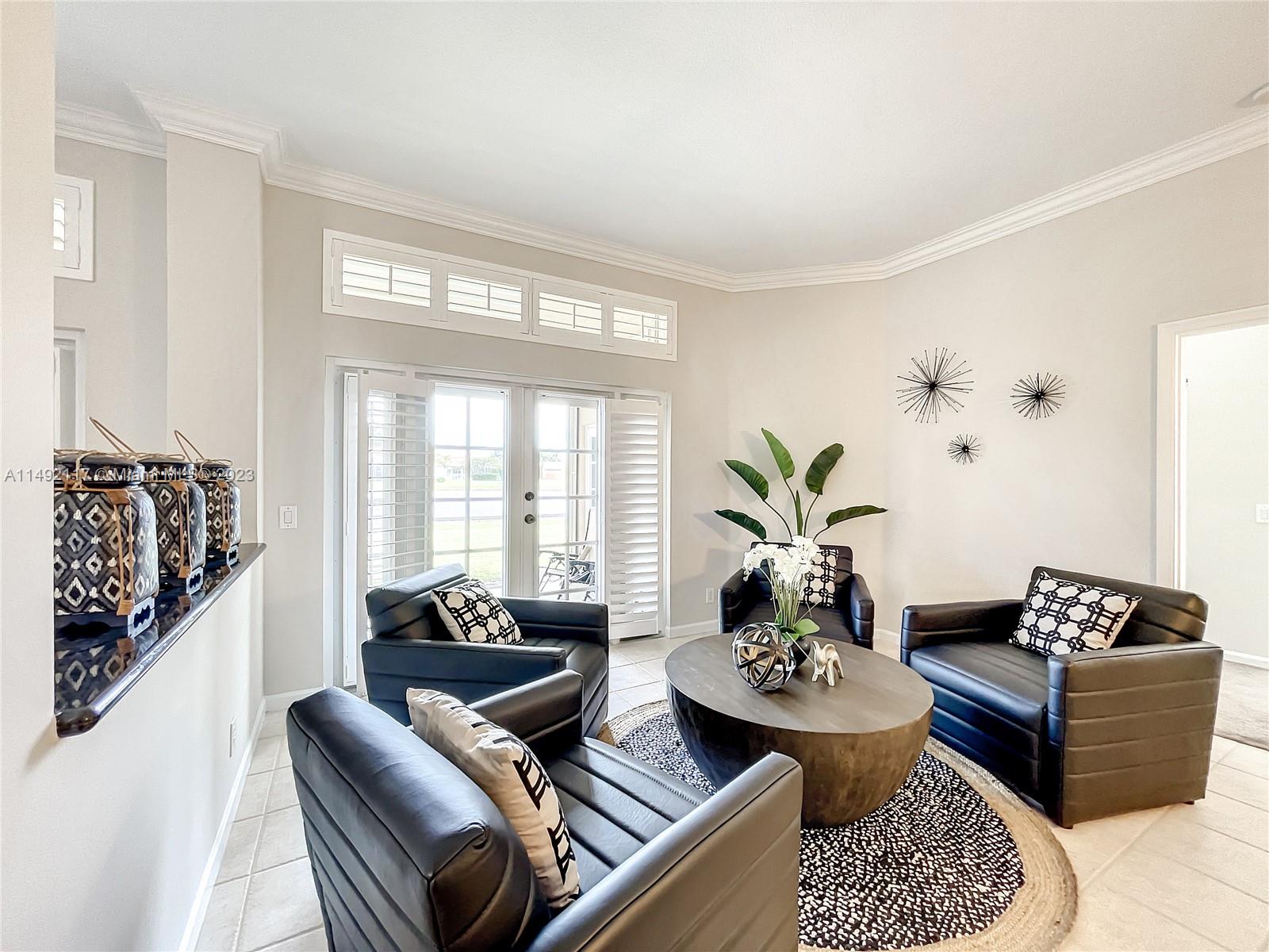 Don't miss this opportunity to live in this impeccably maintained, single story home, with an incredible water view, in the highly sought after neighborhood of Savanna. Relax in the evening on the screen enclosed patio watching the moonlight reflect off the water, or relax on the covered front porch with brick pavers and stone accents. The kitchen features custom wood cabinets, granite counter tops and stainless steel appliances. The primary bedroom has a water view and access to the patio. This home features French doors to the patio, plantation shutters throughout, a 4th bedroom which has been converted to an office, 2.5 bathrooms, a beautifully landscaped yard, accordion hurricane shutters and more. The community has a wonderful clubhouse, pool and play area. A+ schools, close to Hwy