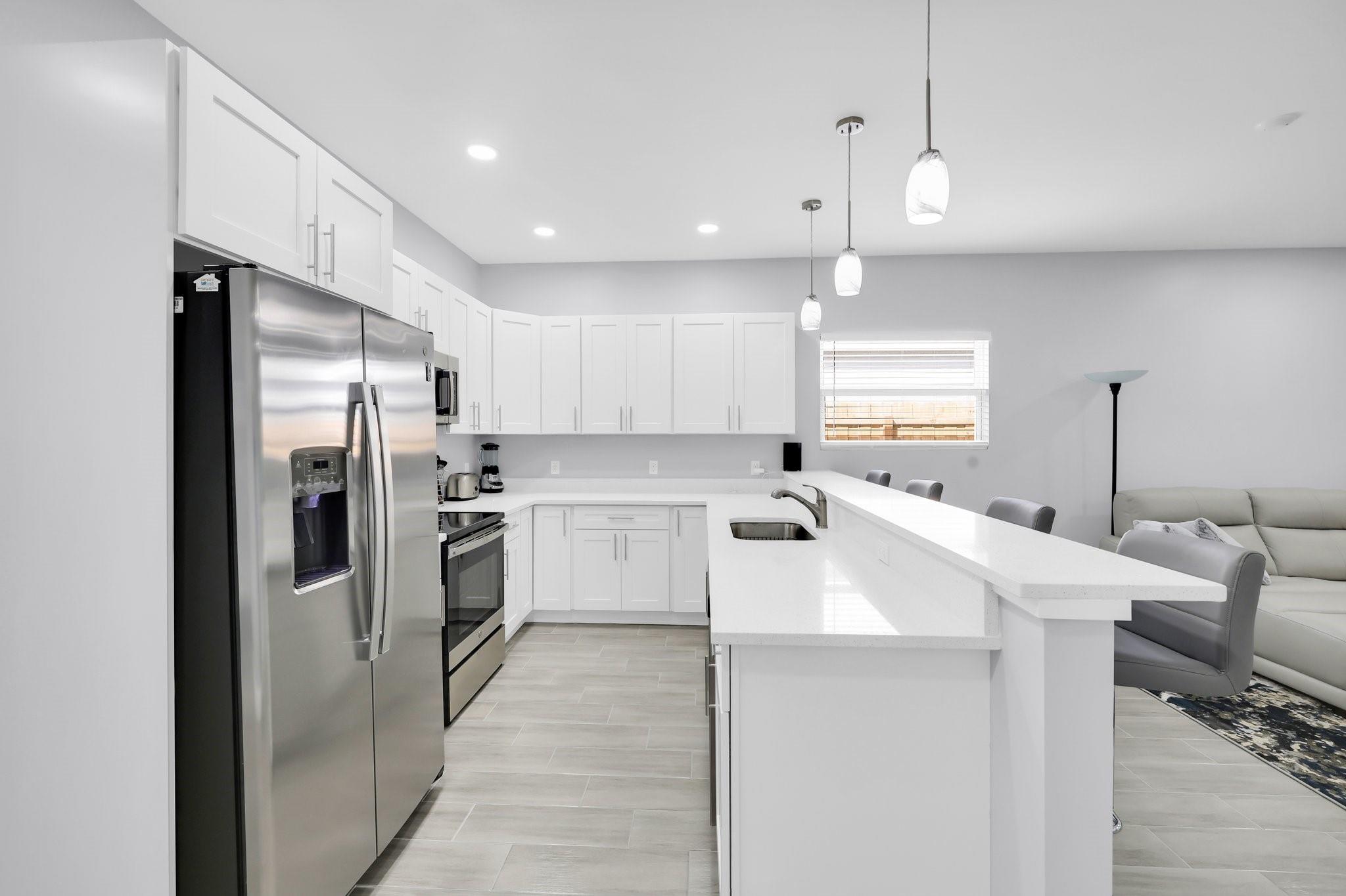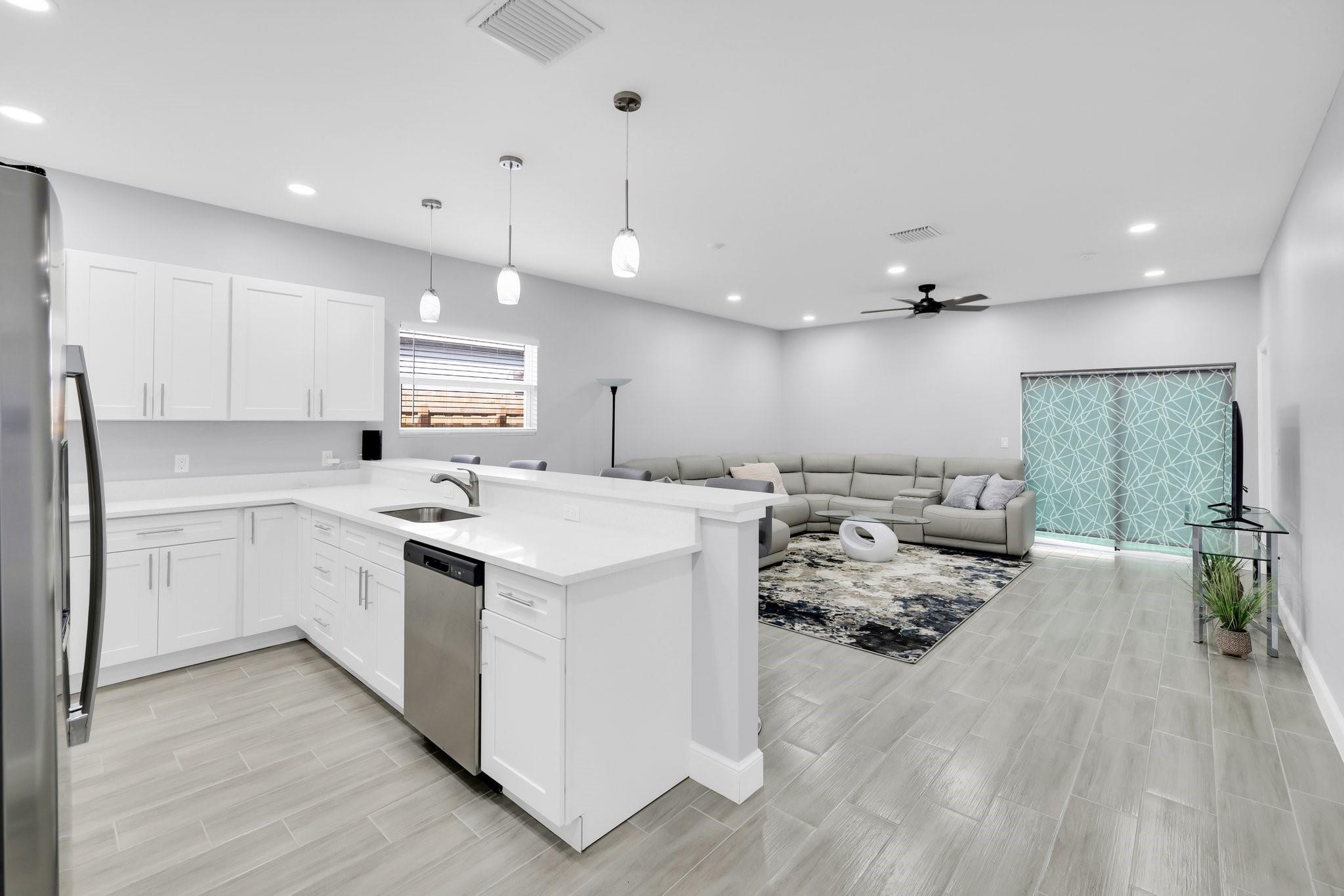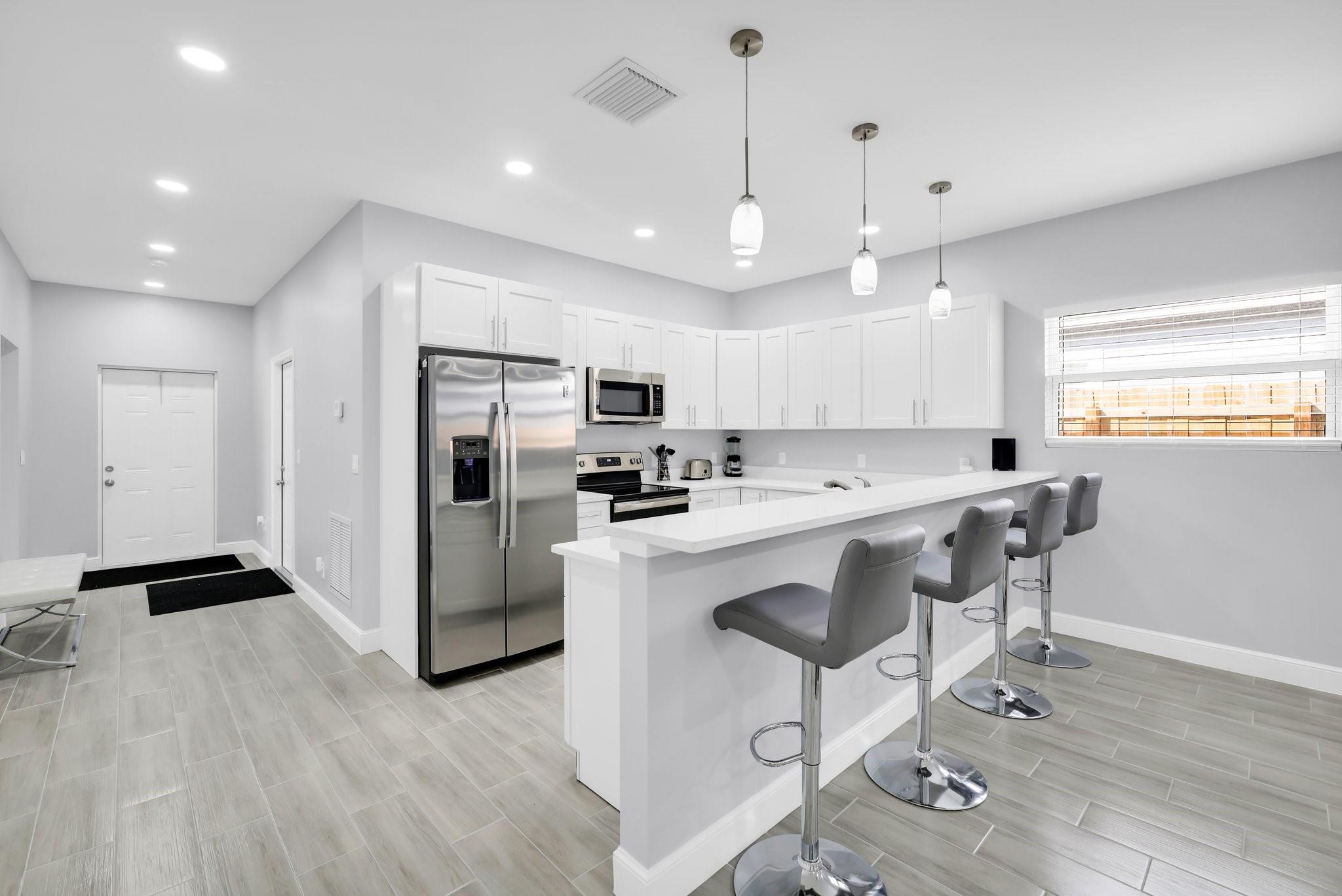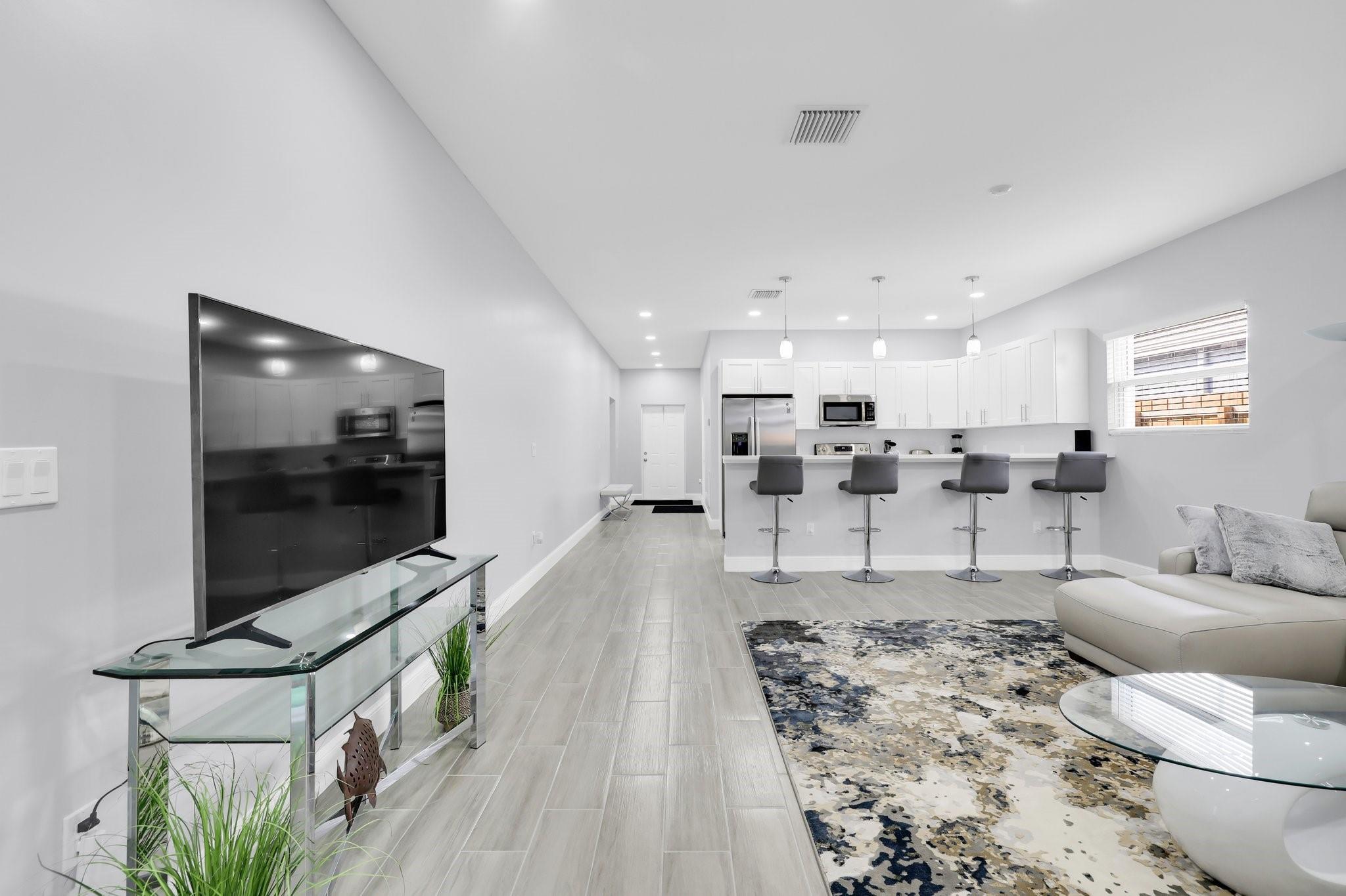 NEW CONSTRUCTION!! Beautiful 3 bedroom 2 bath home and 1 car garage with 9 foot volume ceilings.. Builders upgrades throughout. Features tile flooring throughout, custom all wood cabinets throughout, quartz counters, Architectural impact windows, upgrade lighting and plumbing fixtures, completely fenced yard, Paver driveway and much more. Excellent floorplan with split bedroom design, great room, beautiful kitchen w/stainless appliances, Kitchen ''bartop'' seating for at least 5, recessed lighting. Primary bedroom with private ensuite bathroom and walk in closet with built in cabinetry. Close to Beaches, shopping and restaurant's. Home is located in an Opportunity Zone as well for additional tax benefits.