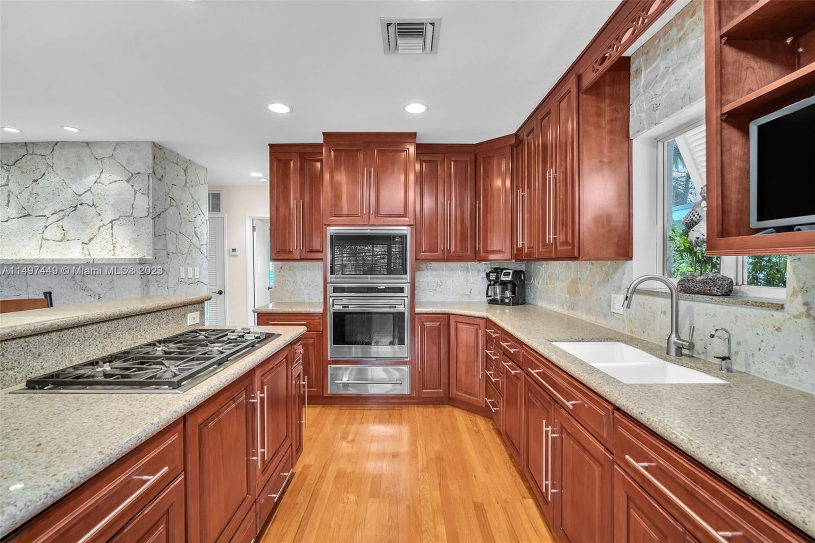 A truly remarkable residence in the heart of Hollywood Lakes. This two-story pool home, with 3 beds, 2 baths, and a 1-car garage, sits on a deep lot, extending to the prestigious north South Lake Drive. Has a unique open floor plan with red oak floors leading you to an open kitchen. Kitchen features are endless with an open island, granite countertops, a Subzero fridge, a Wolf stove top, a wall oven with a built-in microwave, and a warming door. This home offers flexible living space with 2 beds/1 bath downstairs and 1/1 upstairs. A gas fireplace with coral tile adds charm to the living room. The A/C was replaced in 2018 and the home has a connection for a portable generator that will be included.200 amp electrical with a surge protector, and shutter panels for all windows enhance comfort.