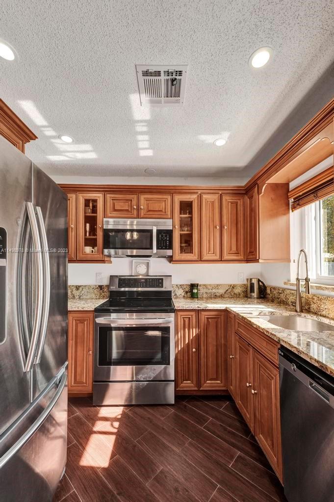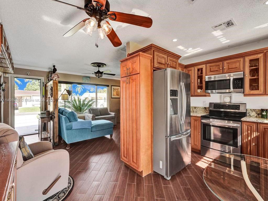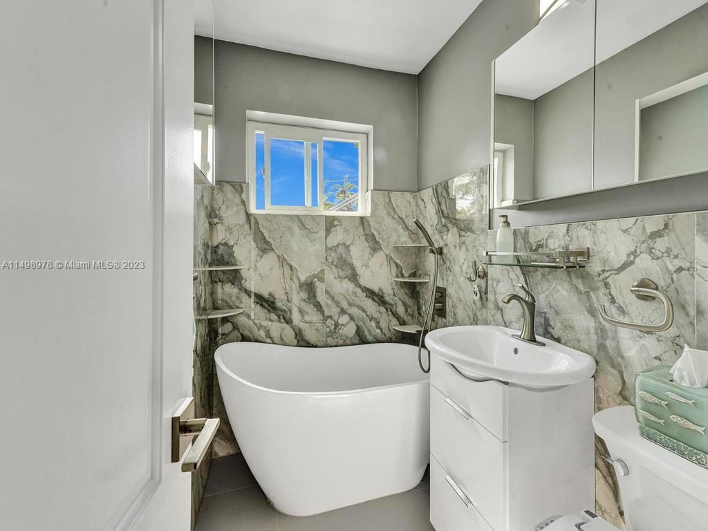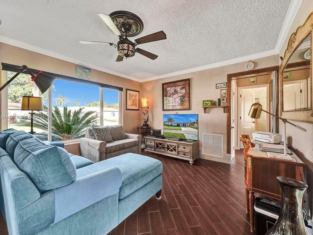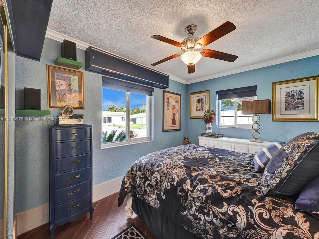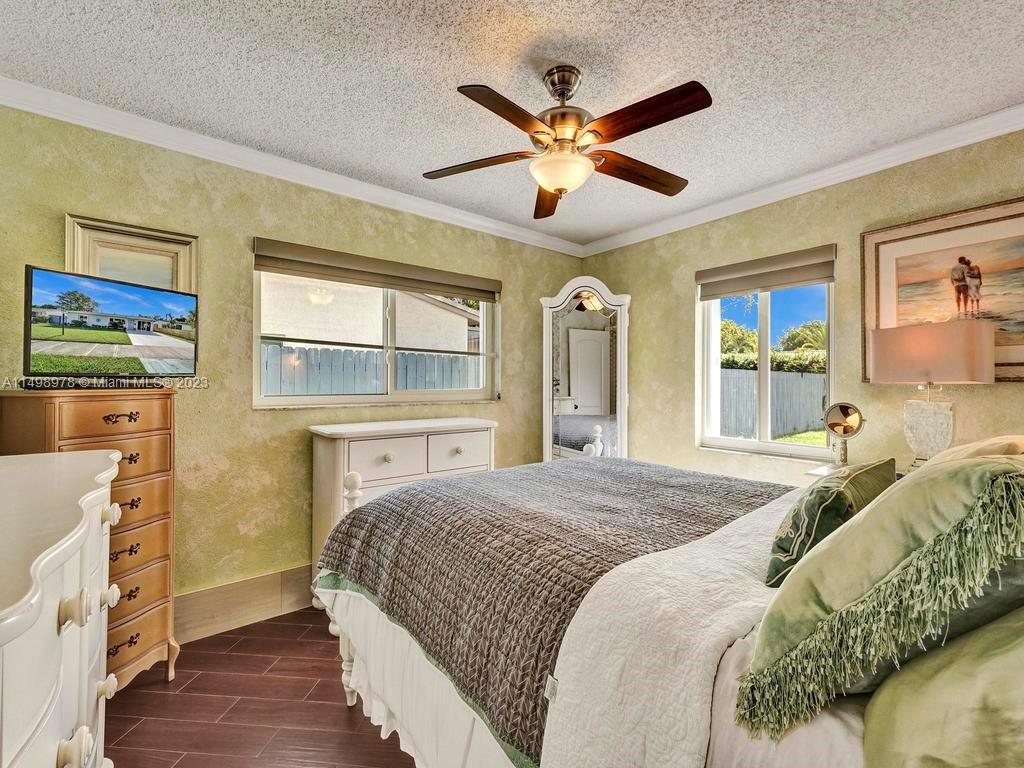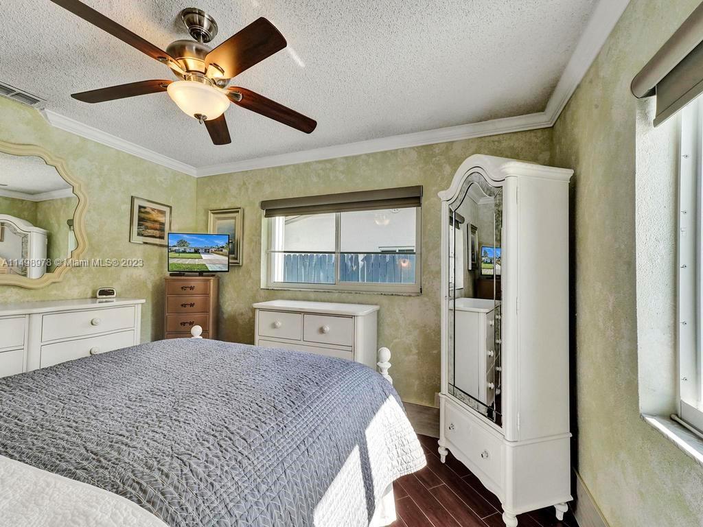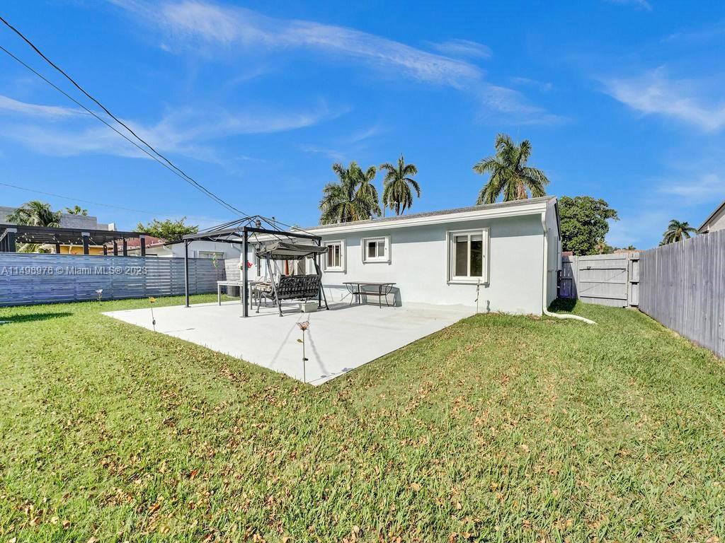 Beautiful home in desireable NE Hallandale Beach. 2 bed/2 full baths, all tile floors, crown molding, full impact windows & doors, screen doors all around, new kitchen, wood cabinets, granite tops, pantry, SS appliances & a window over the sink. Dining/family room has 2 walls of impact sliding doors, brings lot's of natural light & nice breezes! Main bath brand new! Walk in closets with lighting. Modern window blinds, 5 ceiling fans. Large fenced yard, room for a pool, huge 29X22 patio with pergola (cover not shown in photos), 2 sheds, one 10X13 has air conditioning! Roof 7yrs old. Double wide driveway. Quiet neighborhood, friendly neighbors. Easy walk to shopping, dining, downtown Hollywood, Gulfstream Racing. Close to golf, tennis and Hollywood Broadwalk. Aventura mall 2 miles away.